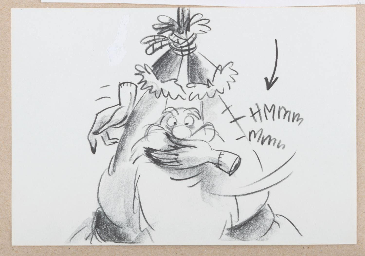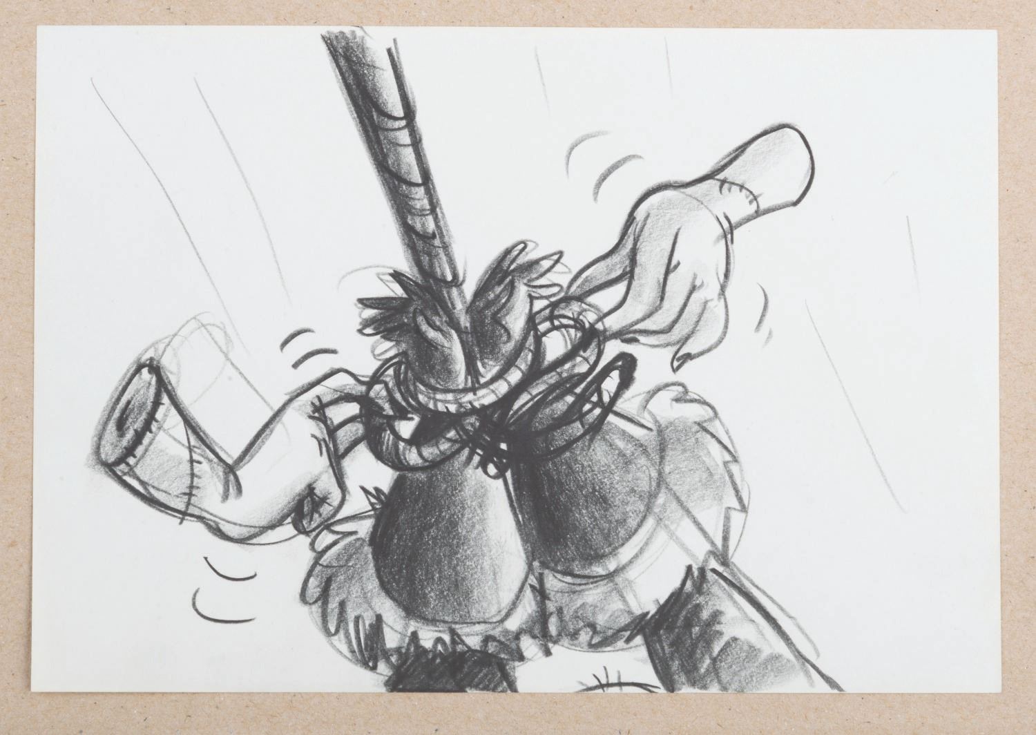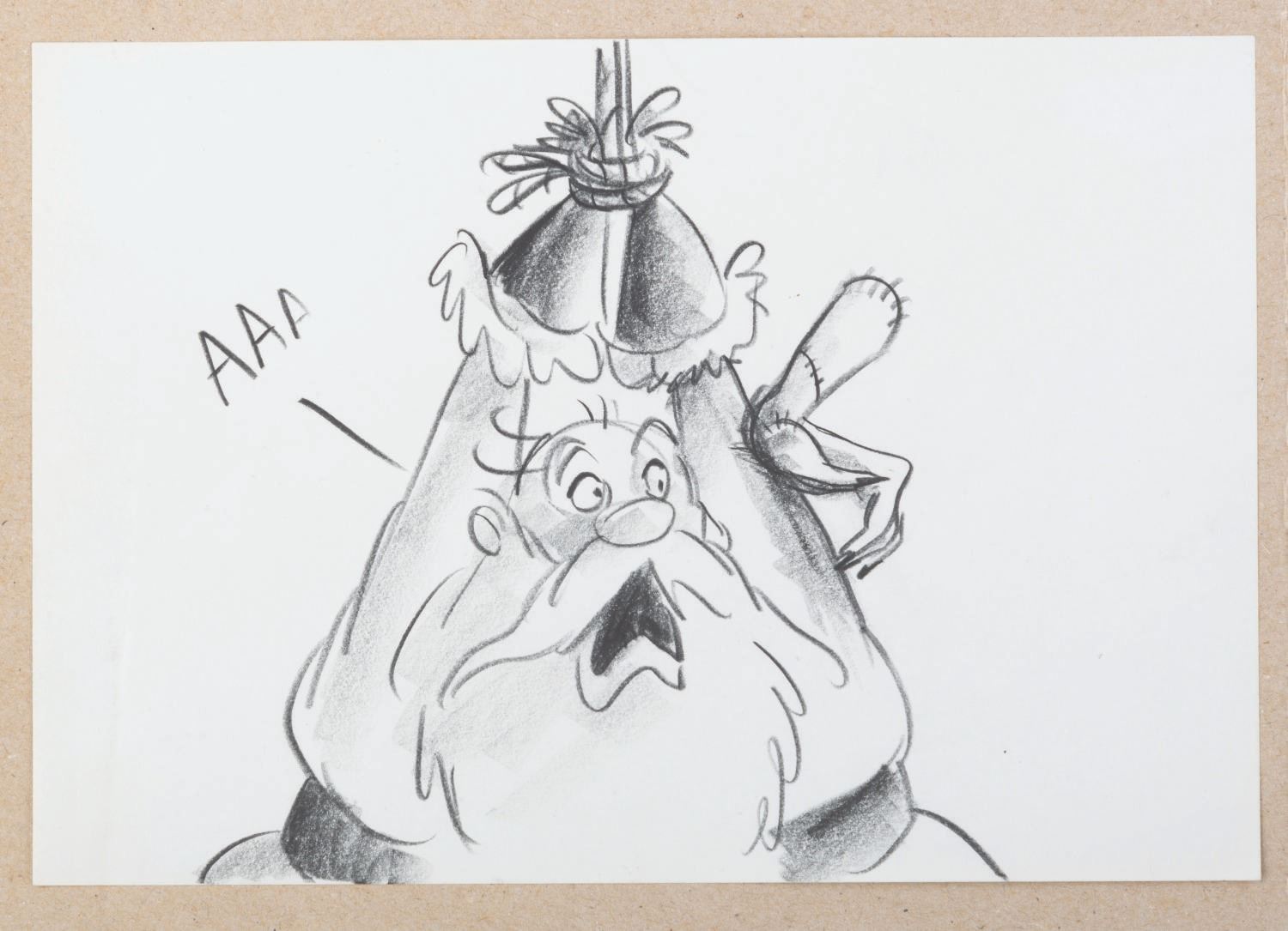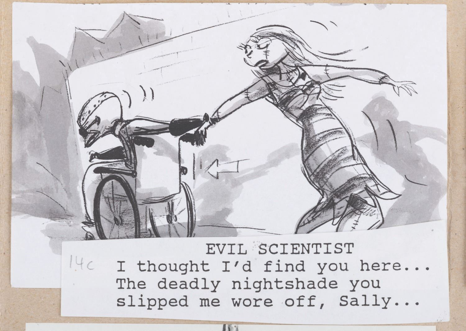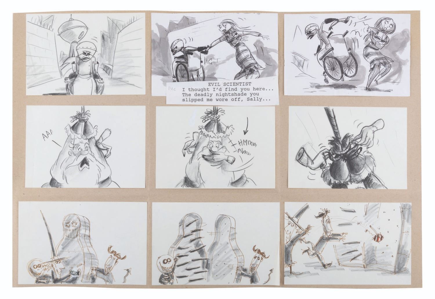 (Touchstone, 1993) A collection of seven original storyboard panels and two photocopy panels from “The Nightmare Before Christmas.” Accomplished in ink and graphite by artist Jorgen Klubien, the drawings feature Sally and Dr. Finkelstein, Sally’s hands untying Santa Claus, and Lock, Shock, and Barrel being mischievous. Ranging in size from 5.5” x 8” to 5.5” x 8.5”, the panels are adhered to 18.5” x 27.25” thick paper for presentation. The artwork is in very good to fine condition with light warping, a crease at the lower right corner of one drawing, and folds on the backing paper, which do not affect the panels.