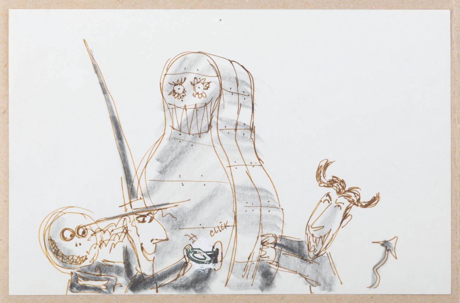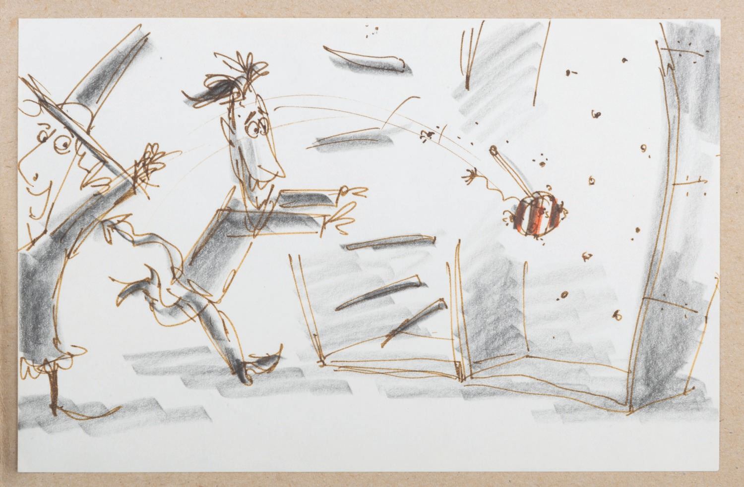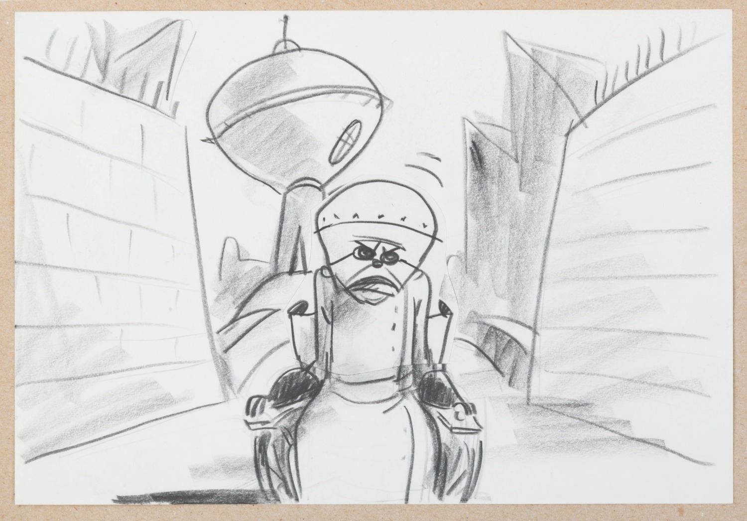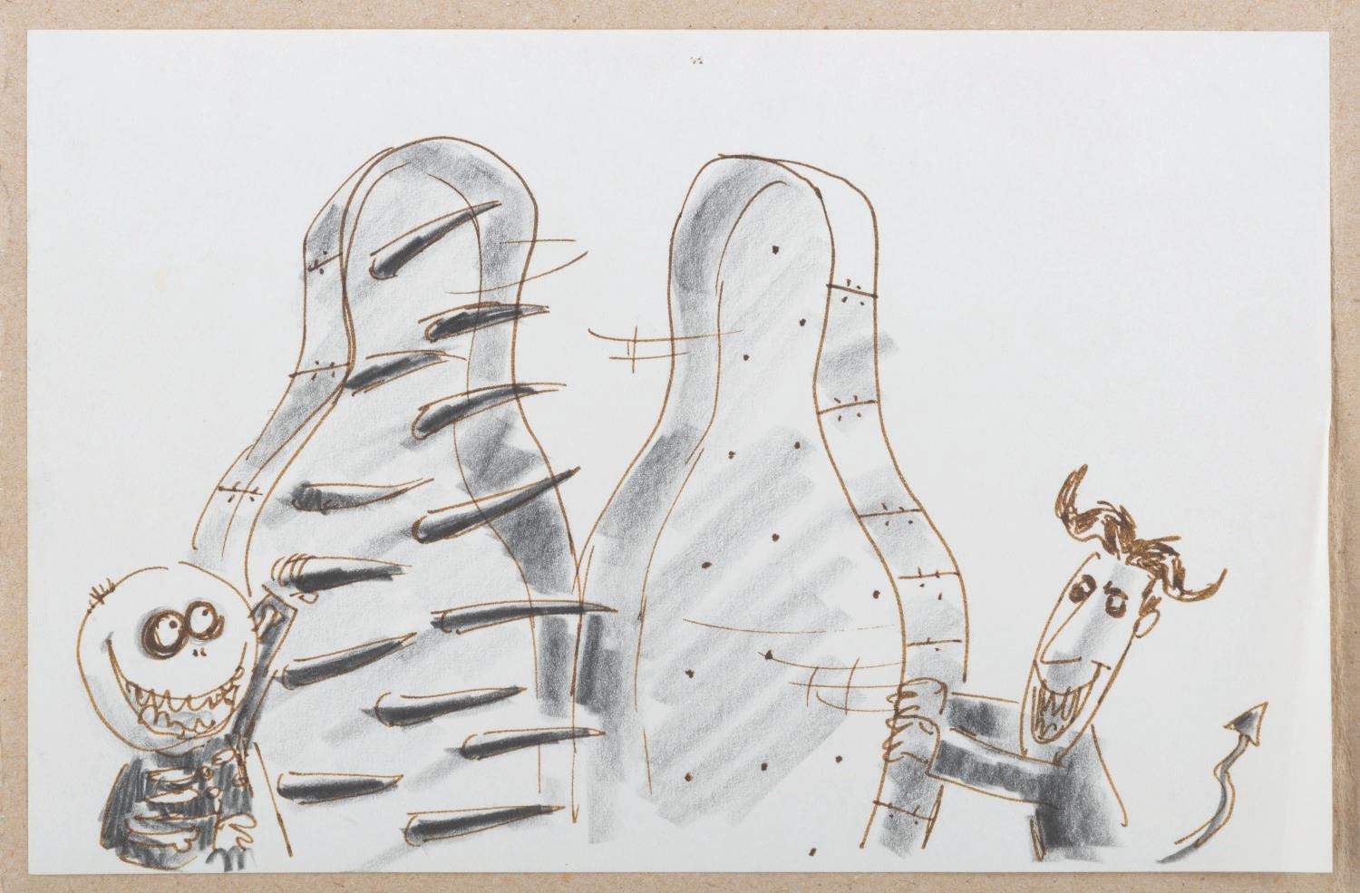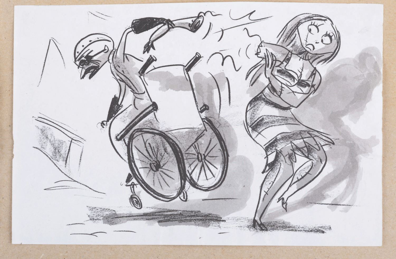 (Touchstone, 1993) A collection of seven original storyboard panels and two photocopy panels from “The Nightmare Before Christmas.” Accomplished in ink and graphite by artist Jorgen Klubien, the drawings feature Sally and Dr. Finkelstein, Sally’s hands untying Santa Claus, and Lock, Shock, and Barrel being mischievous. Ranging in size from 5.5” x 8” to 5.5” x 8.5”, the panels are adhered to 18.5” x 27.25” thick paper for presentation. The artwork is in very good to fine condition with light warping, a crease at the lower right corner of one drawing, and folds on the backing paper, which do not affect the panels.