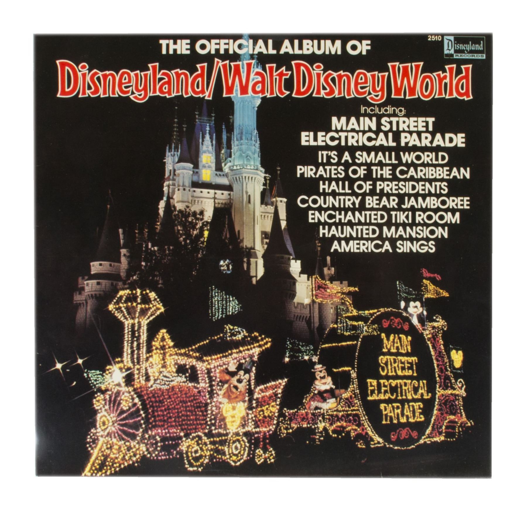 (Disneyland, 1980) A souvenir record titled "The Official Album of Disneyland / Walt Disney World" featuring a great cover photo of the Main Street Electrical Parade. This record includes songs from popular attractions such as "Country Bear Jamboree", "Pirates of the Caribbean", "Enchanted Tiki Room", "America Sings", and "Haunted Mansion". Measuring approximately 12.5"x12.5" in its original album cover, the record is in very good condition with minor wear.
