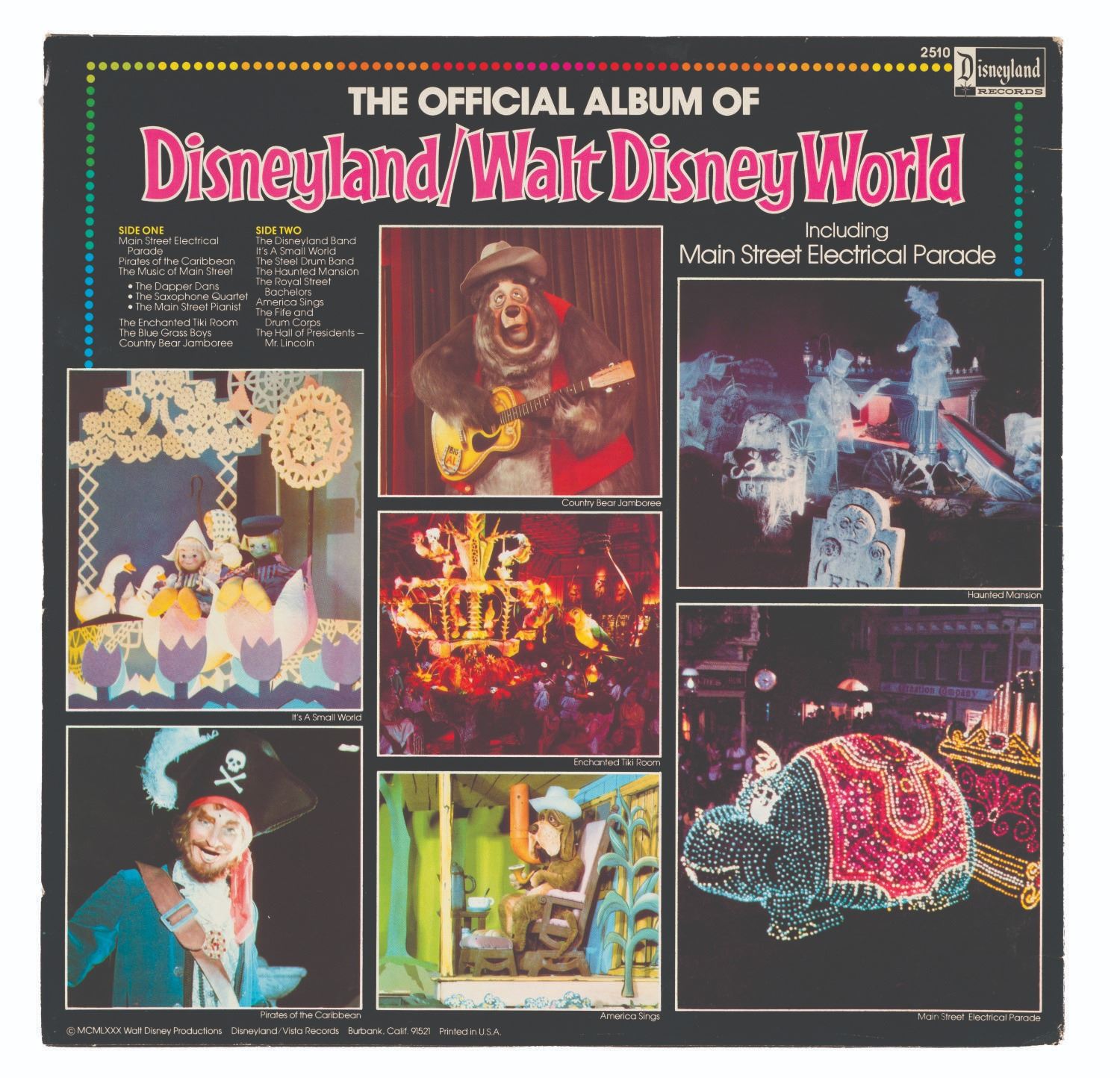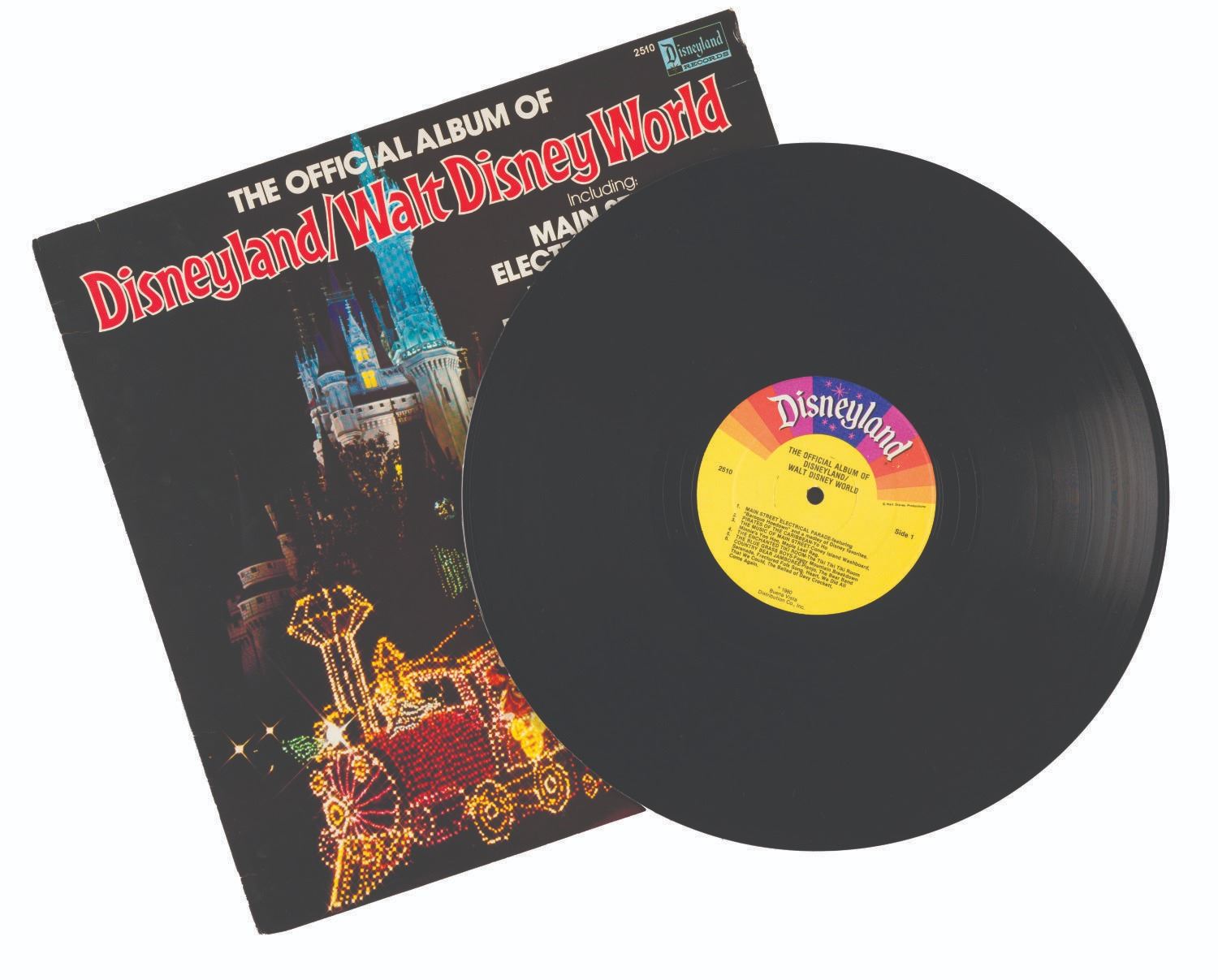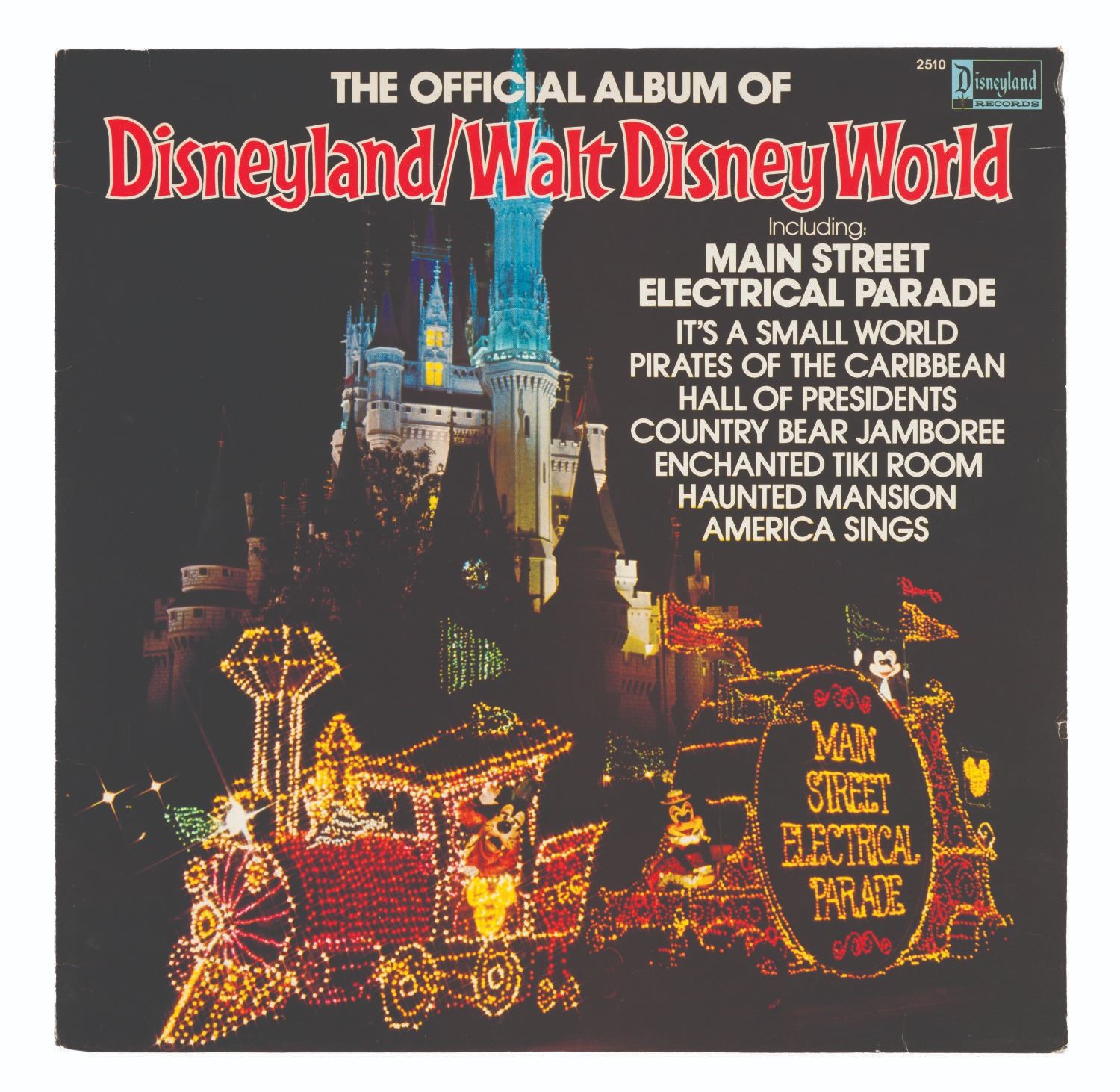 (Disneyland/Walt Disney World, 1980) "The Official Album of Disneyland/Walt Disney World" 33 ⅓ RPM record. This recording includes The Main Street Electrical Parade, The Blue Grass Boys, The Royal Street Bachelors, and Fife and Drum Corps, and soundtracks from attractions. Measuring 12", the record is in very good condition with light wear. The 12.5"x12.5" cover is in good condition exhibiting wear.