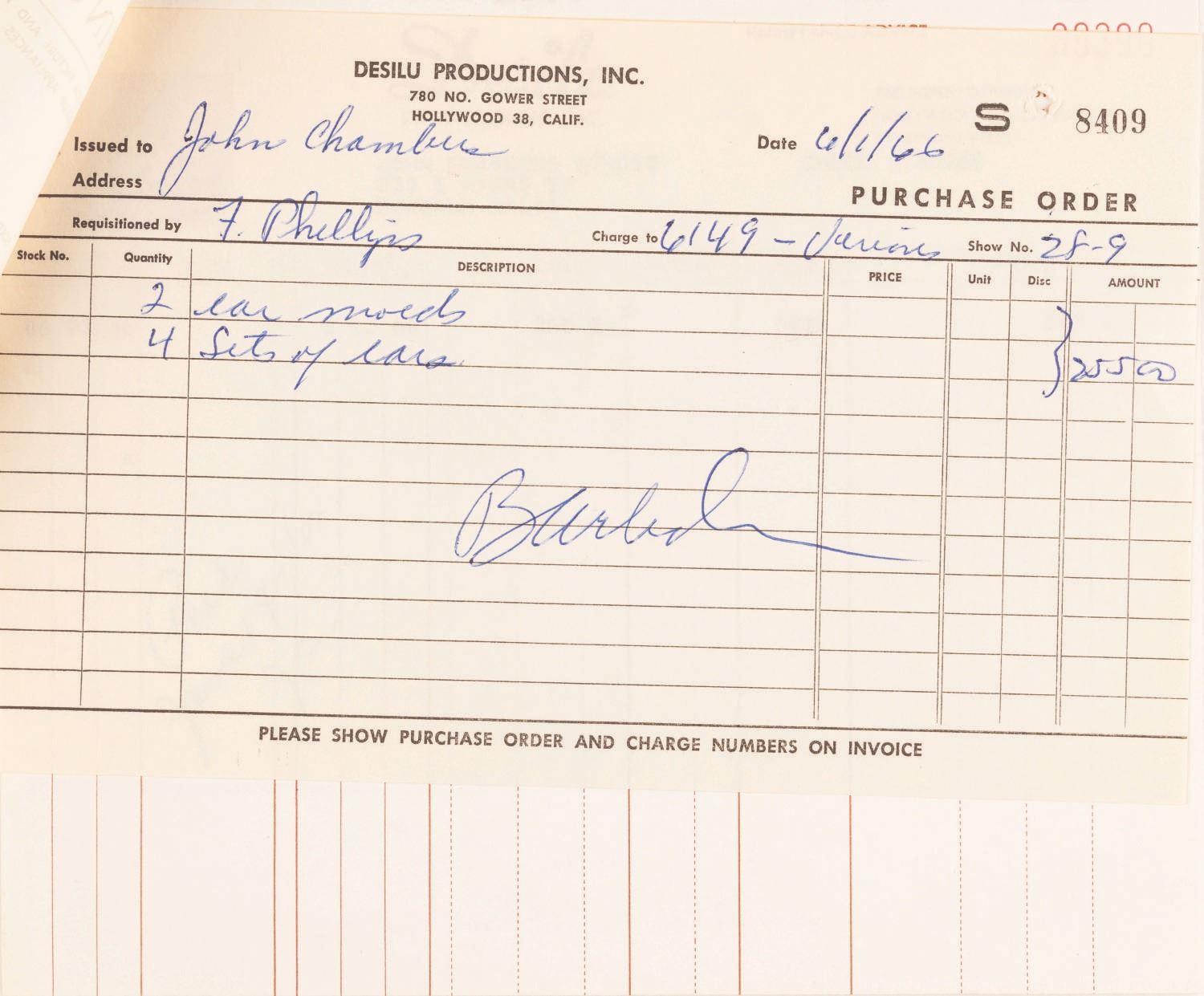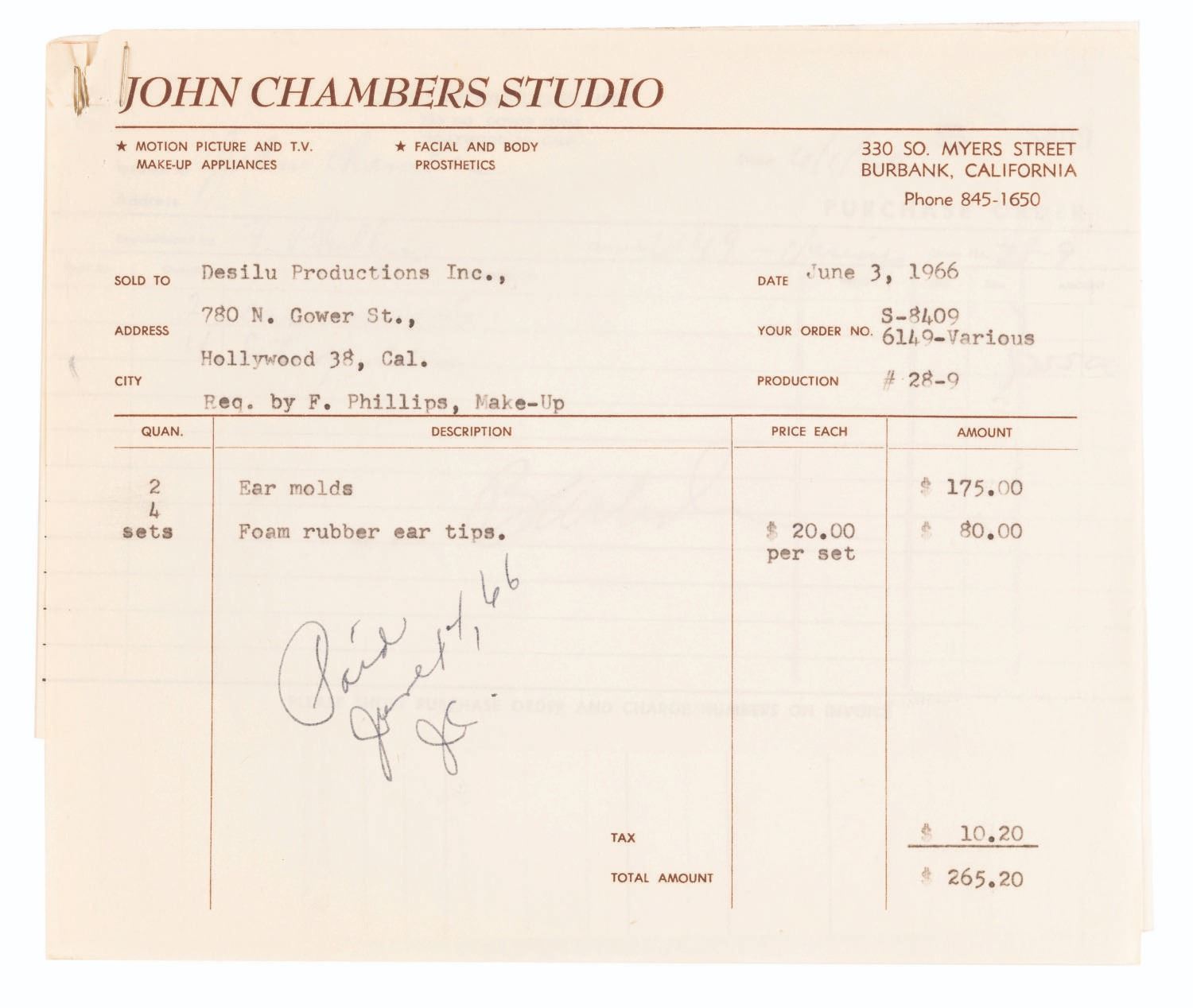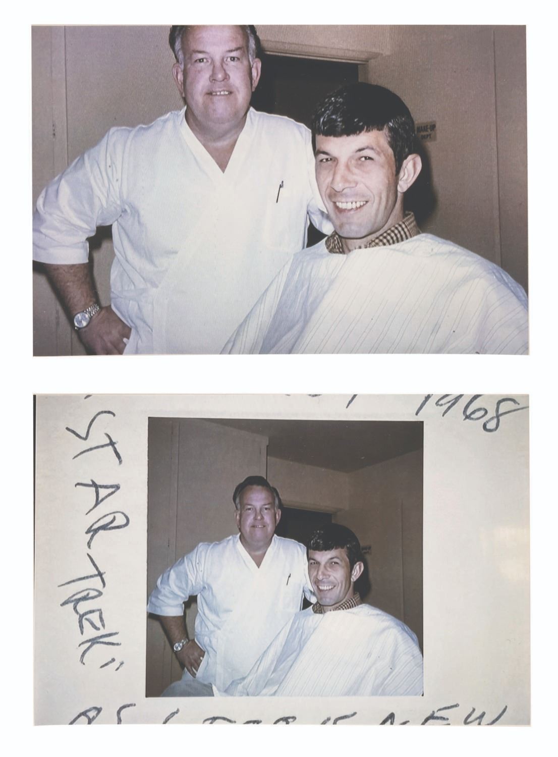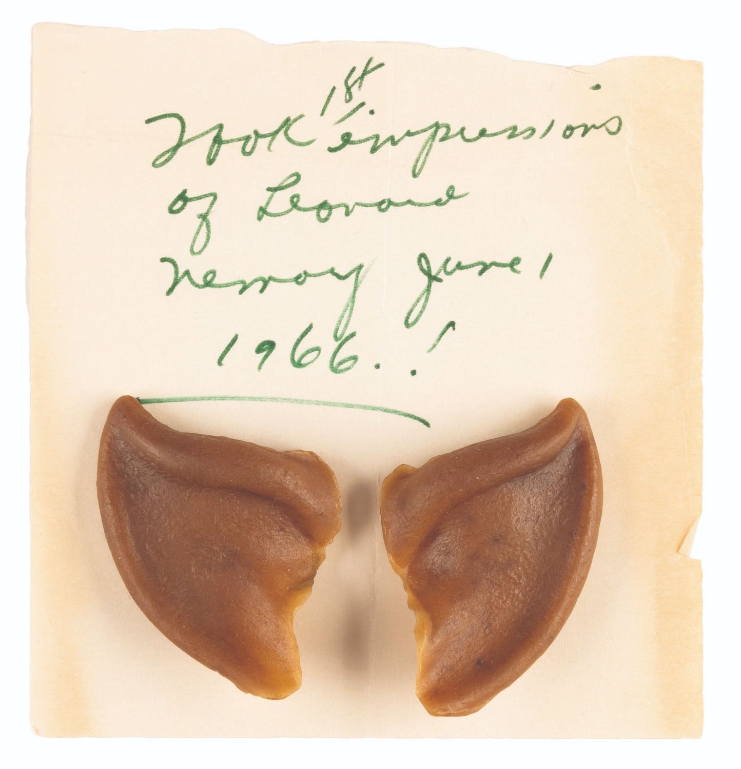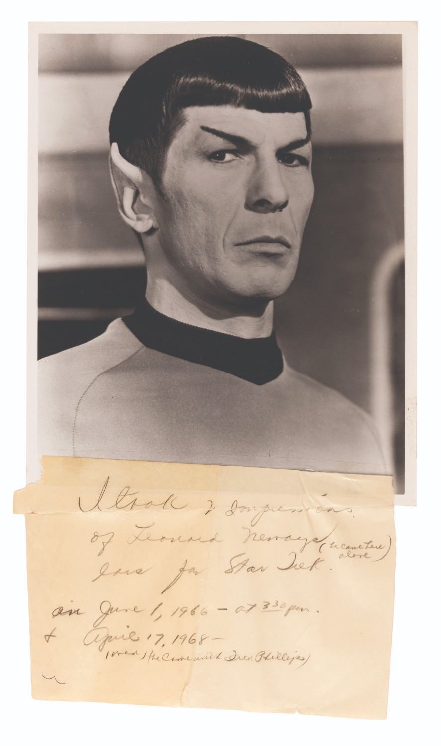 (Desilu, 1966) The original hand-sculpted forms for the pointed ears of Spock on the original series of “Star Trek.” As the second pilot for “Star Trek” was readying for production, Mr. Spock’s pointed ears looked “pretty bad” according to actor Leonard Nimoy. The company that was contracted by Desilu to provide all the effects for the show was not up to the delicate work of creating realistic make-up appliances, and using another company would incur great expense. The network was pressuring Producer Gene Roddenberry to tone down or even eliminate Spock, but Roddenberry insisted Spock’s “otherworldly-ness” was crucial to the series. The head of make-up Fred Phillips, without consulting the Studio, took Nimoy to John Chambers lab to cast the first ever of what would become very famous Vulcan ear tips. Leonard Nimoy first met John Chambers on April 17, 1966 when Chambers used the existing “defective” ear molds to create prosthetics using his own techniques. The pointed ears passed approval, and Nimoy returned on June 1st to have his ears cast to make the perfect fit foam appliances that would be used through all three seasons of the Original Series. John Chambers sculpted the ears in dental wax, a material he was familiar with since working as a dental technician in World War II. The wax is designed to soften at body temperature to shape, and these fragile artifacts have been carefully preserved in a safe for decades. The lot includes the John Chambers Studio invoice for the June 1st ear molds and first set of new tips, and the Desilu Studios paperwork to match. Also included are two handwritten notes and an envelope with notation by John Chambers detailing those early sessions with Nimoy, and three photos including two prints of Chambers with Nimoy, and a 1974 Paramount Studios portrait photo of Spock with a caption attributing his ears to “John Chambers expertise.” The photos are in very good condition with the 8” x 10” publicity photo showing wear from handling, with Chambers’ note taped to the bottom. The invoice and paperwork measure 8” x 8” and are in very good condition with typical wear from age and handling. The delicate original ear tip sculpts each measure 2.5” long and have been expertly preserved, displaying in fine condition. This item requires special shipping arrangements, please inquire before bidding. Live long and prosper!