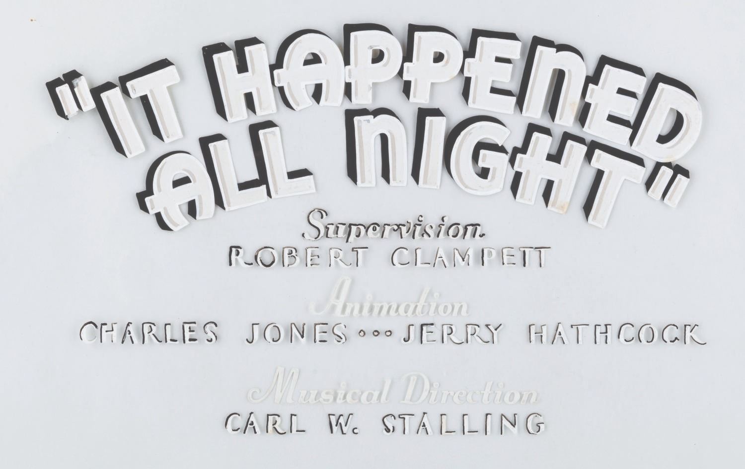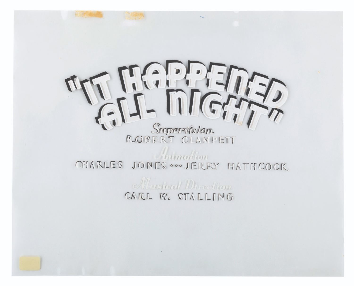 (Schlesinger, 1937) The original unused title cel for the Looney Tunes short "Porky's Badtime Story," initially titled "It Happened All Night." This title was a play on the 1934 film "It Happened One Night," but was considered too suggestive. Clampett was asked to come up with a new title, leaving this cel unused and unseen by the public. This rare cel is paired with a printed reproduction of the scene-matching background. Measuring 9.75” x 12.25”, the cel is in very good condition with two areas of tape residue along the top left edge measuring 0.5” and 1”, a 0.5” x 0.75 sticker on the reverse of the lower left side with “CE 34-5” written in graphite, a few small spots of paint loss, light discoloration, and warping from age.