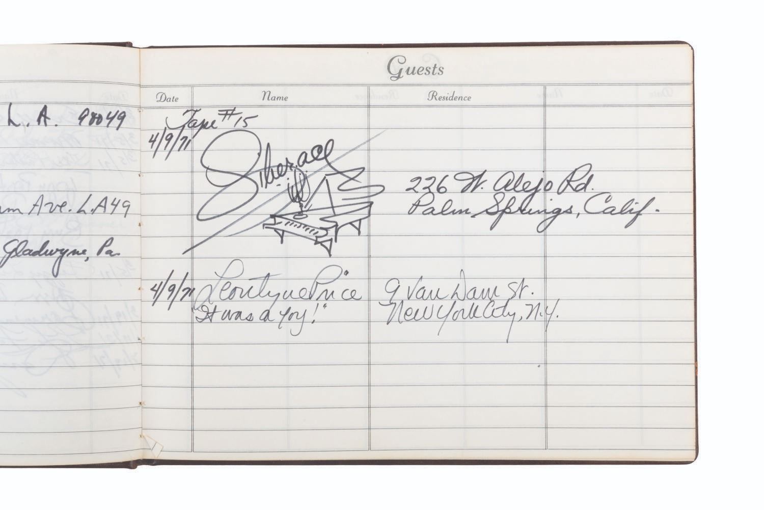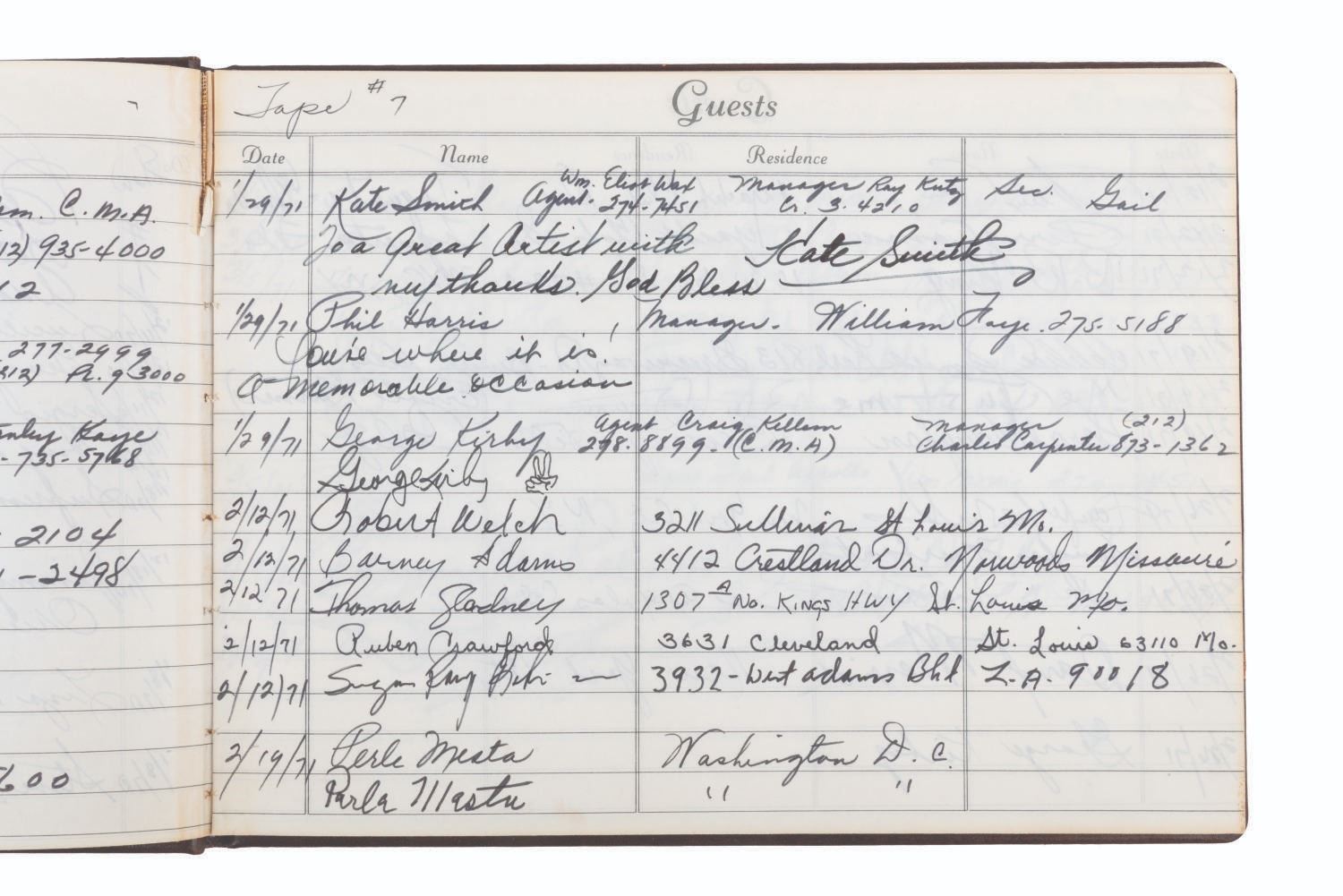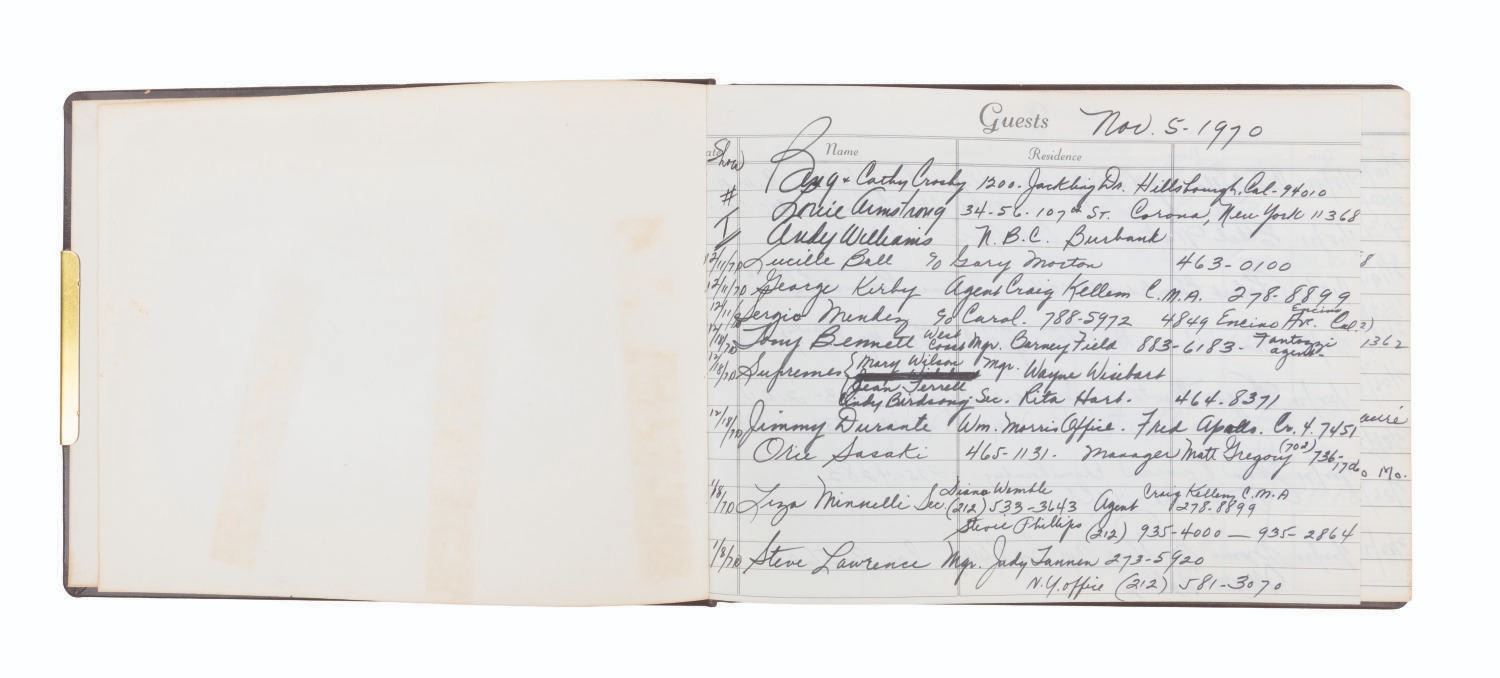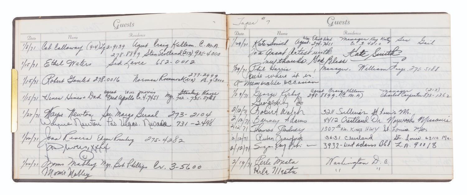 (ABC, 1970-71) The incredible multi-signed guest book from"The Pearl Bailey Show." The acclaimed singer had every guest on her show sign this book, a who's-who of the entertainment industry at the time. Signatures include those of Lucille Ball, Louie Armstrong, Bing Crosby, Liza Minnelli, B.B. King, Joan Rivers, Ike & Tina Turner, Ella Fitzgerald, Cab Calloway, Wayne Newton, Debbie Reynolds, Gregory Peck, and Liberace, who included an elaborate piano drawing. Bailey signed the book's first page, thanking her friends for coming on the show. Measuring 7.75" x 10.5", the book is in very good condition with tape residue, stains, discoloration from age, and wear with light separation at the spine.