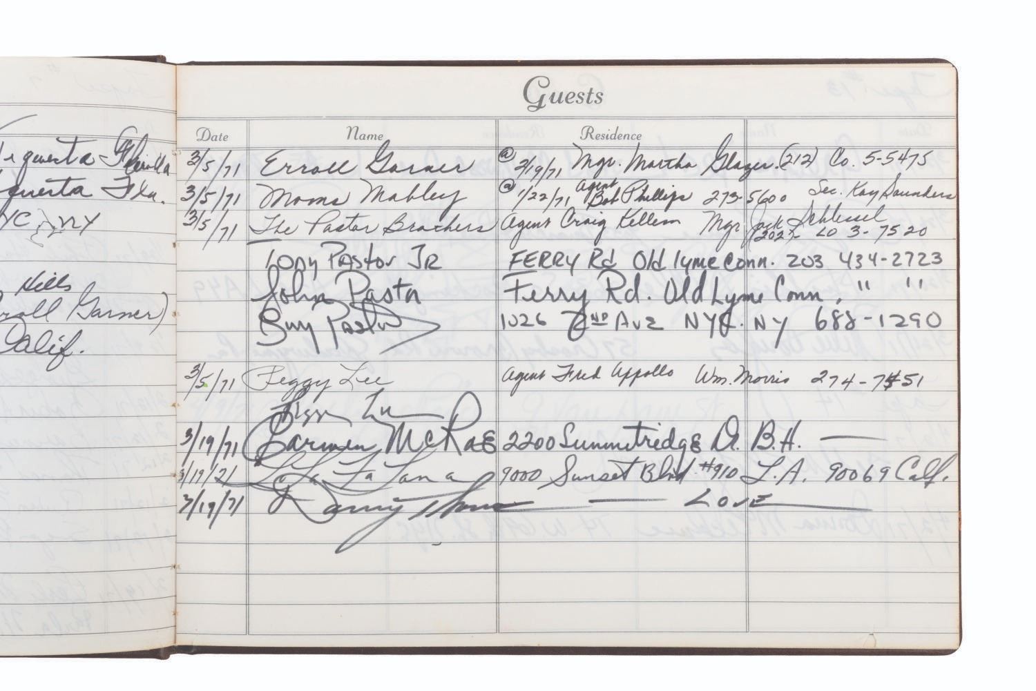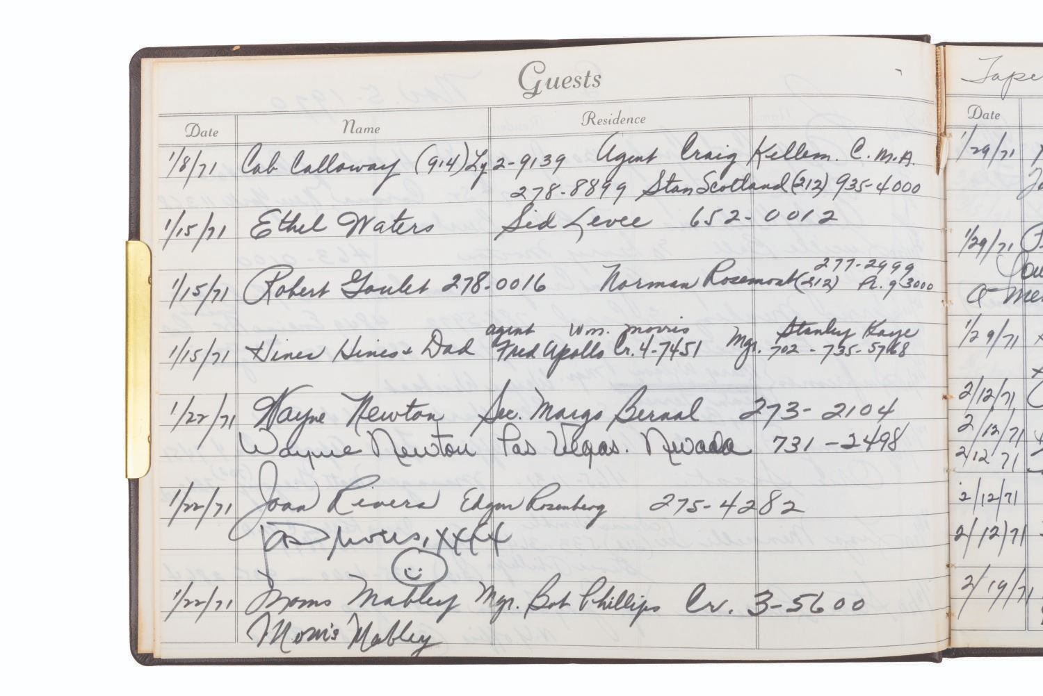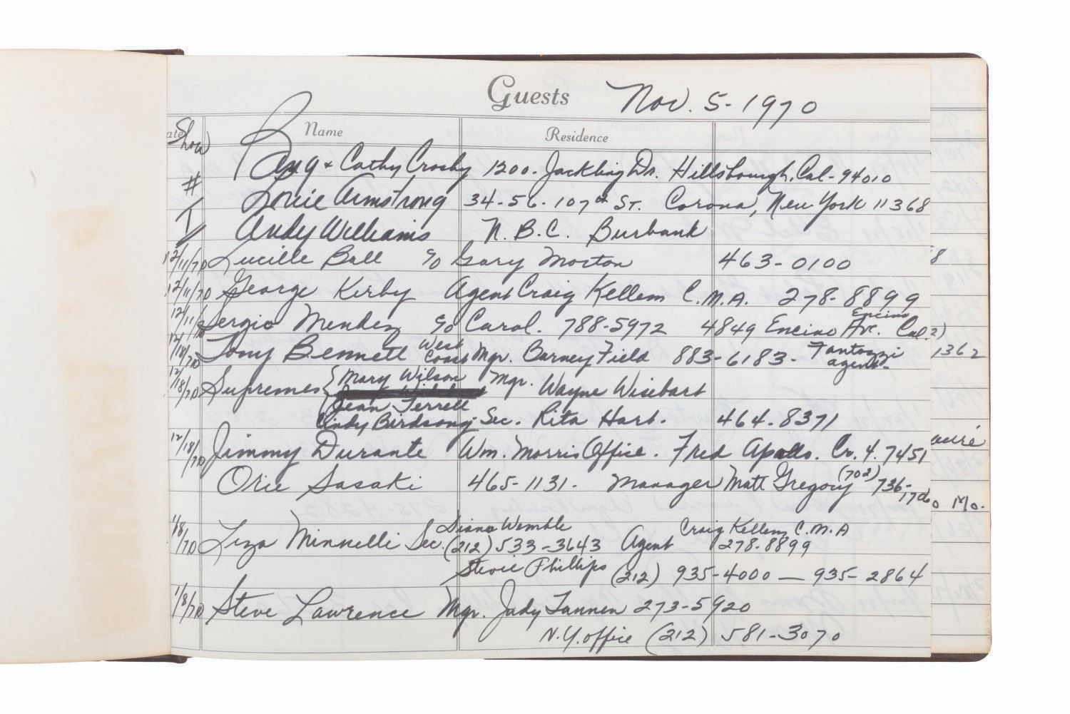 (ABC, 1970-71) The incredible multi-signed guest book from"The Pearl Bailey Show." The acclaimed singer had every guest on her show sign this book, a who's-who of the entertainment industry at the time. Signatures include those of Lucille Ball, Louie Armstrong, Bing Crosby, Liza Minnelli, B.B. King, Joan Rivers, Ike & Tina Turner, Ella Fitzgerald, Cab Calloway, Wayne Newton, Debbie Reynolds, Gregory Peck, and Liberace, who included an elaborate piano drawing. Bailey signed the book's first page, thanking her friends for coming on the show. Measuring 7.75" x 10.5", the book is in very good condition with tape residue, stains, discoloration from age, and wear with light separation at the spine.
