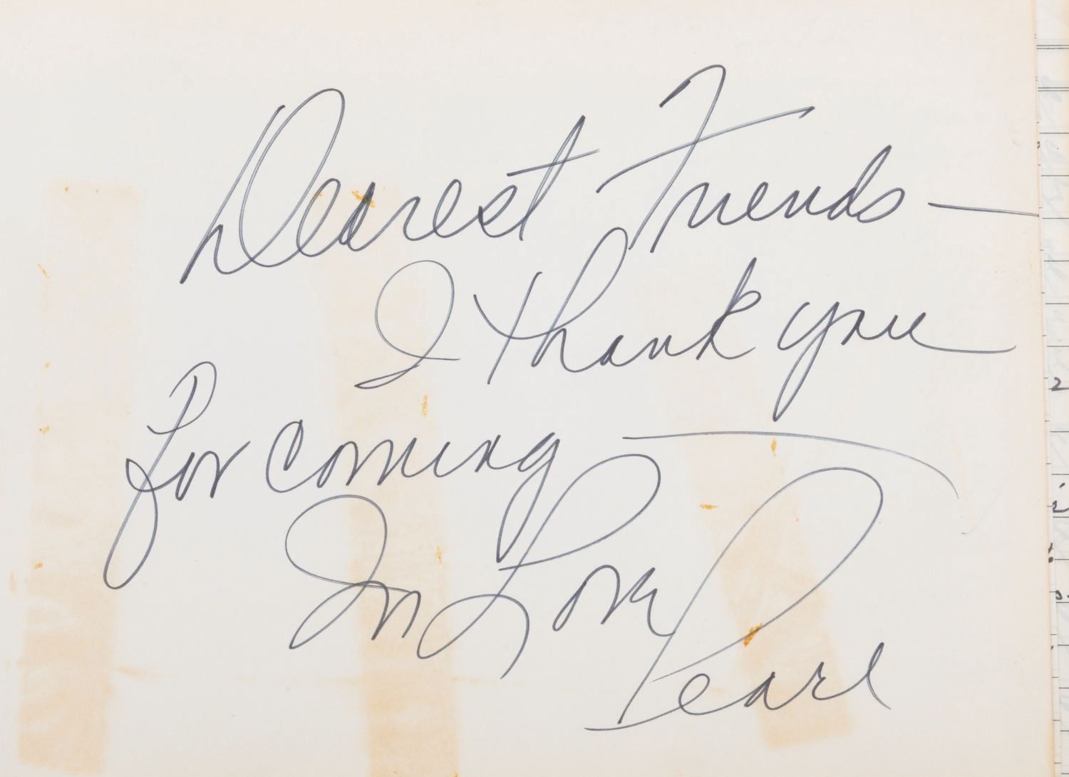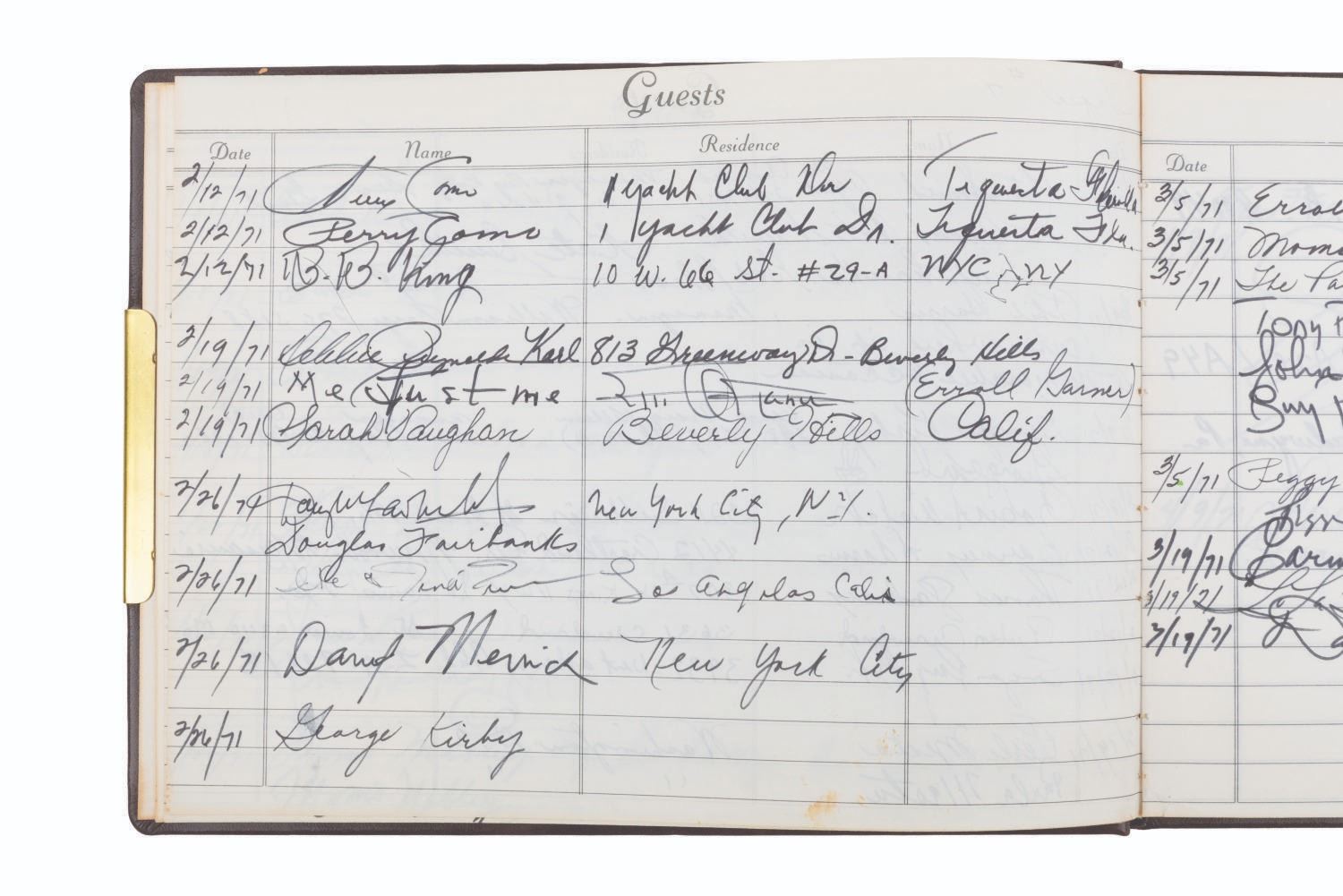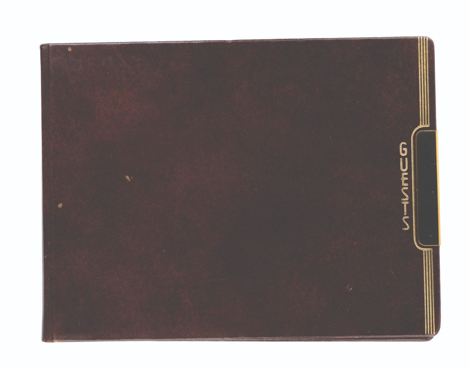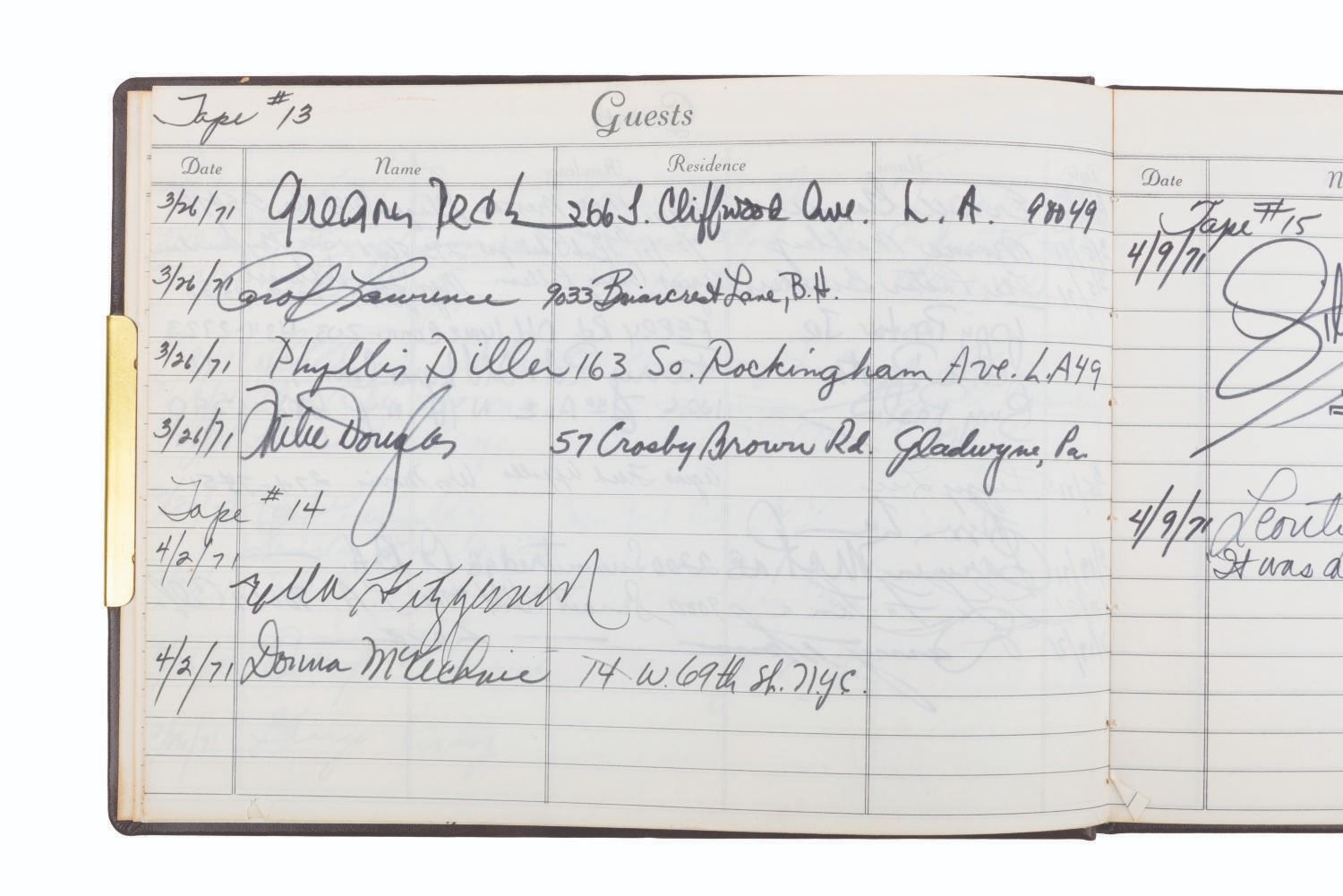 (ABC, 1970-71) The incredible multi-signed guest book from"The Pearl Bailey Show." The acclaimed singer had every guest on her show sign this book, a who's-who of the entertainment industry at the time. Signatures include those of Lucille Ball, Louie Armstrong, Bing Crosby, Liza Minnelli, B.B. King, Joan Rivers, Ike & Tina Turner, Ella Fitzgerald, Cab Calloway, Wayne Newton, Debbie Reynolds, Gregory Peck, and Liberace, who included an elaborate piano drawing. Bailey signed the book's first page, thanking her friends for coming on the show. Measuring 7.75" x 10.5", the book is in very good condition with tape residue, stains, discoloration from age, and wear with light separation at the spine.