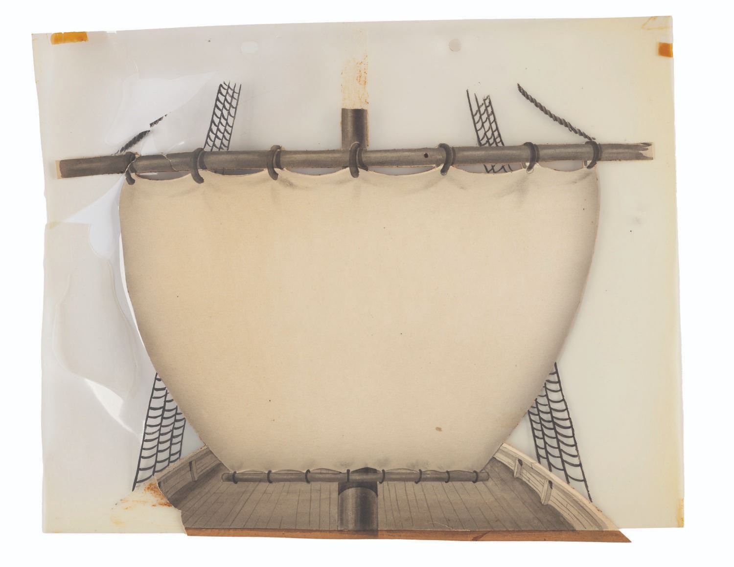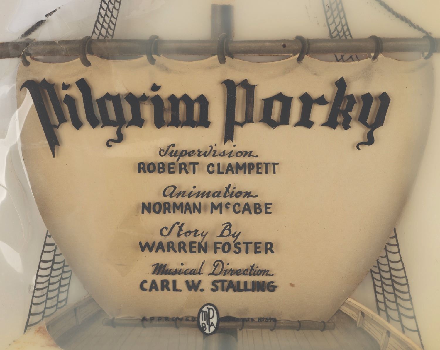 (Schlesinger, 1940) The original multi-layer hand-painted title cel for “Pilgrim Porky,” directed by Bob Clampett. With image sizes from 6” x 8.5” to 8” x 11.5” on a pair of 10” x 12.75” cels, the piece is in poor condition with heavy tears throughout, missing pieces, scratches, and wear.