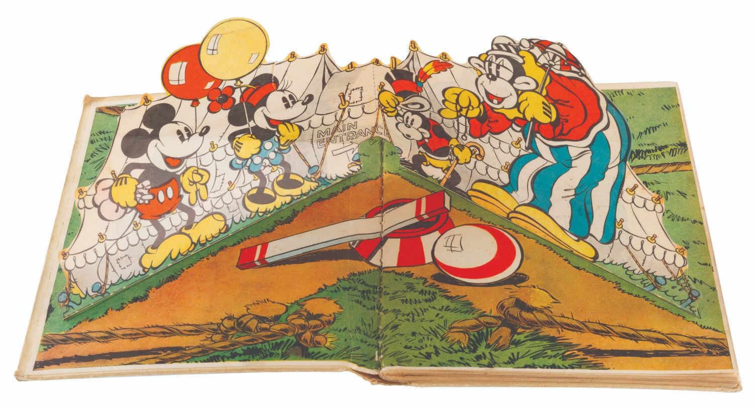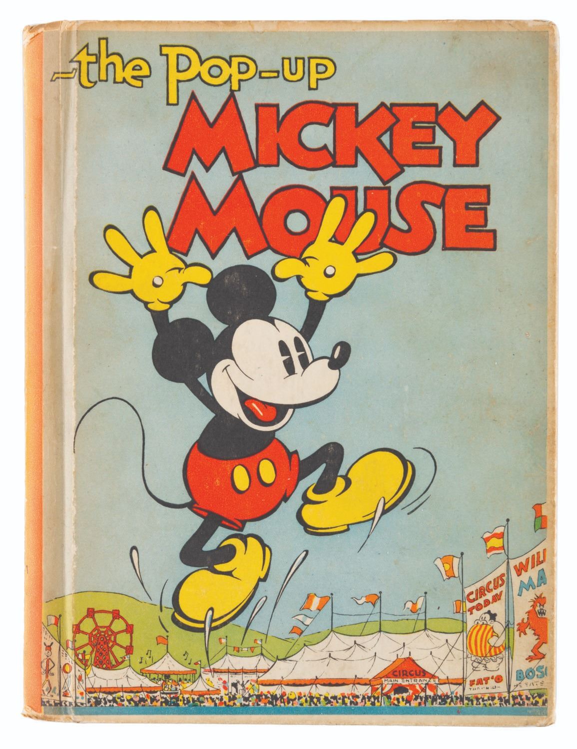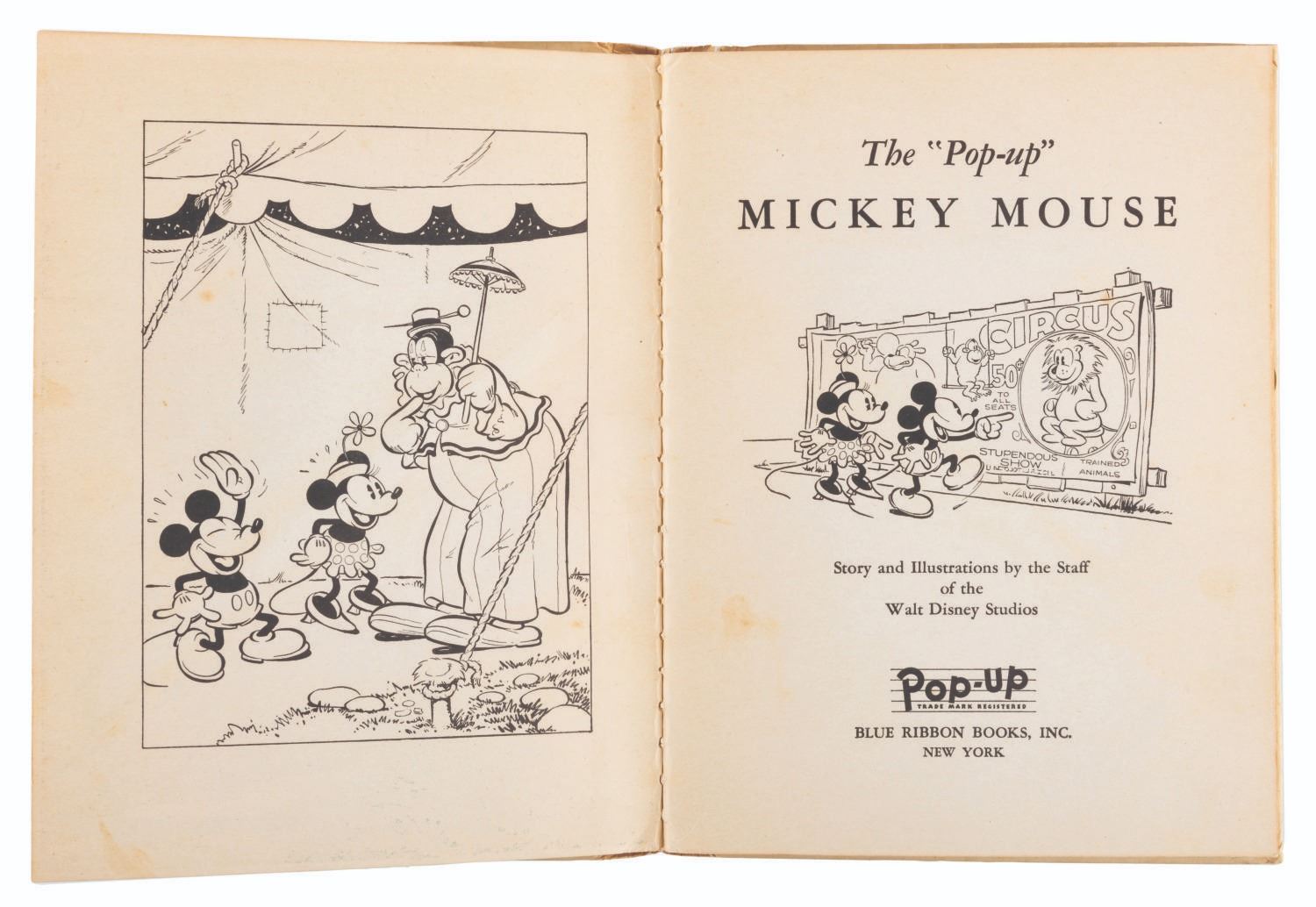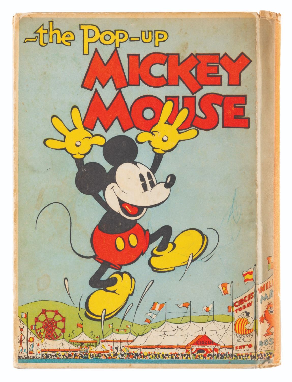 (Blue Ribbon Books, 1933) An original "The Pop-Up Mickey Mouse" hardcover book with black and white illustrations and three colorful pop-up scenes. Measuring 6.75” x 8.75”, the 27-page book displays in good condition with heavy wear, stains, discoloration from age, several blue marks on the back cover, and tears, including a tear separating the final pop-up and tape from a previous repair.