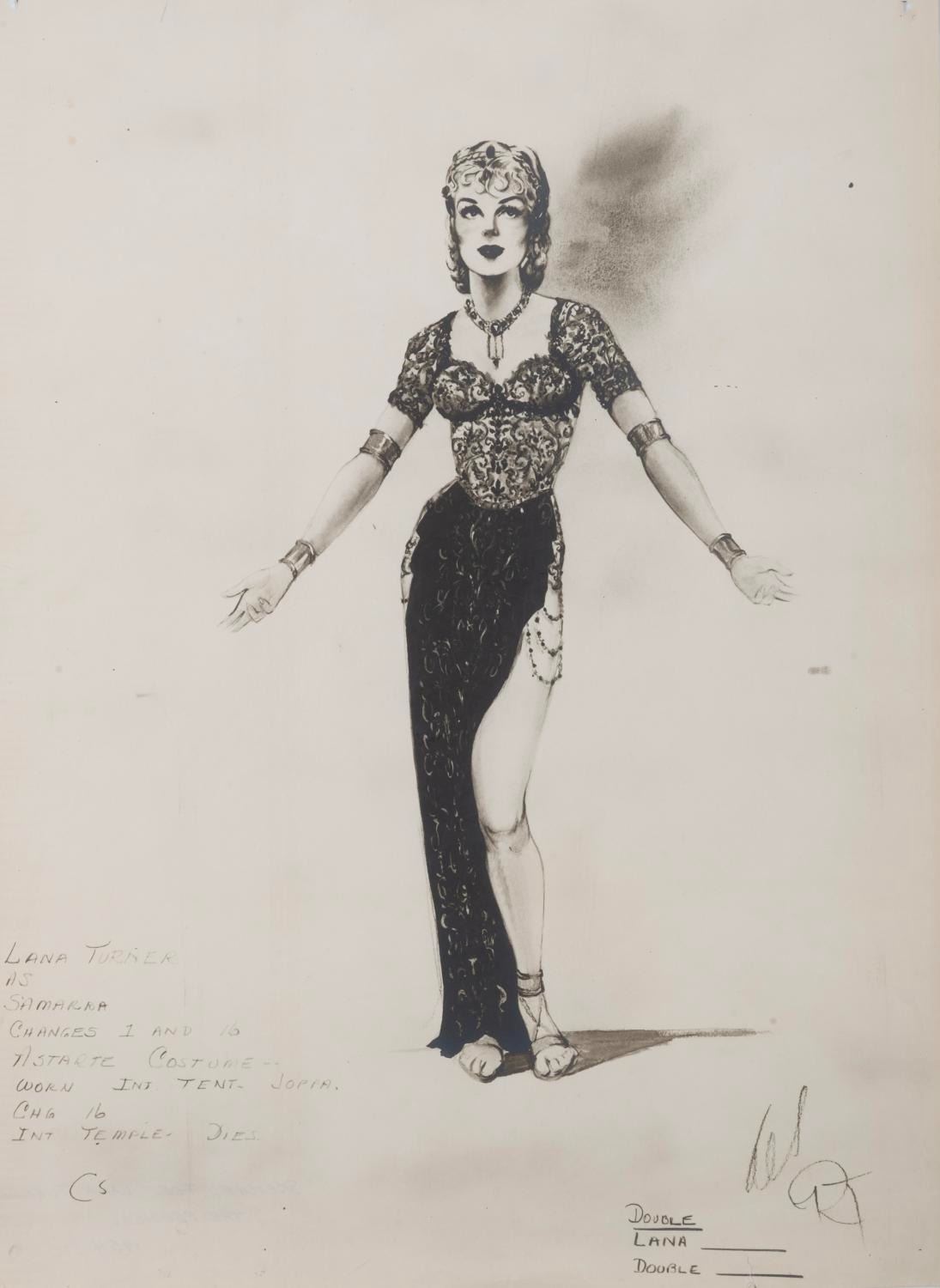 (MGM, 1954) A photostat copy of Costume Designer Paula Giokaris' concept for Lana Turner in the 1955 film"The Prodigal." Photostats were often made of concept art and storyboards, to serve as tools for the production crew. Measuring 14.75"x19.5", the photostat is in very good production-used condition.