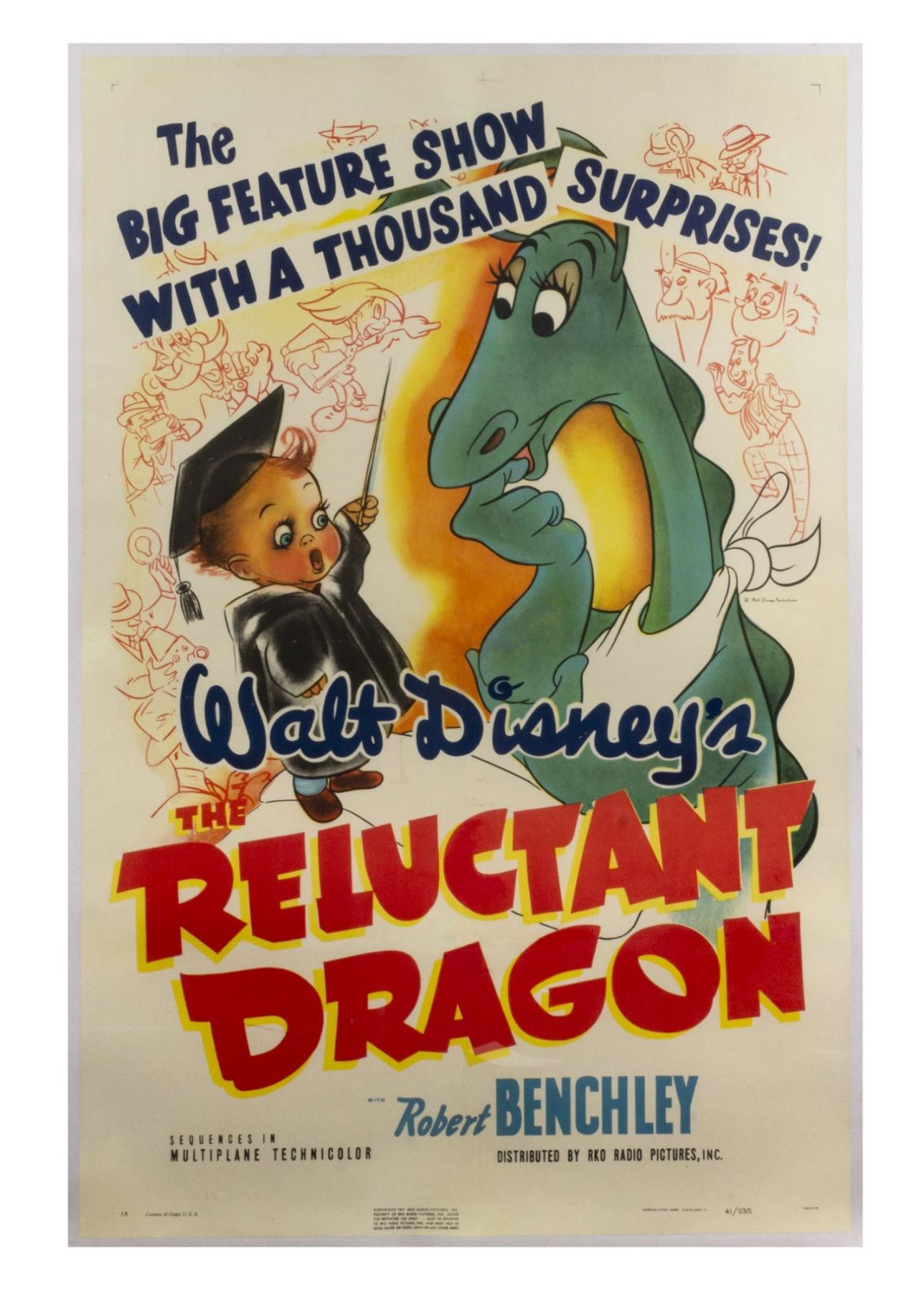 (Walt Disney Studios, 1941) An original one sheet poster from the theatrical release of The Reluctant Dragon. This beautifully illustrated poster reads, "The Big Feature Show with a Thousand Surprises!" above imagery of Baby Weems and the Dragon. Measuring 41"x27.5", the poster is in good condition overall with some surface wear from use and a few small tears that have been restored. The poster has been linen-backed for its preservation with approximately an inch of additional linen around the edges.