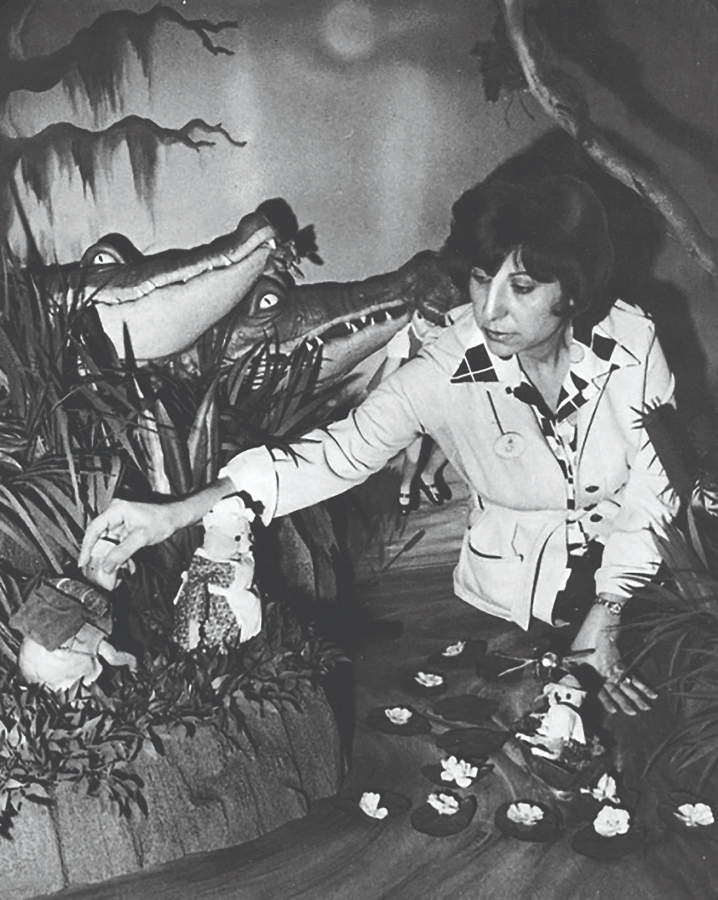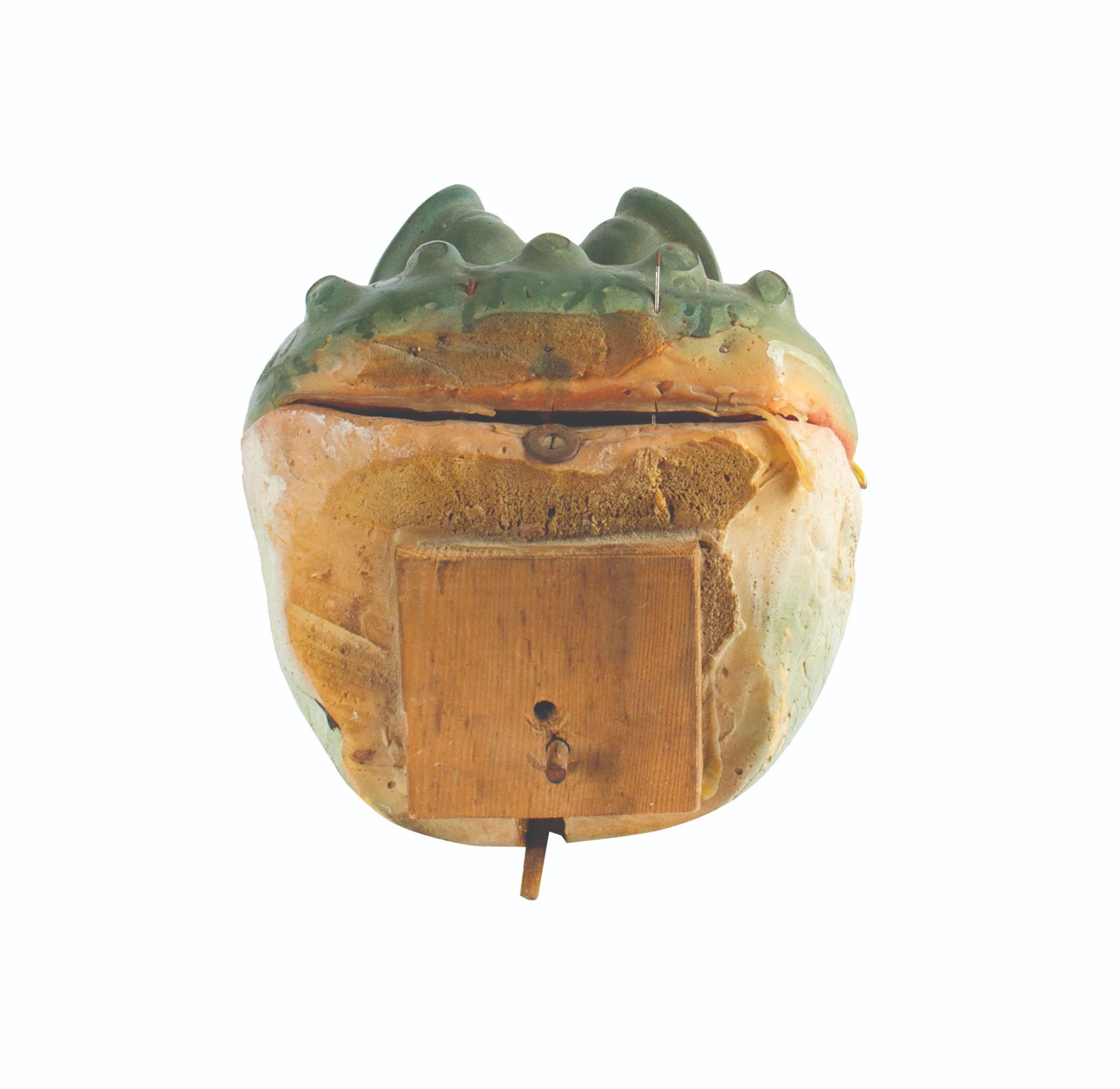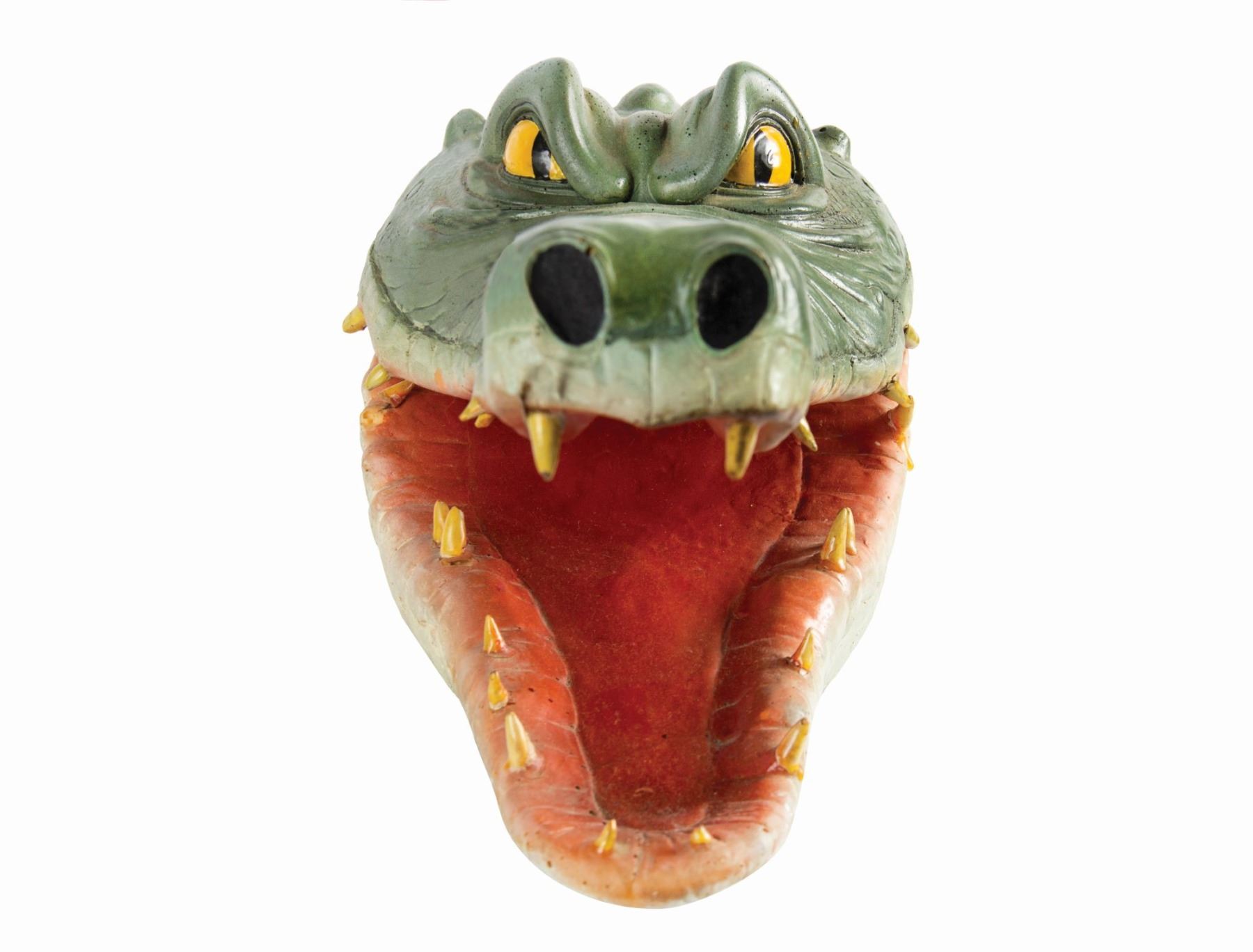 (Disneyland, 1977) A very rare prop used in a The Rescuers themed Main Street Emporium window display. Modeled after one of the villainous crocodiles Brutus and Nero, this prop head is composed of hand-painted hard foam with a wood block at the base, and metal prongs used to secure the head in place. The top-half of the head is hinged at the back so the mouth can be moved up and down. The head measures 16" long and is in fair to good condition with some worn areas to the paint, and some of the teeth are loose or have been reglued. It appears that areas of the prop have been repainted so it's difficult to know which of the two crocodiles this head was originally from, however the head shape, tooth location, and small details including unique placements of the moles can be matched to vintage photos of the Emporium display.