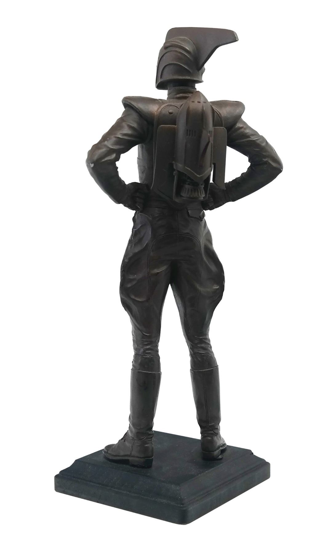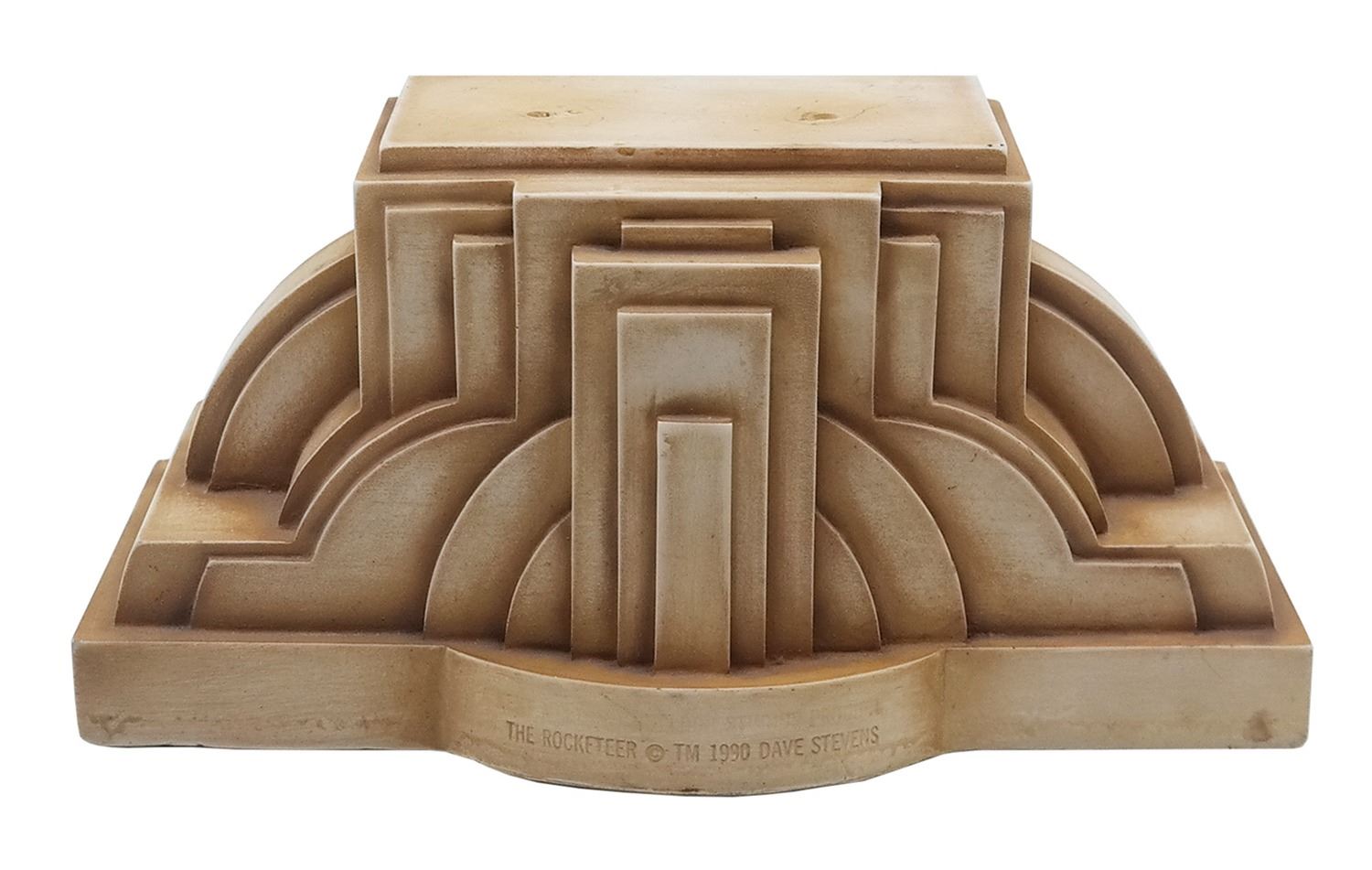 (Bowen Designs, 1999) A prototype statue depicting The Rocketeer. This prototype was created for an edition of 1000 cold-cast resin statues. On the base, the line "Kent Melton/Bulldog Studios Production" can still be faintly seen over the copyright information. Pencil marks designate where the feet will sit upon the base. The painted resin figure appears to be glued to a wooden base to allow it to stand. The separate resin base measures 5"x8" and 3.75" tall, while the figure measures approximately 11" tall. The condition is fair to good, with spots of chipping and cracking to the base, and a broken fin on the rocket pack of the figure. The paint on the figure is scuffed and chipped in multiple places.