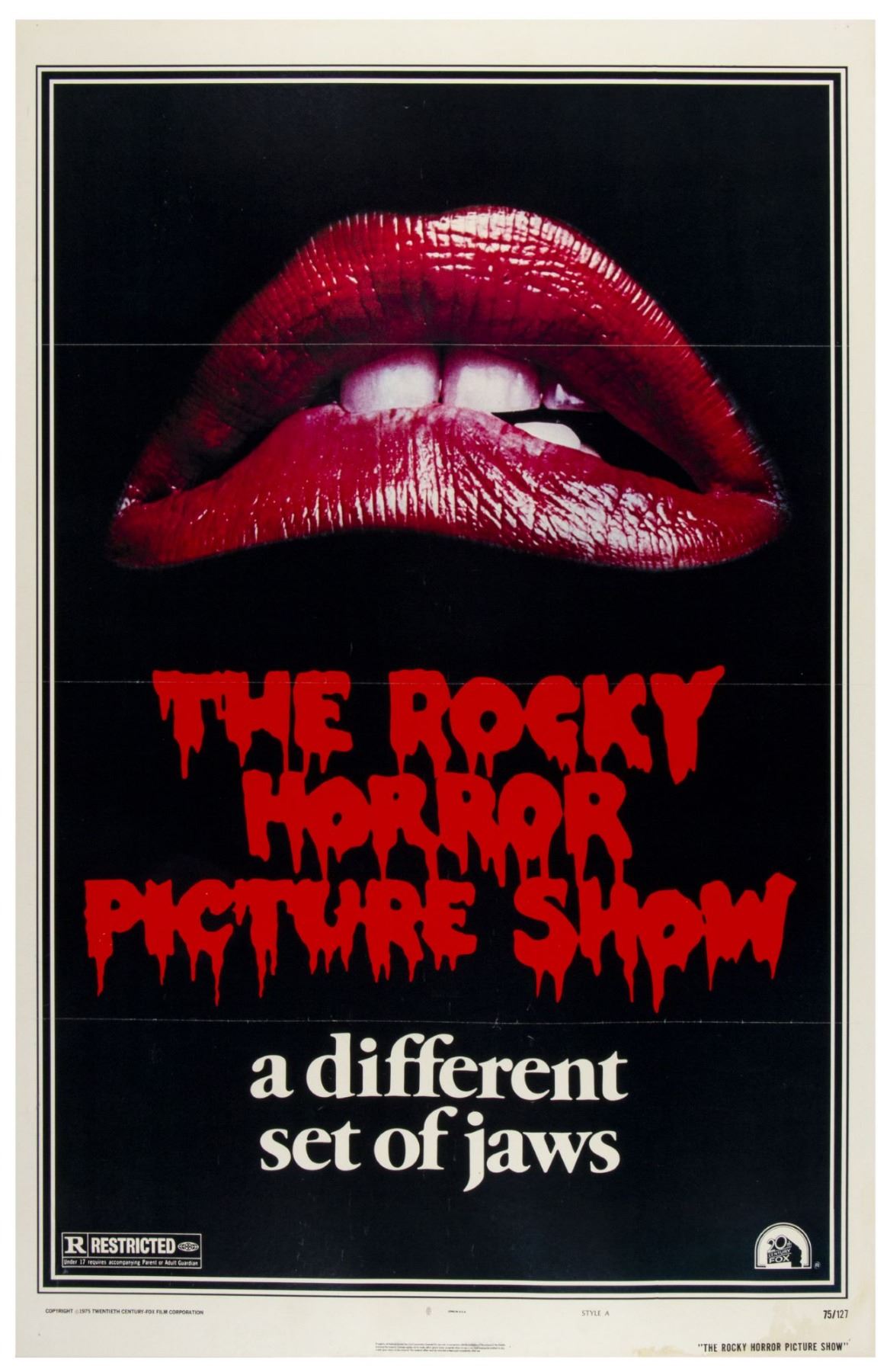 (20th Century Fox, 1975) A very rare original Style A one sheet poster for "The Rocky Horror Picture Show". This poster was lithographically printed and issued by the National Screen Service, and features the lips that have become an iconic visual for the film, as well as the tagline "A Different Set of Jaws". The poster was originally folded horizontally three times, but not folded vertically. It is now mounted to board which reduces the visibility of the fold-lines. Measuring approximately 41"x27", the poster is in fair condition with some wear, creasing, and spots of curving to the paper throughout, and some moisture damage to the bottom-edge.
