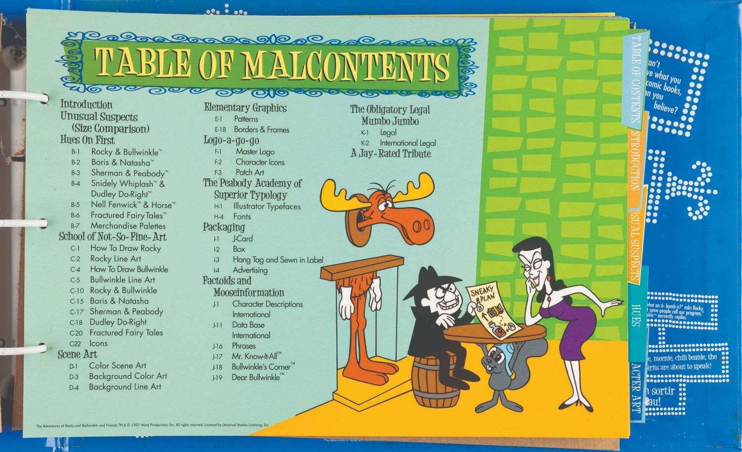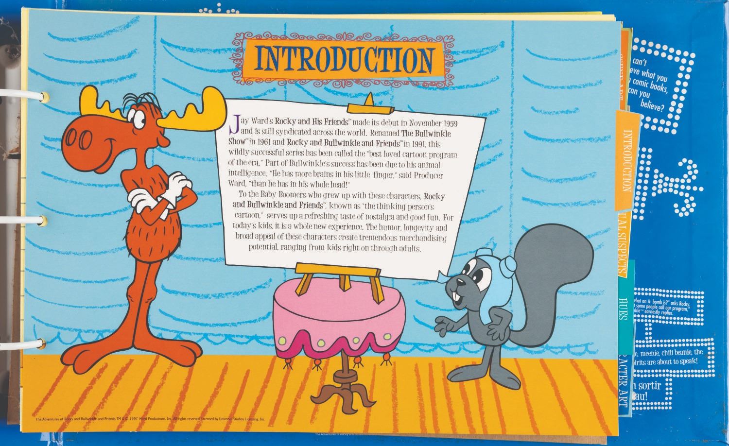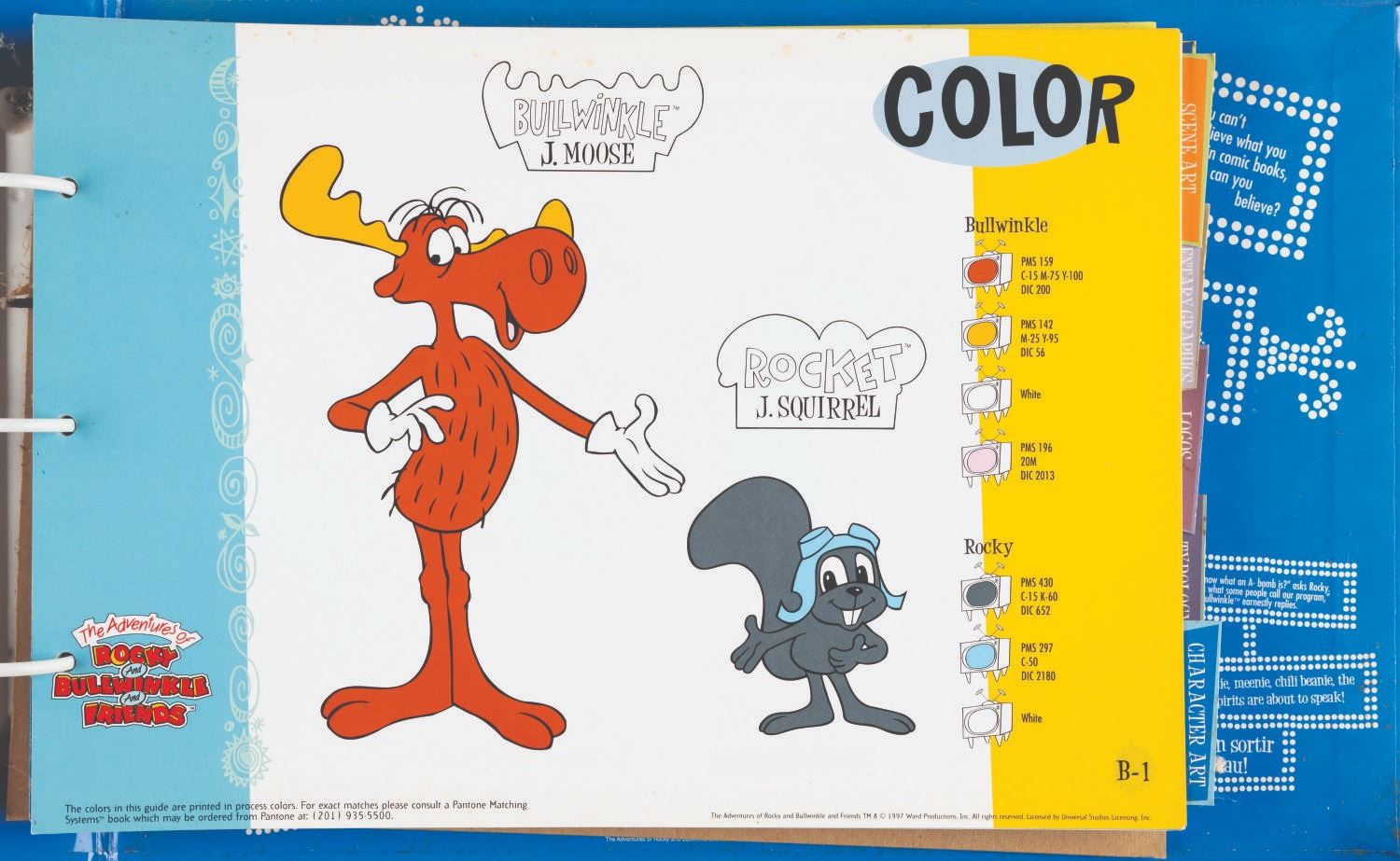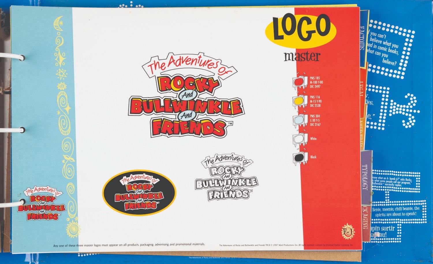 (Universal, 1997) The Rocky and Bullwinkle Handbook style guide for “The Adventures of Rocky and Bullwinkle and Friends” including 110 cardstock pages of character comparative sizes, color guides, scene art, typography, logos, packaging, “Factoids and Moosinformation,” and more. Measuring 9.5” x 13.5” in the 10.75” x 16” x 2” binder, the guide is in fair condition with discoloration to the spine, warping to the cut-out cover logo, and light soiling throughout.