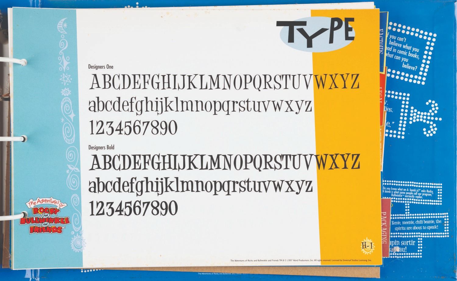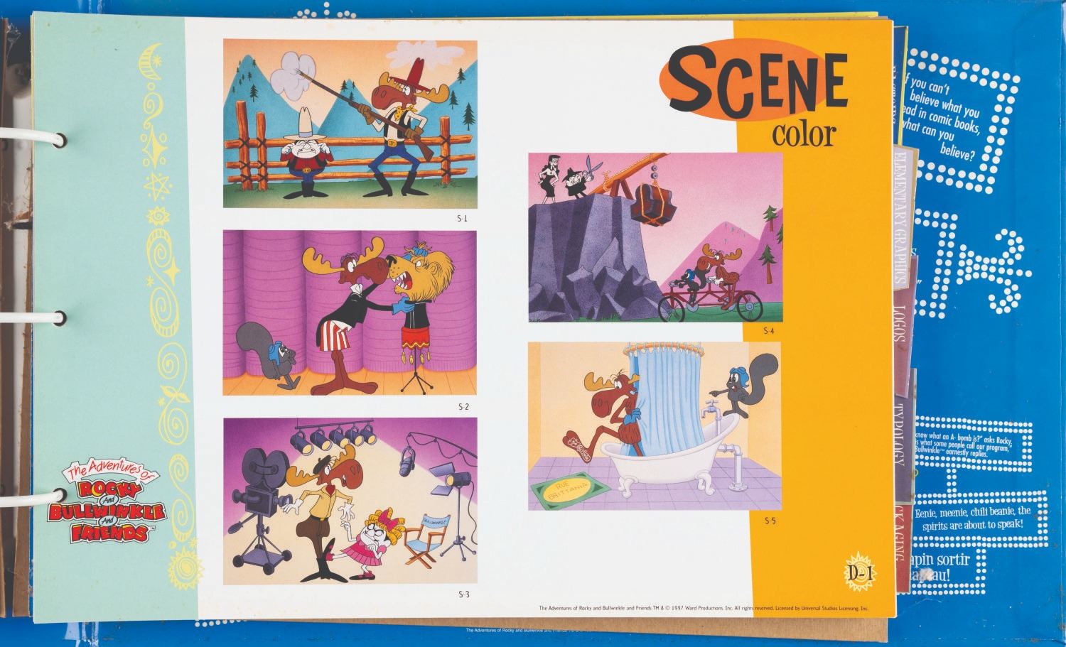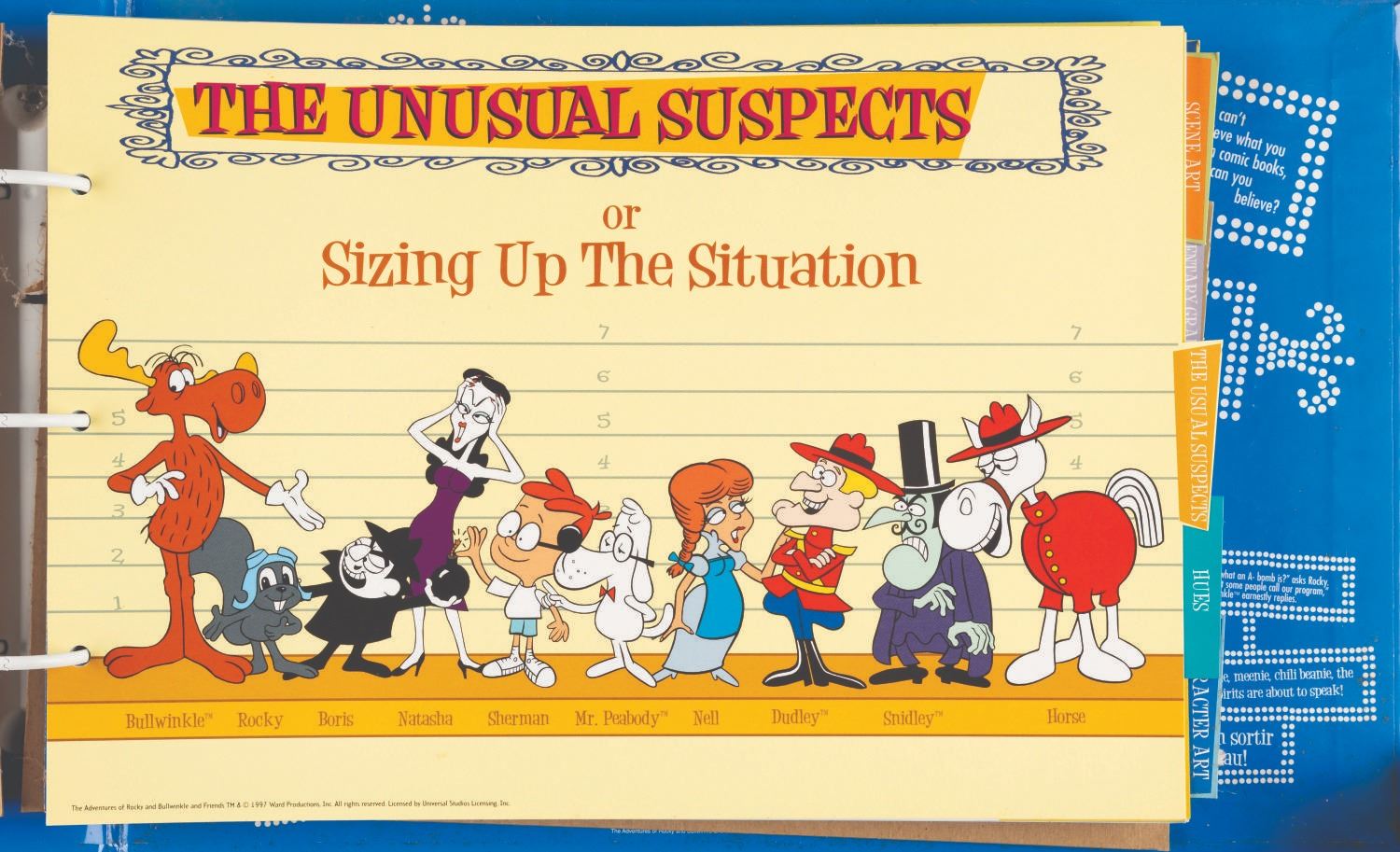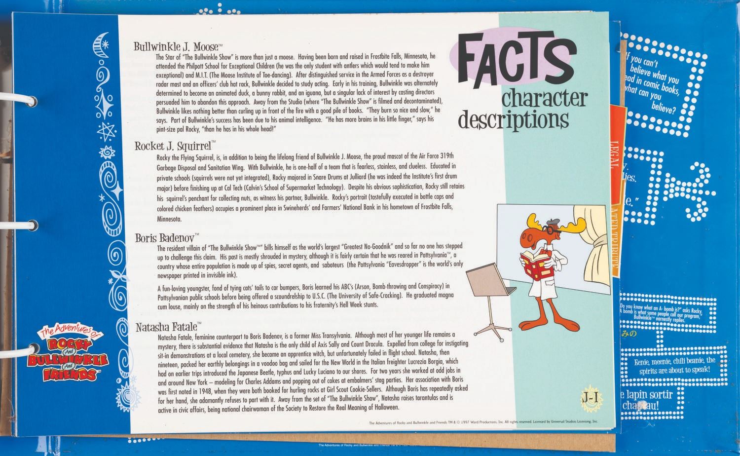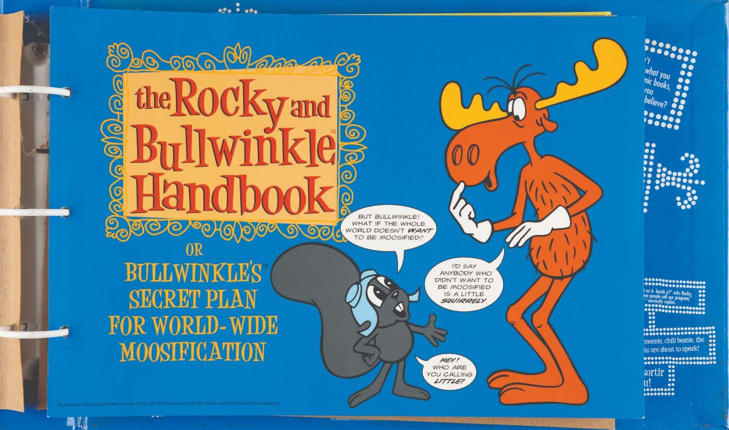 (Universal, 1997) The Rocky and Bullwinkle Handbook style guide for “The Adventures of Rocky and Bullwinkle and Friends” including 110 cardstock pages of character comparative sizes, color guides, scene art, typography, logos, packaging, “Factoids and Moosinformation,” and more. Measuring 9.5” x 13.5” in the 10.75” x 16” x 2” binder, the guide is in fair condition with discoloration to the spine, warping to the cut-out cover logo, and light soiling throughout.