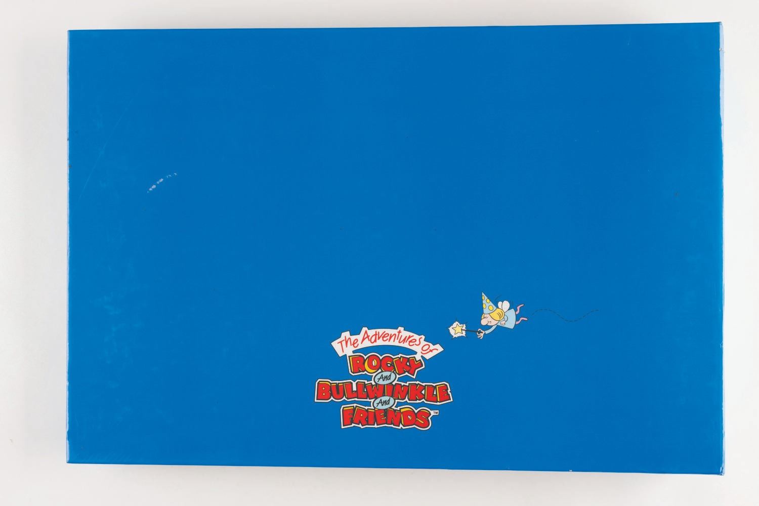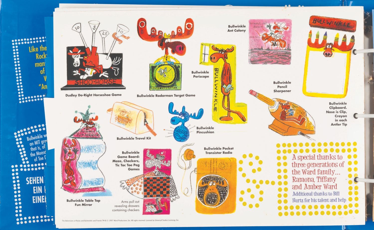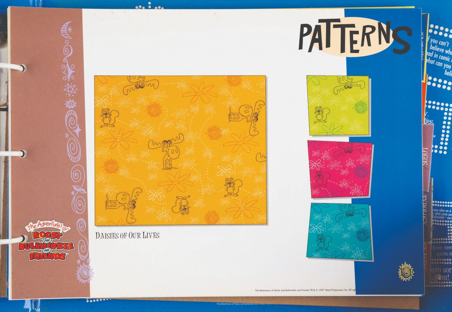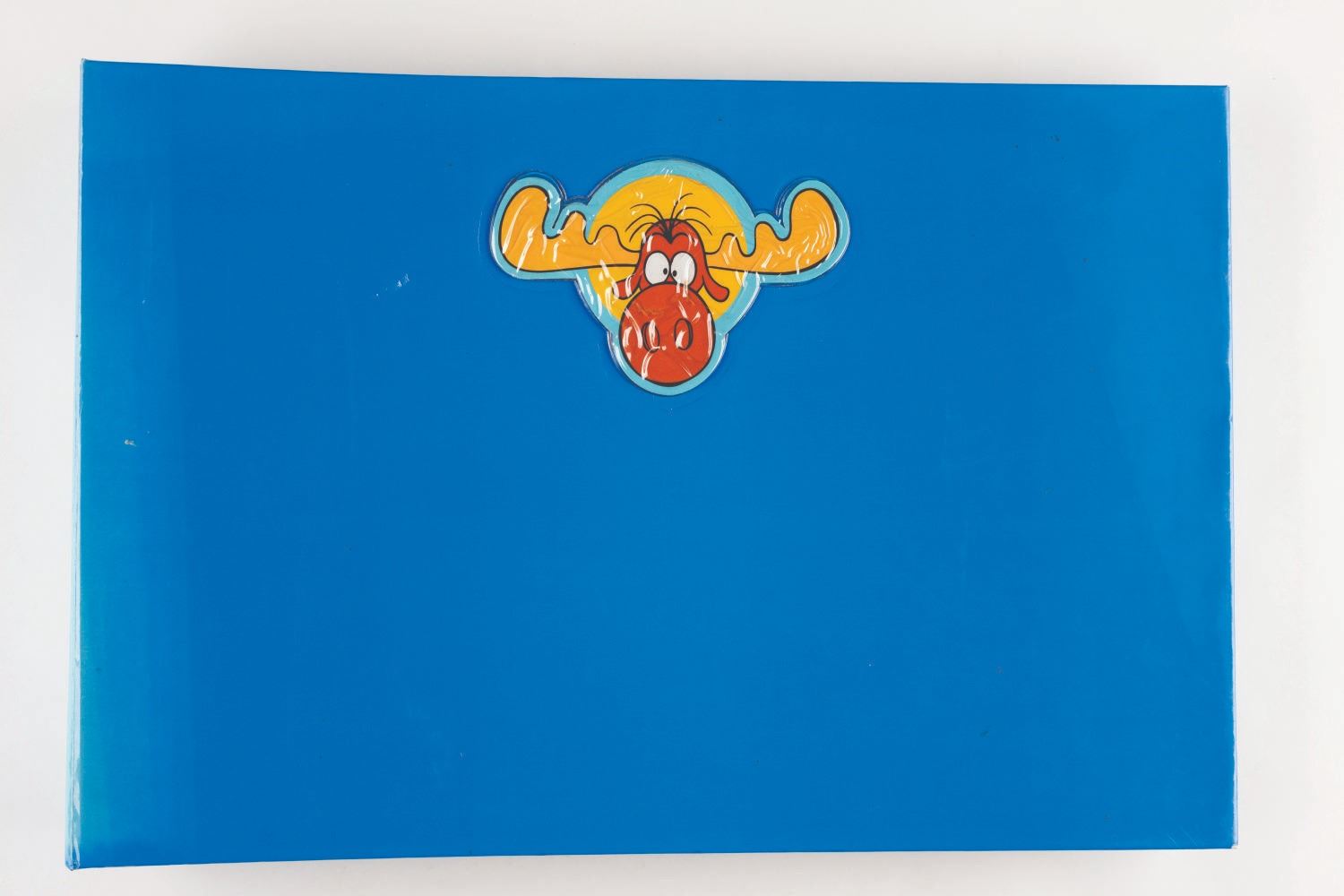 (Universal, 1997) The Rocky and Bullwinkle Handbook style guide for “The Adventures of Rocky and Bullwinkle and Friends” including 110 cardstock pages of character comparative sizes, color guides, scene art, typography, logos, packaging, “Factoids and Moosinformation,” and more. Measuring 9.5” x 13.5” in the 10.75” x 16” x 2” binder, the guide is in fair condition with discoloration to the spine, warping to the cut-out cover logo, and light soiling throughout.