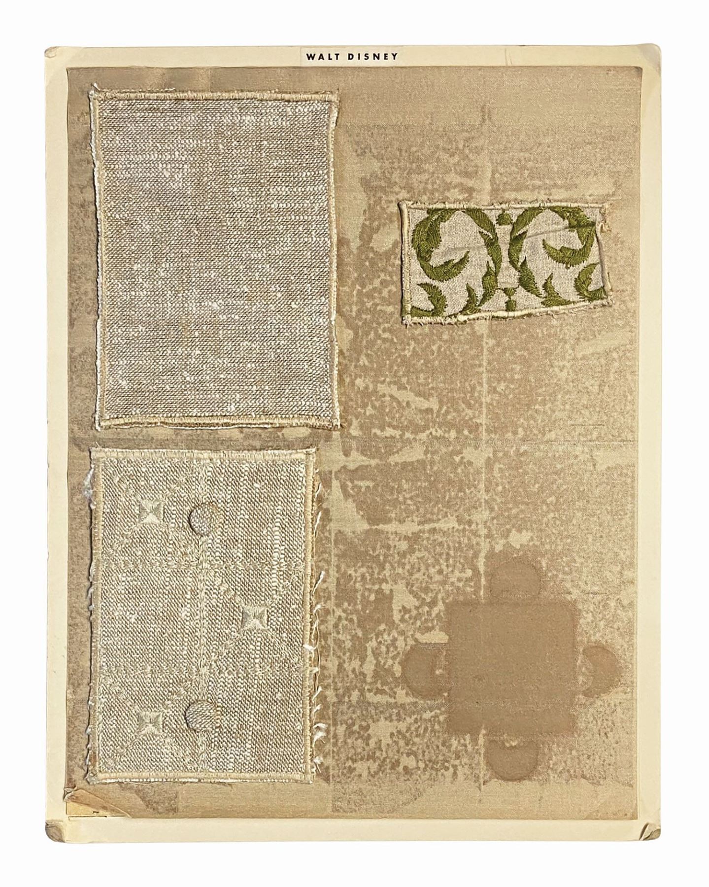 (Disneyland, c.1960s) A very rare set of assorted fabric samples developed for The Royal Suite, the original iteration of what would become The Disneyland Dream Suite in New Orleans Square. The Suite was the brainchild of Walt Disney, who decided he needed a larger location for entertaining the park's visiting VIPs. Although significant progress was made in the creation of the suite, Roy O. Disney decided to place the project on hold following Walt's death in 1966. The location later became the home of the Disney Gallery from the late 1980s until 2007, before eventually becoming The Dream Suite in 2008. Artifacts from the original iteration while Walt was still involved in the project are incredibly scarce, and these fabric samples provide a scarcely seen look into what could have been for this historic location. The board backing is labeled "Walt Disney" along the top-edge, and contains two brown fabric samples that are hinged at their top edges to the backing, and one green sample. There appears to be a missing sample in the lower-right where an outline remains. The board measures 15.5"x12.25" and is in fair condition with some areas of discoloration from age and use, as well as some wear around the edges of the board.