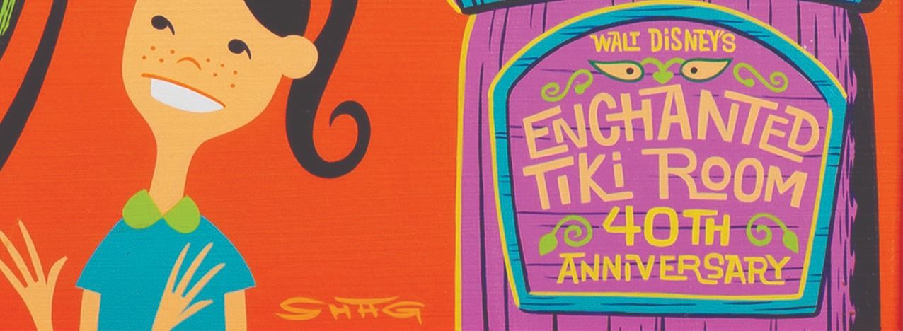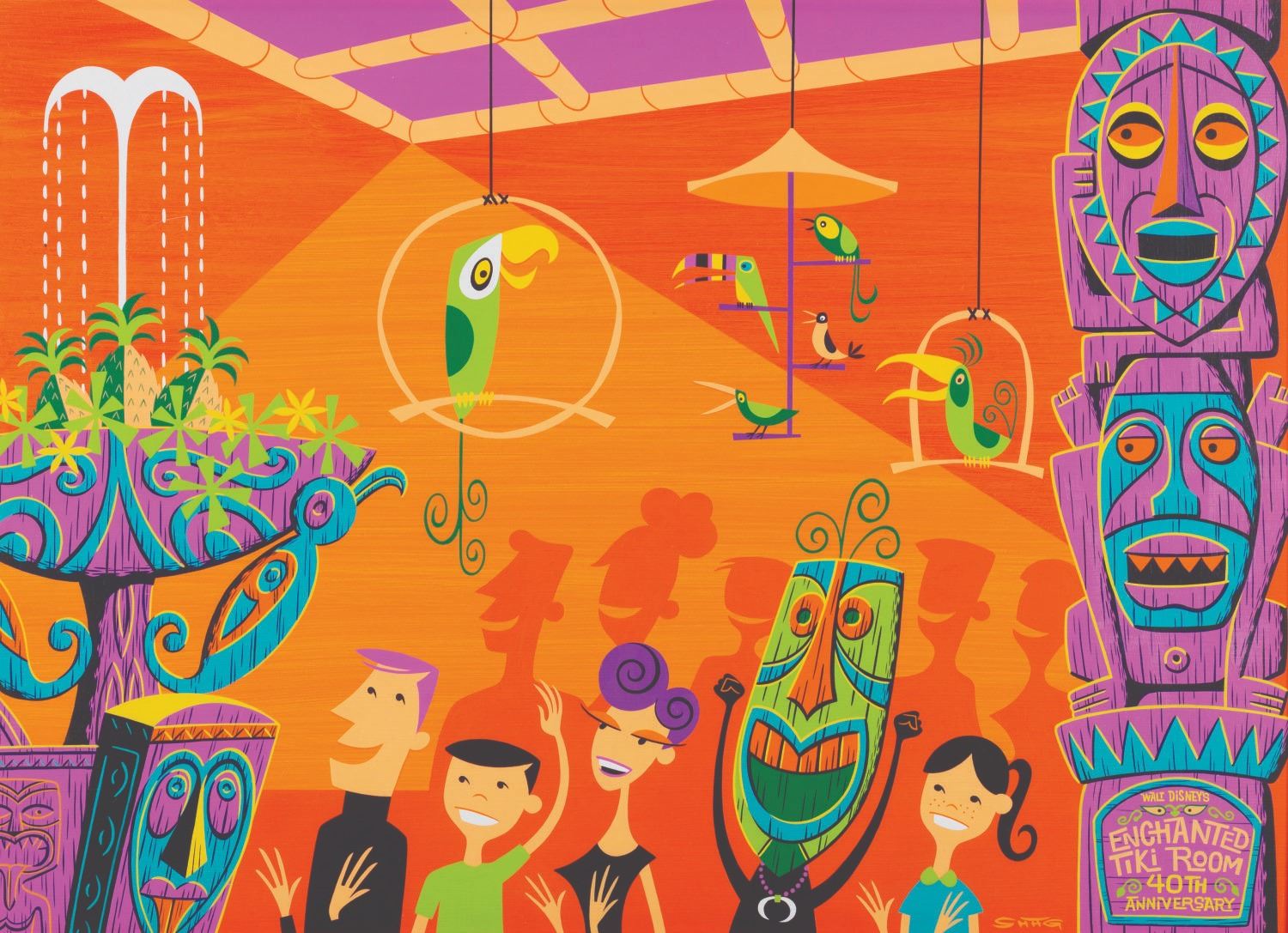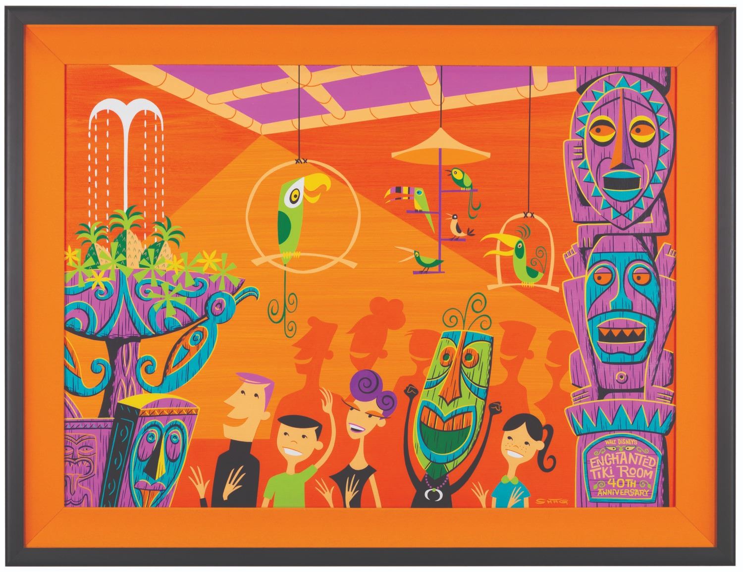 "This was the very first piece of art Disney commissioned from me back in 2003 to celebrate the 40th anniversary of Walt Disney’s Enchanted Tiki Room. Because Walt Disney had paid for the development and construction of the attraction, his heirs still owned the Tiki Room, and every piece of art or merchandise related to the attraction had to be cleared by Roy Disney, Walt’s nephew. Roy actually made one change to this piece of art after reviewing the concept sketch: the boy with his hand in the air was originally making a fist, and Roy asked that his hand be changed to a wave." - SHAG