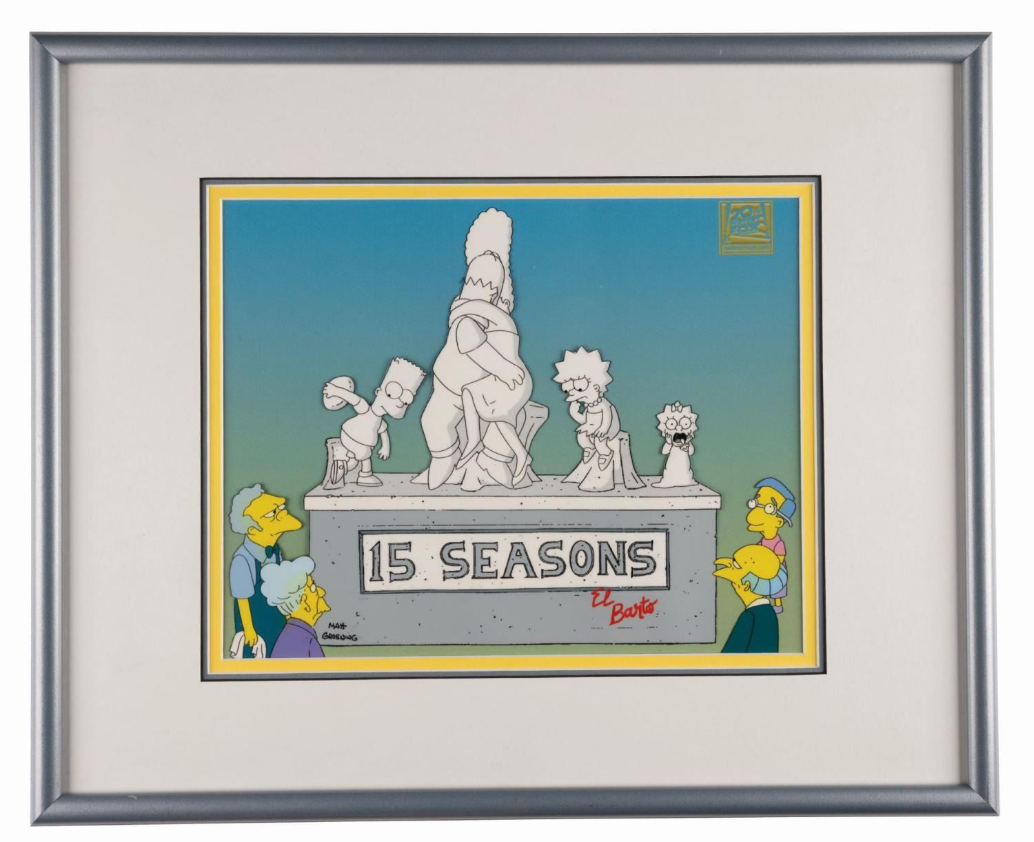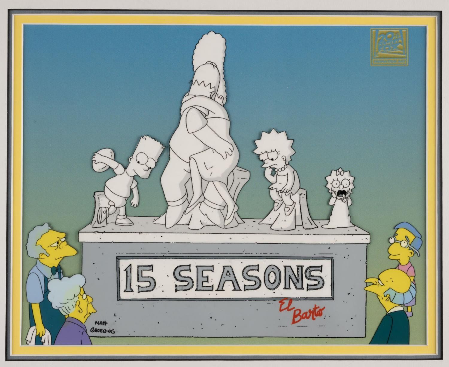 (Fox, 2003) A limited edition hand-painted cel on a printed background commemorating the 15th season of The Simpsons. The Simpsons are enshrined in a marble monument that parodies iconic classical sculpture as the additional characters Moe Szyslak, Agnes Skinner, Millhouse Van Houten, and Mr. Burns look on. The cel was created in an edition of 300 and gifted to friends and supporters of the show. It retains a Fox seal at the top right and a COA on the reverse of the frame. Measuring 9.25" x 11.75" visible in an 18" x 20.5" frame, the cel is in very good condition with minimal wear.