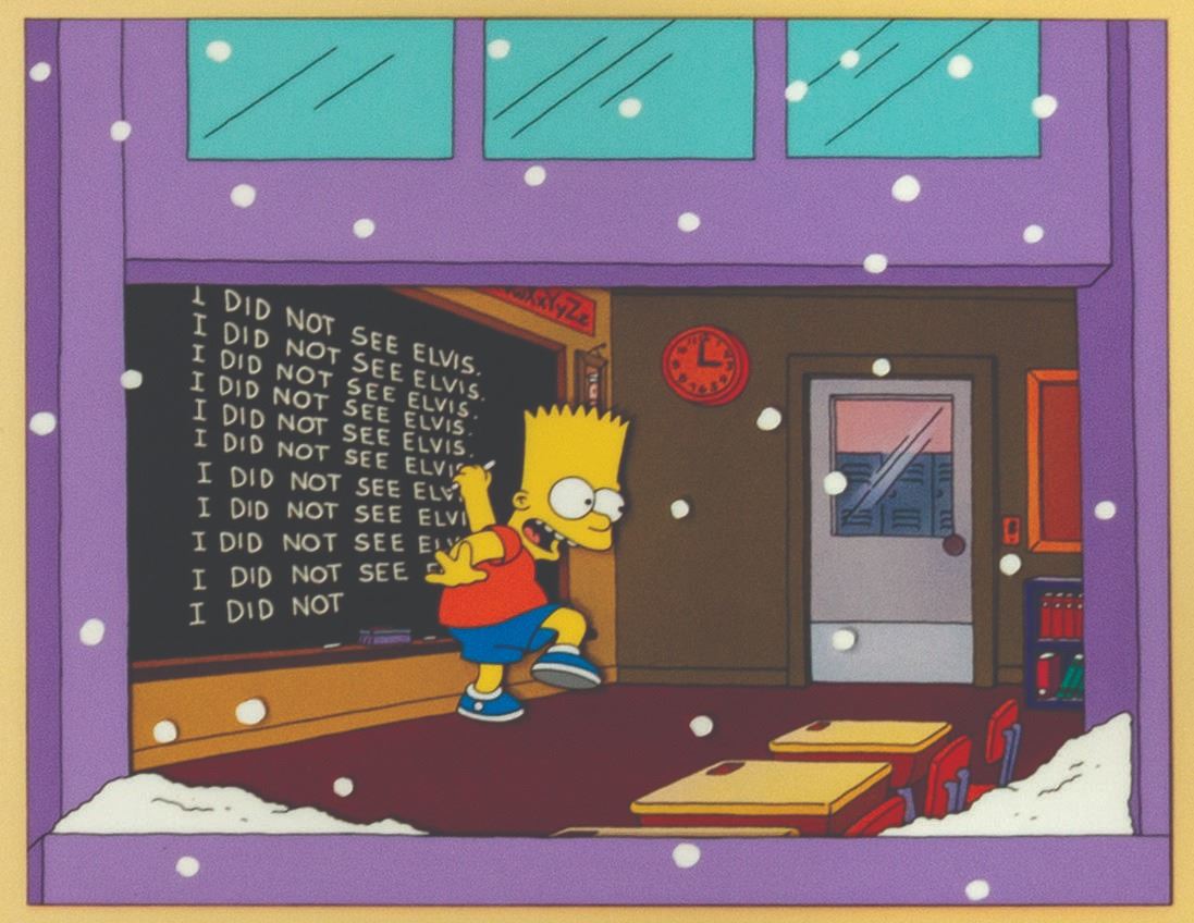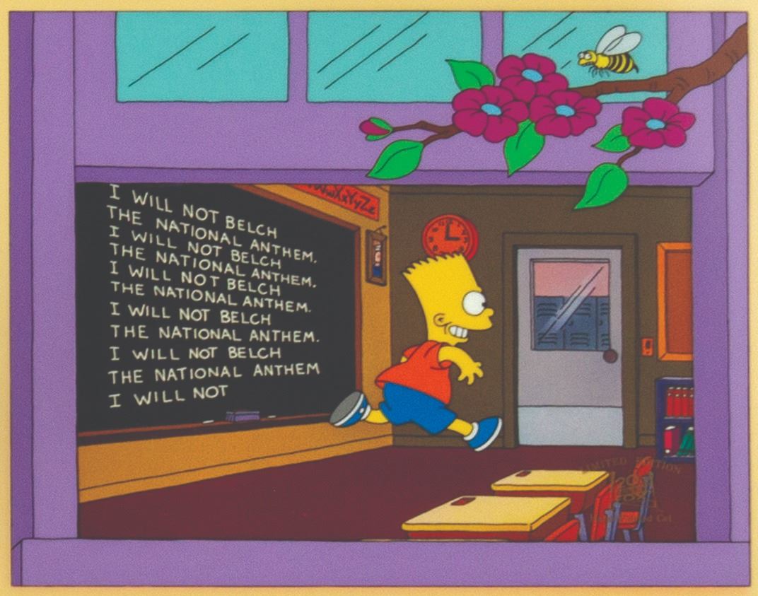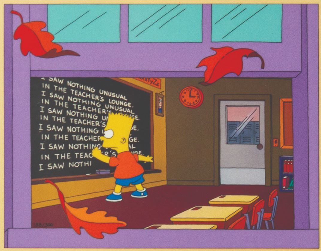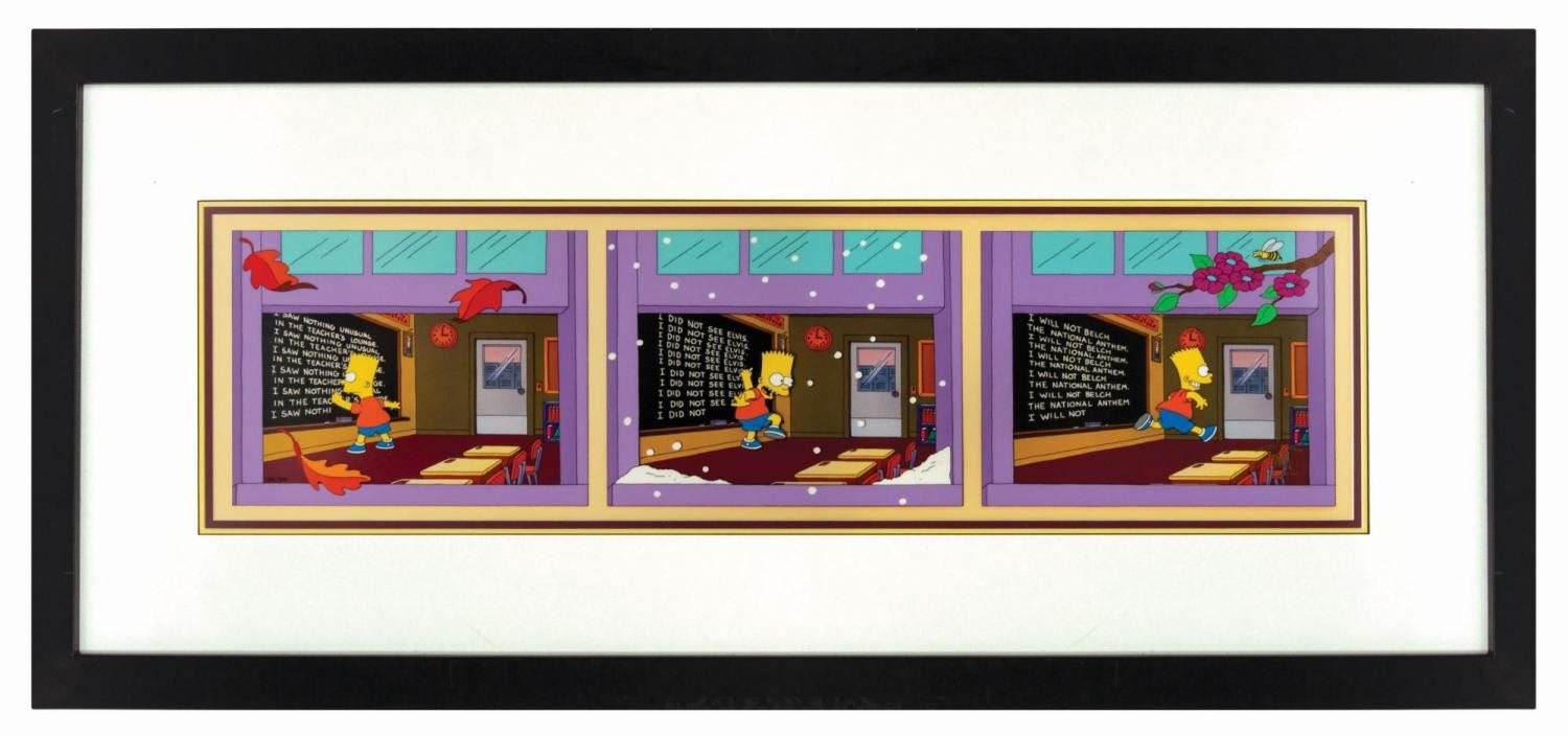 (Fox, 1993) A limited edition The Simpsons hand-painted cel from the personal collection of the voice of Bart, Nancy Cartwright. Titled "Blackboard Bungle," the cel depicts three stages of Bart serving after-school punishment in Miss Krabapple's classroom, during varying seasons of the year, with three different blackboard gags taken from the show. The pan cel retains a Fox seal at bottom right and is hand-numbered "188/300" at bottom left. Measuring 8.75"x32" through a 19.75"x42.75" frame, the pan cel is in fine condition with minimal wear.