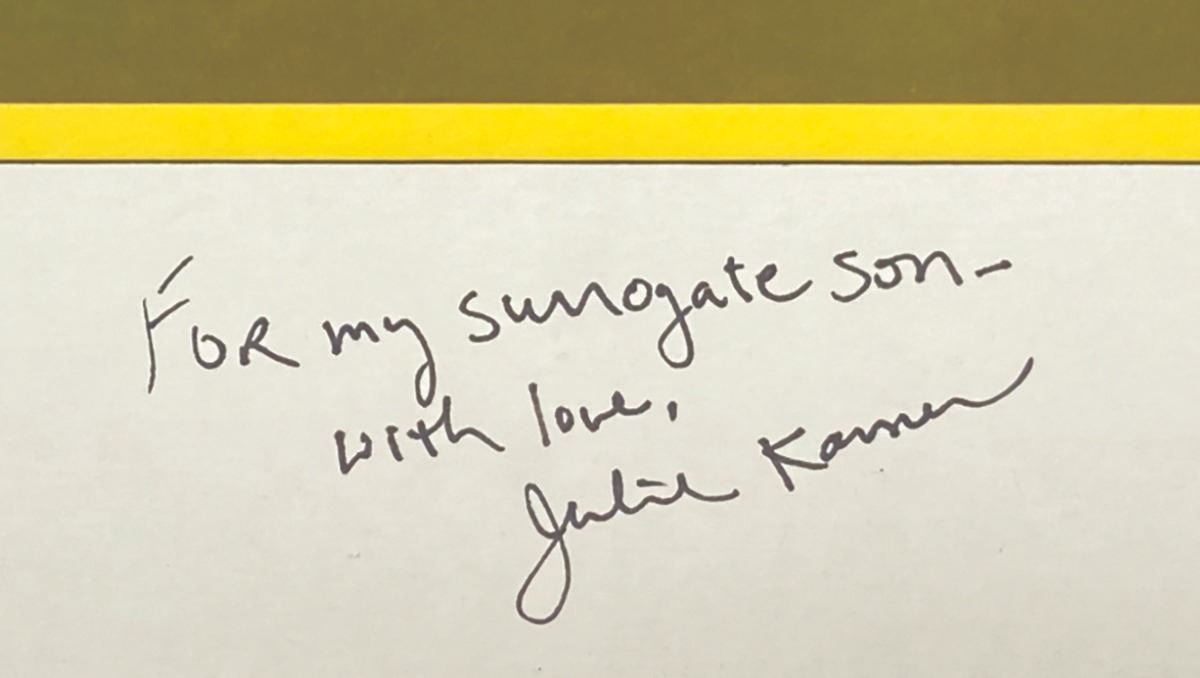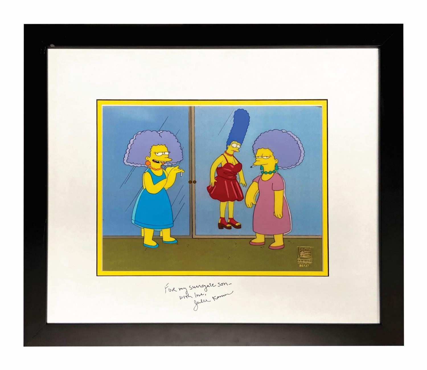 (Fox, 1996) An original The Simpsons production cel from the personal collection of the voice of Bart, Nancy Cartwright. This cel was used in the 14th episode of the show's seventh season, "Scenes from the Class Struggle in Springfield." The setup consists of three cel layers depicting Selma, Patty, and Marge, over a screen-matching printed background that contains both Marge's and Patty's legs. In this memorable scene, Selma remarks, "I call this one 'fantasy in maroon.'" The setup retains a Fox seal at lower right. The mat is warmly inscribed and signed to Cartwright by Julie Kavner, voice of Marge, Patty, and Selma, "For my surrogate son- with love, Julie Kavner." Measuring 9"x11.5" visible through a 17.25"x20" black wood frame, the cels are in fine condition with minimal production wear. The setup is accompanied by a Fox COA affixed to the reverse of the frame.