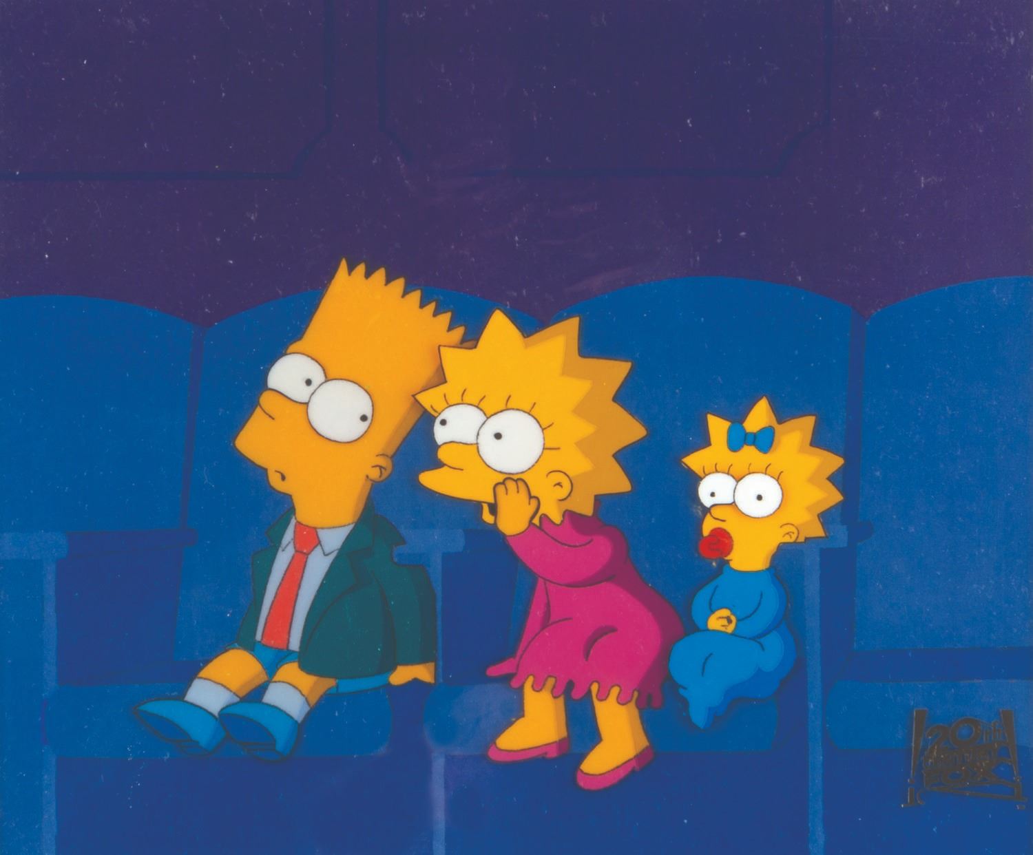 (20th Century Fox, 1992) An original multi-layer production cel of Bart, Lisa, and Maggie from “The Simpsons” episode “A Streetcar Named Marge,” with a color copy background. Also included are three production drawings of Lisa’s head, body, and Maggie. Bart, Lisa, and Maggie, have an image size of 4.5” x 6” on a 7.5” x 9” visible cel. The entire matted and framed piece measures 14.5” x 16” and is in fine condition with light scuffs to the frame. The 10.5” x 12” graphite drawings are in good condition with light edge wear, creasing, and stains from production use.