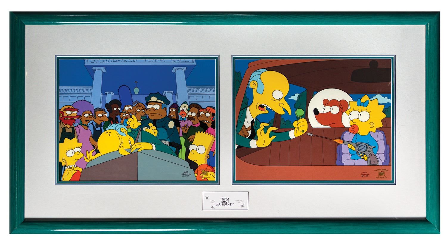 (20th Century Fox, c.1995) A very rare limited edition hand-painted pair of cels depicting key scenes from the 2-part "Who Shot Mr. Burns?" Simpsons episode. The hand-painted cels ae placed over printed serigraph backgrounds and display wonderfully within a custom frame. The cels were created in an edition of only 200 pieces, and these particular cels are Artist Proofs of that edition numbered AP 11/20. Both cels are signed by the show's creator, Matt Groening, and both feature a gold seal of authenticity in the lower-right corners. These highly desirable cels have image sizes of 12"x15.5" within the 22.5"x42.5" frame. The condition is very fine with minor wear to the frame from previous display. A Who Shot Mr. Burns? printed letter describing the episode and cels is included, as well as the original sales paperwork from 20th Century Fox.