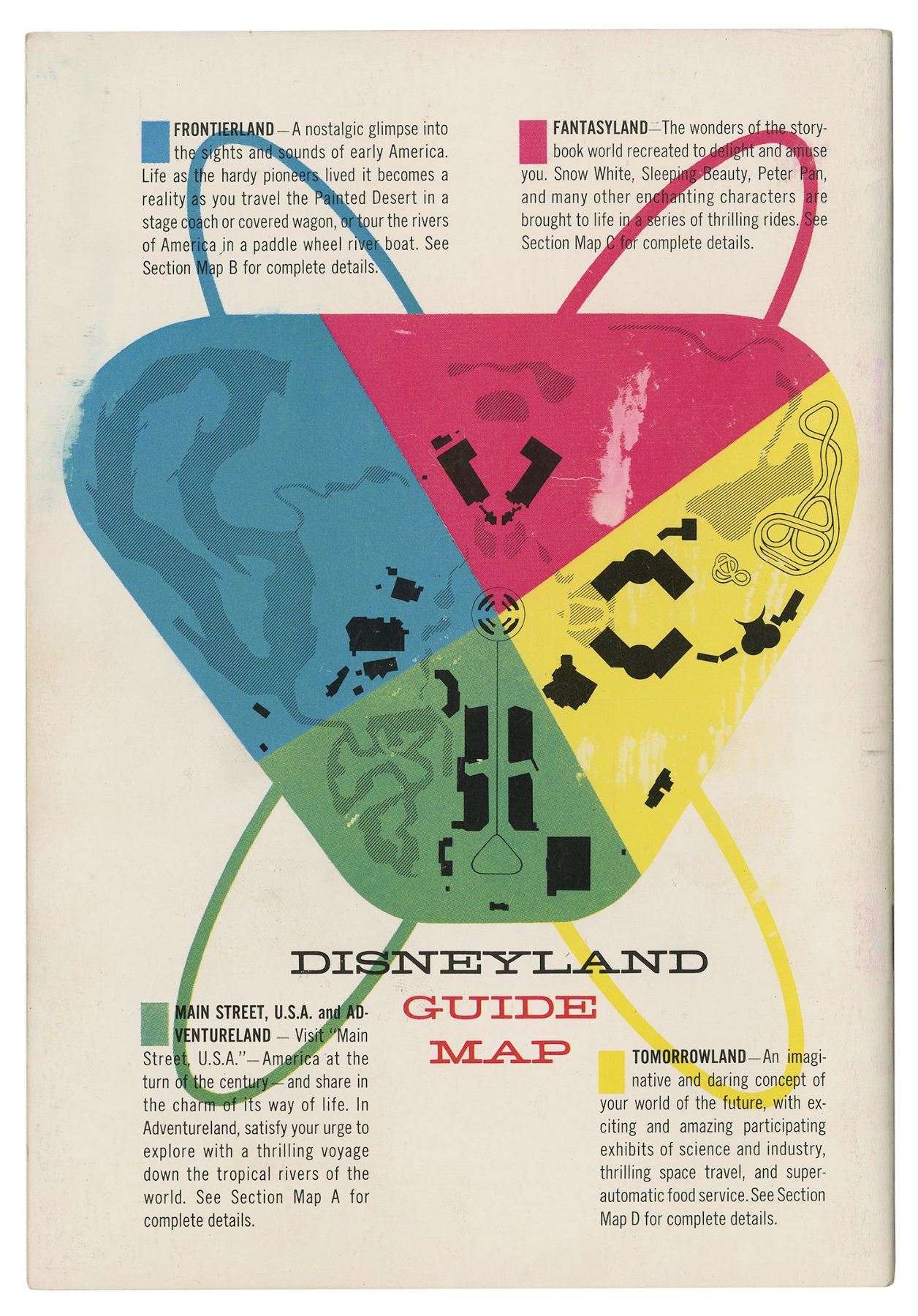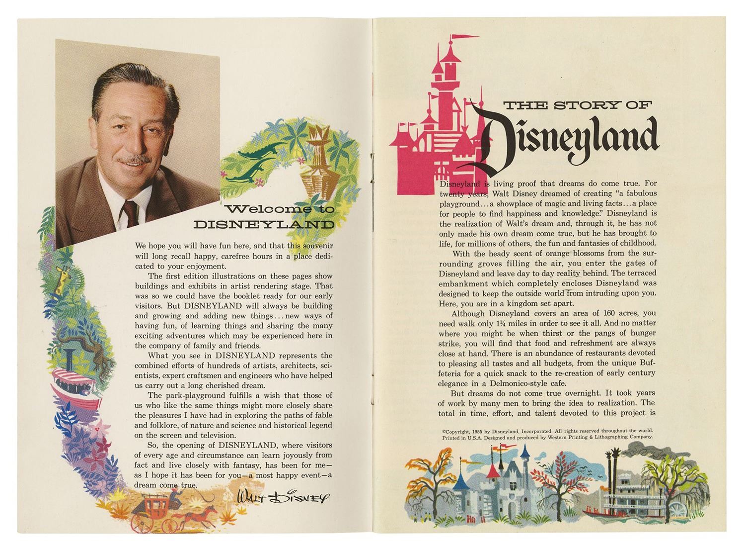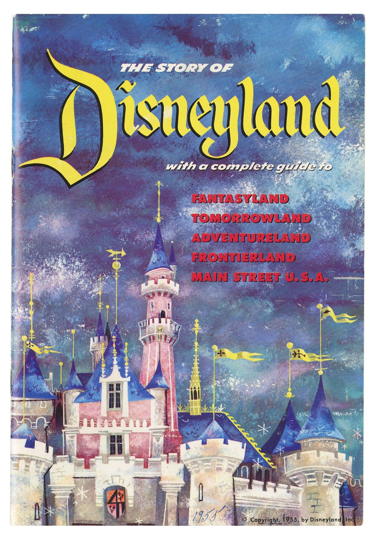 (Disneyland, 1955) A beautiful opening year guidebook featuring information and illustrations of the different lands of the park. Titled "The Story of Disneyland," this was the first guidebook issued by the park. The book contains concept artwork of the attractions and lands, as opposed to later guidebooks which would feature actual photos of the park. This 22-page guidebook measures 8.75"x6" closed, and is in good condition with some cover and edge wear from use. A few inner pages have some yellowing from age.