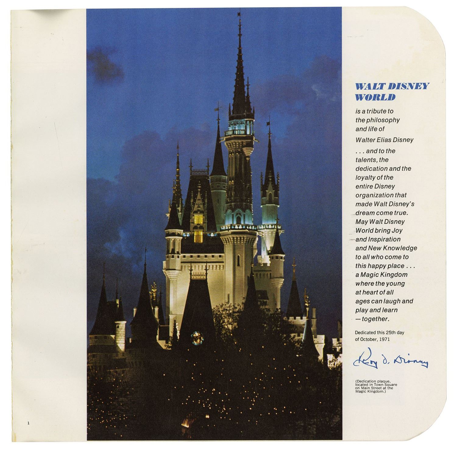 (Walt Disney World, 1971) A rare book titled "The Story of Walt Disney World" that was created to commemorate the opening of the newest Disney park. The book features color photos of the construction and design of many of the park's attractions and tells the story of how Walt's project came to be. The 48-page book measures 11"x11" and is in fair condition with moderate spine wear that has caused some of the pages to come loose, however the book is complete.