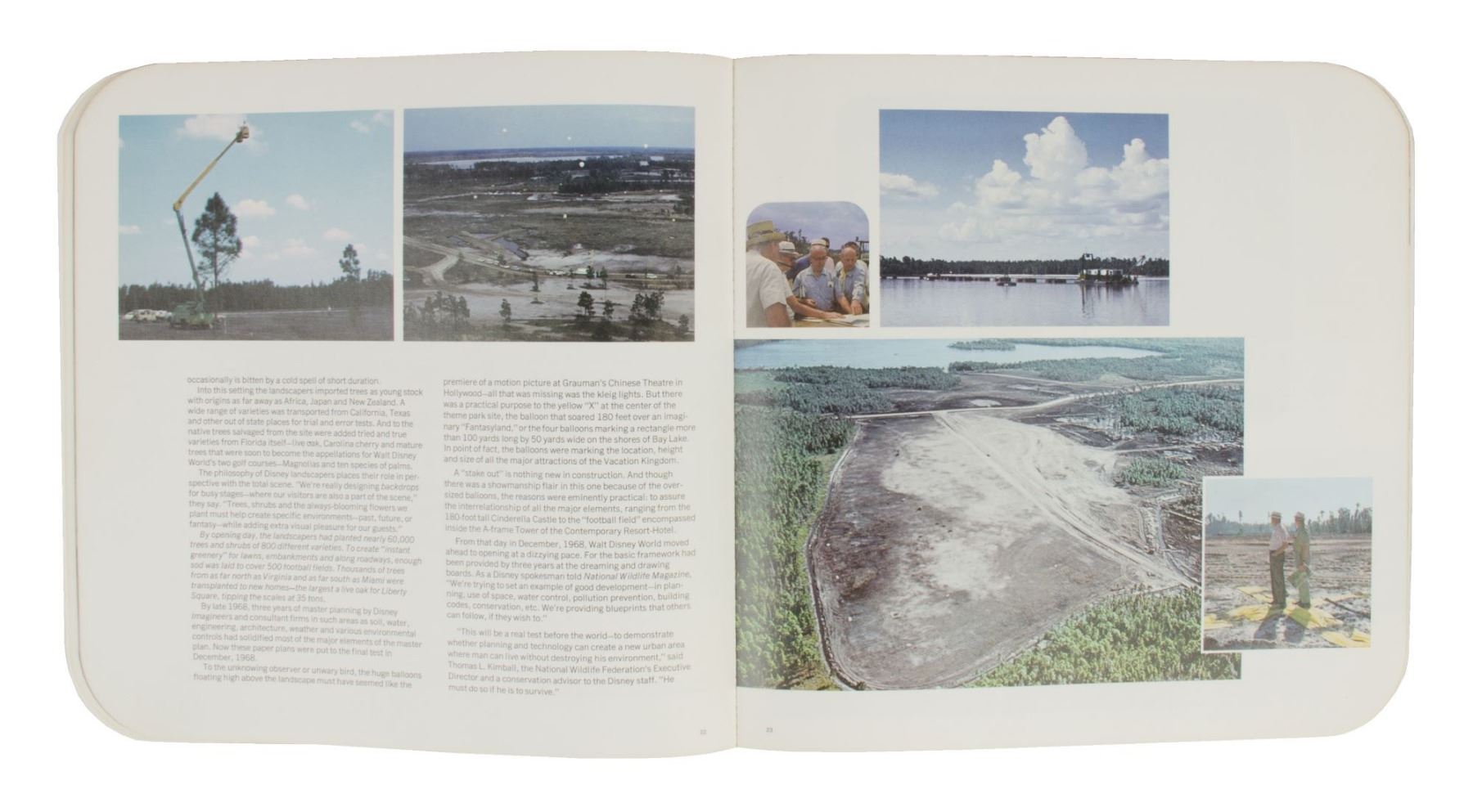 (Walt Disney World, 1971) A rare opening year book titled "The Story of Walt Disney World" that was created to commemorate the opening of the new park. This book features color photos of the construction and design of many of the park's attractions, and tells the story of how Walt's project came to be. The 48-page book measures 11"x11" and is in very good condition with some cover wear.