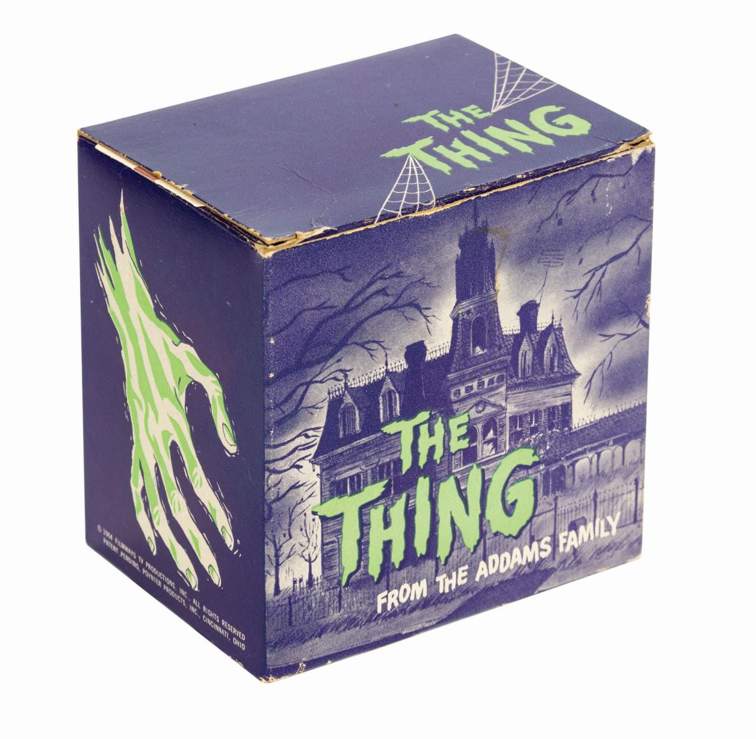 (Poynter Products, 1964) A vintage The Thing from The Addams Family coin bank manufactured by Poynter Products. Inspired by the iconic disembodied hand from the TV series, a ghostly arm reaches from under the lid to grab coins positioned in the deposit slot on the top of the box. The mechanism runs on two C-batteries, however the motor is not currently operational. The original box is included. Measuring 3.25"x4.5" and 3.25" deep, the piece is in very good condition with minor wear and no apparent damage to the mechanism.