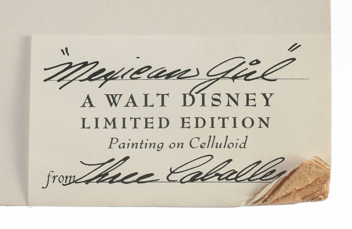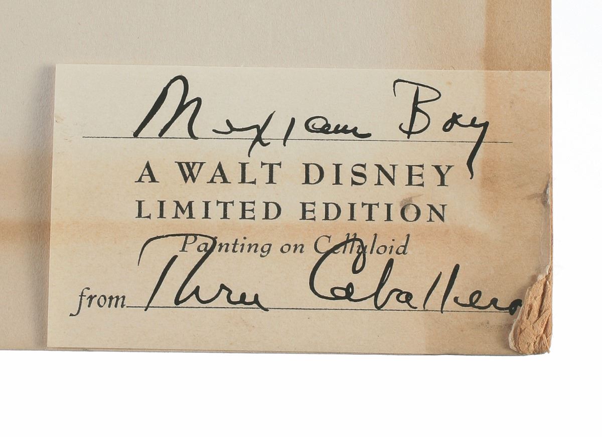 (Courvoisier Galleries, 1944) Pair of Courvoisier Galleries Limited Editions from "The Three Caballeros". The artwork is still in the original mats with Courvoisier Galleries stickers on the reverse and the original front stickers also. The mats have yellowed a bit from age with staining and wear. Both pieces have mat openings of 6"x8". In fine condition.