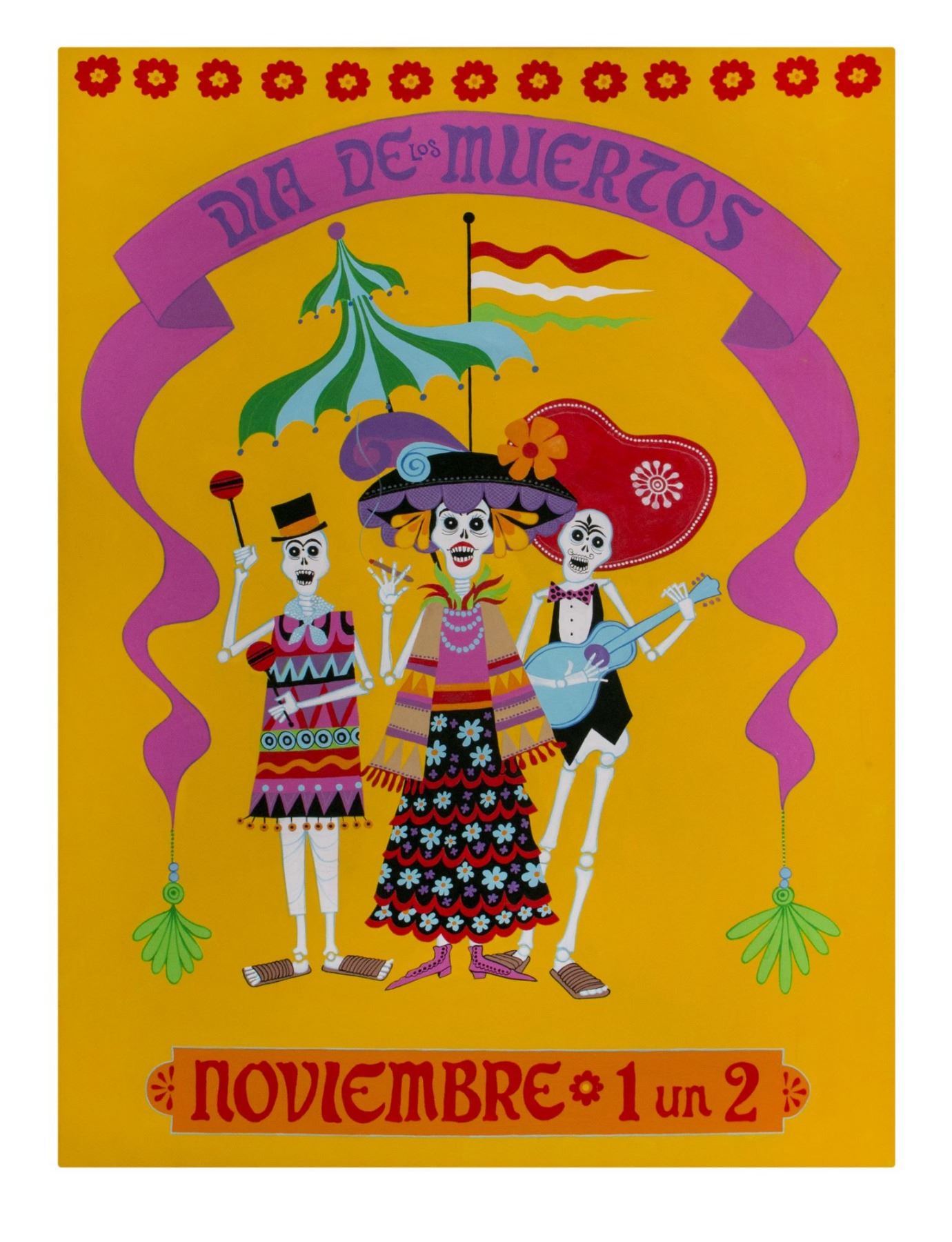 (2001) An original painting by Rolly Crump that was inspired by a Dia de los Muertos event in Oceanside, California. Titled "The Trio", this painting is accomplished in acrylic on canvas and measures 48"x36". The condition is very good with minor scuffs on the right side.