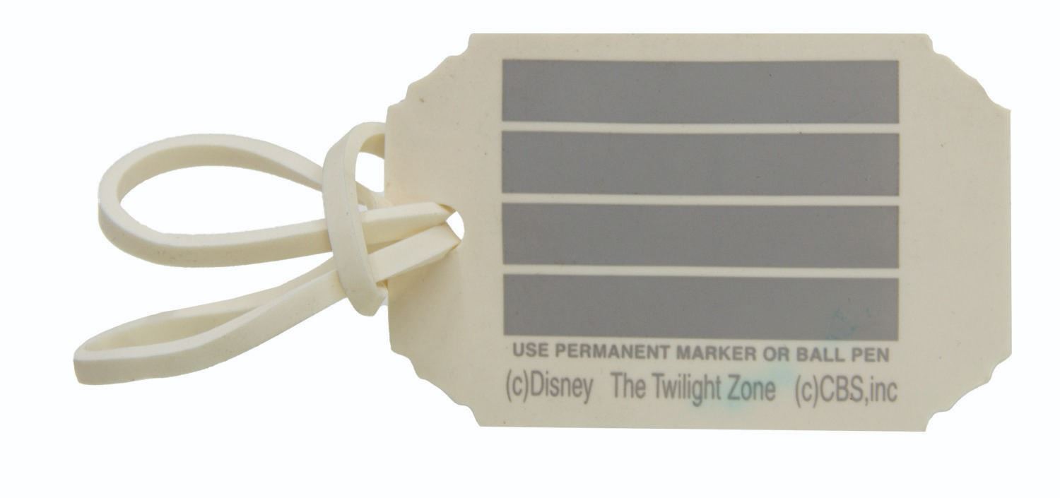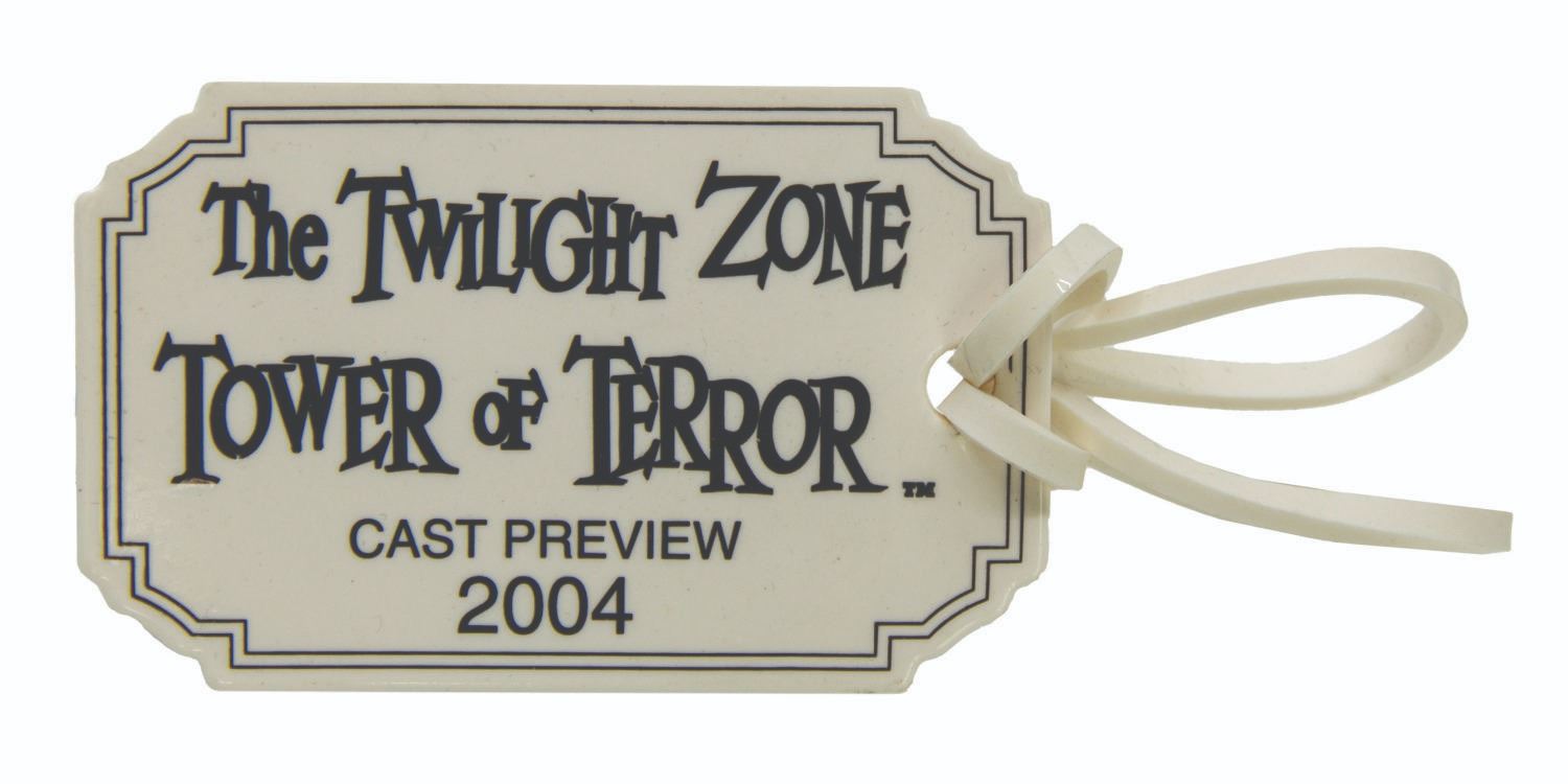 (California Adventure, 2004) A Twilight Zone Tower of Terror luggage tag created to commemorate the cast preview of the attraction. The vinyl luggage tag is in the shape of the Hollywood Tower Hotel sign and features the attraction logo with "Cast Preview 2004" text on the face. The reverse of the tag contains blank fields to write personal information. Measuring 2"x3.25", the piece is threaded on a 6" vinyl lanyard for attachment to a bag or suitcase and is in very good condition with a spot of blue discoloration at the bottom of the reverse.