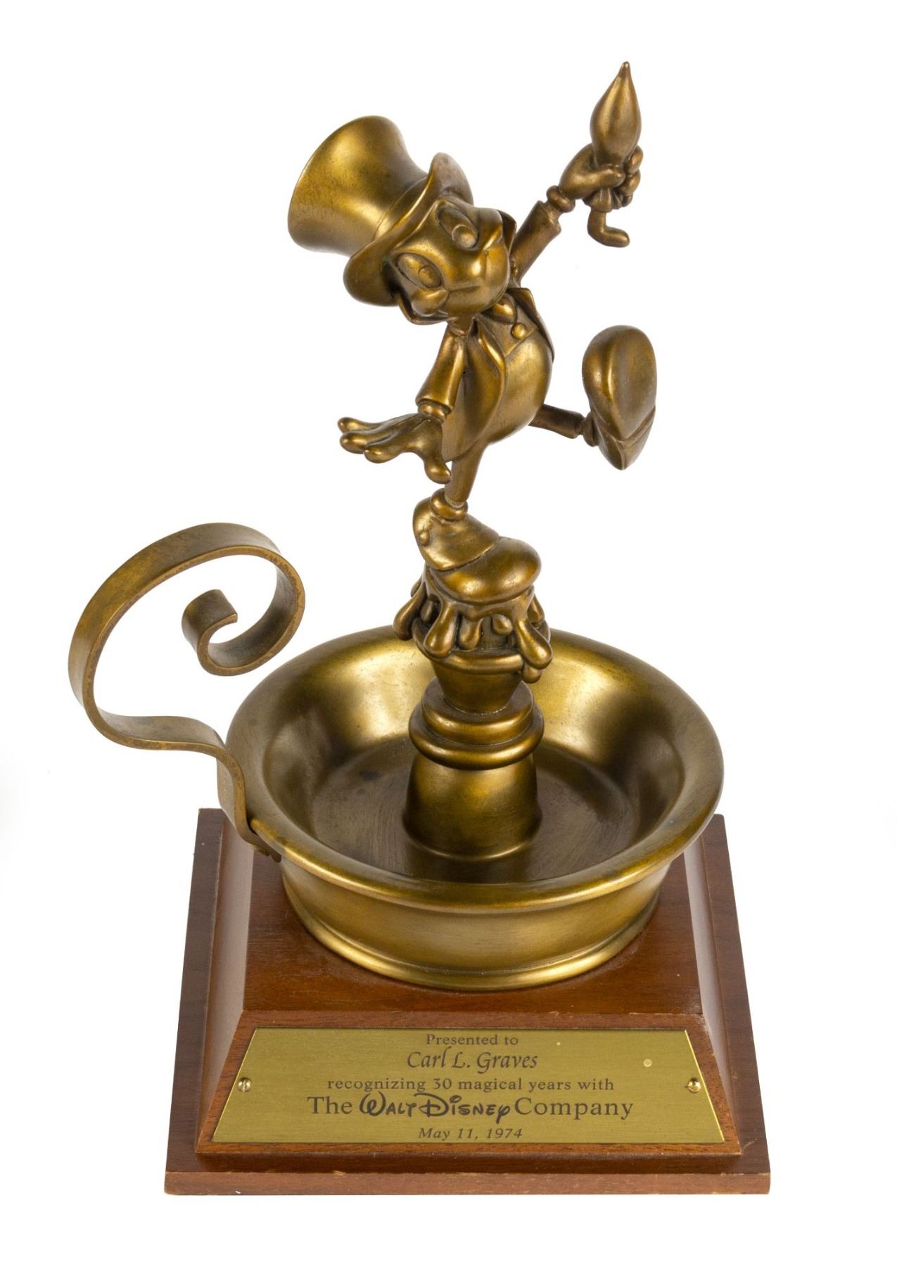 (Walt Disney Studios, 2004) A beautiful bronze statue of Jiminy Cricket, given to Carl L. Graves in recognition of 30 years with The Walt Disney Company. Measuring 11" tall on the 6.5"x6.5" wooden base, the award is in very good condition with some minor scuffing from display.