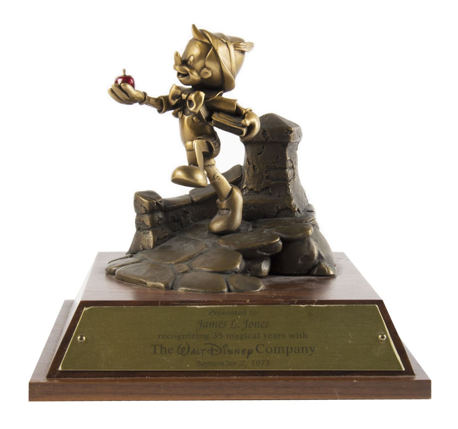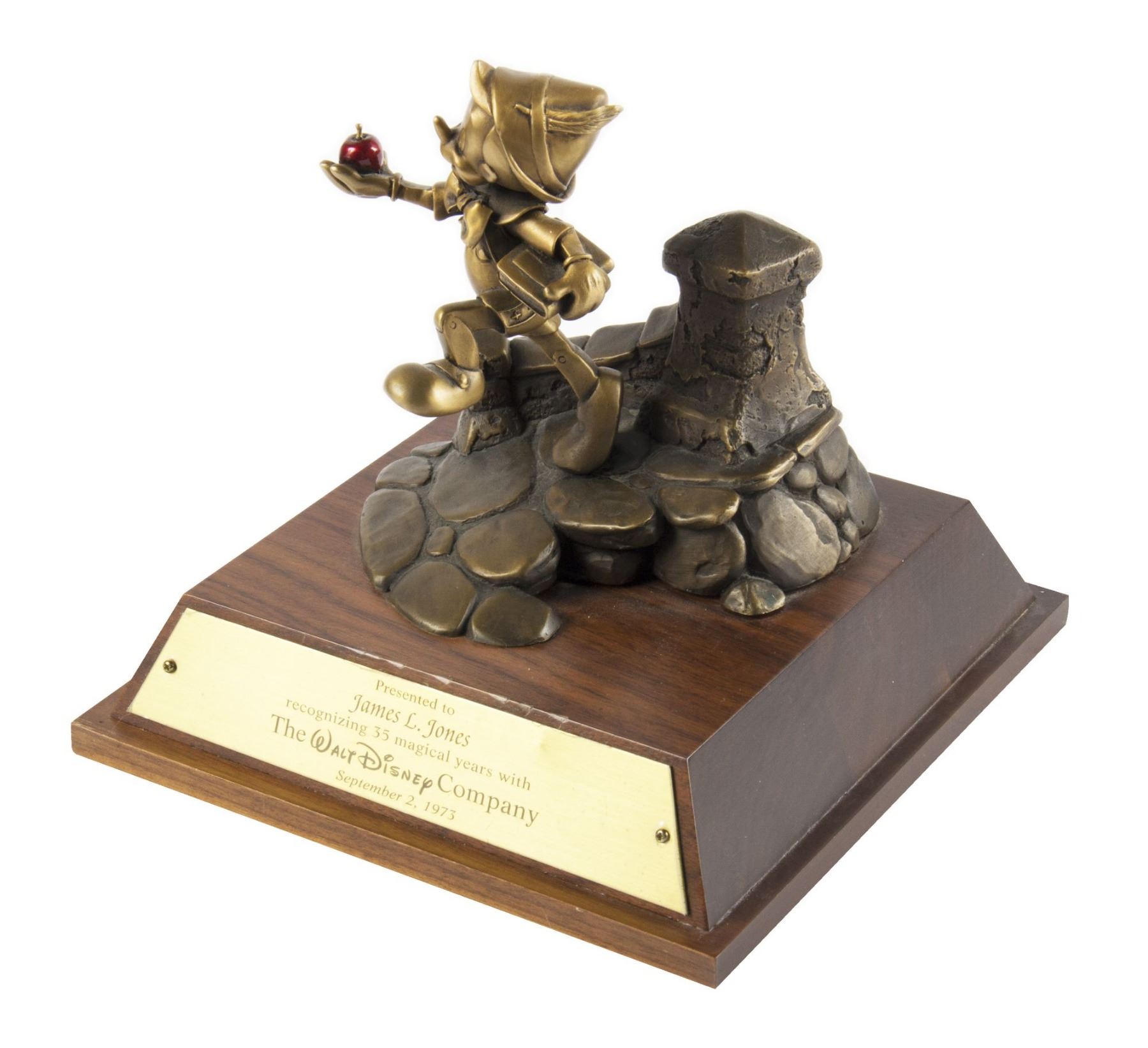 (Walt Disney Studios, 2008) A beautiful bronze statue of Pinocchio, given to James L. Jones in recognition of 35 years with The Walt Disney Company. Measuring 8" tall on the 8.5"x8.5" wooden base, the award is in very good condition with a small chip in the paint on the apple. The base shows some minor scratching and wear around the plaque, which still has its protective cellophane covering.