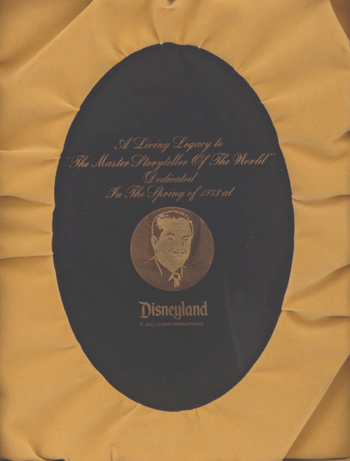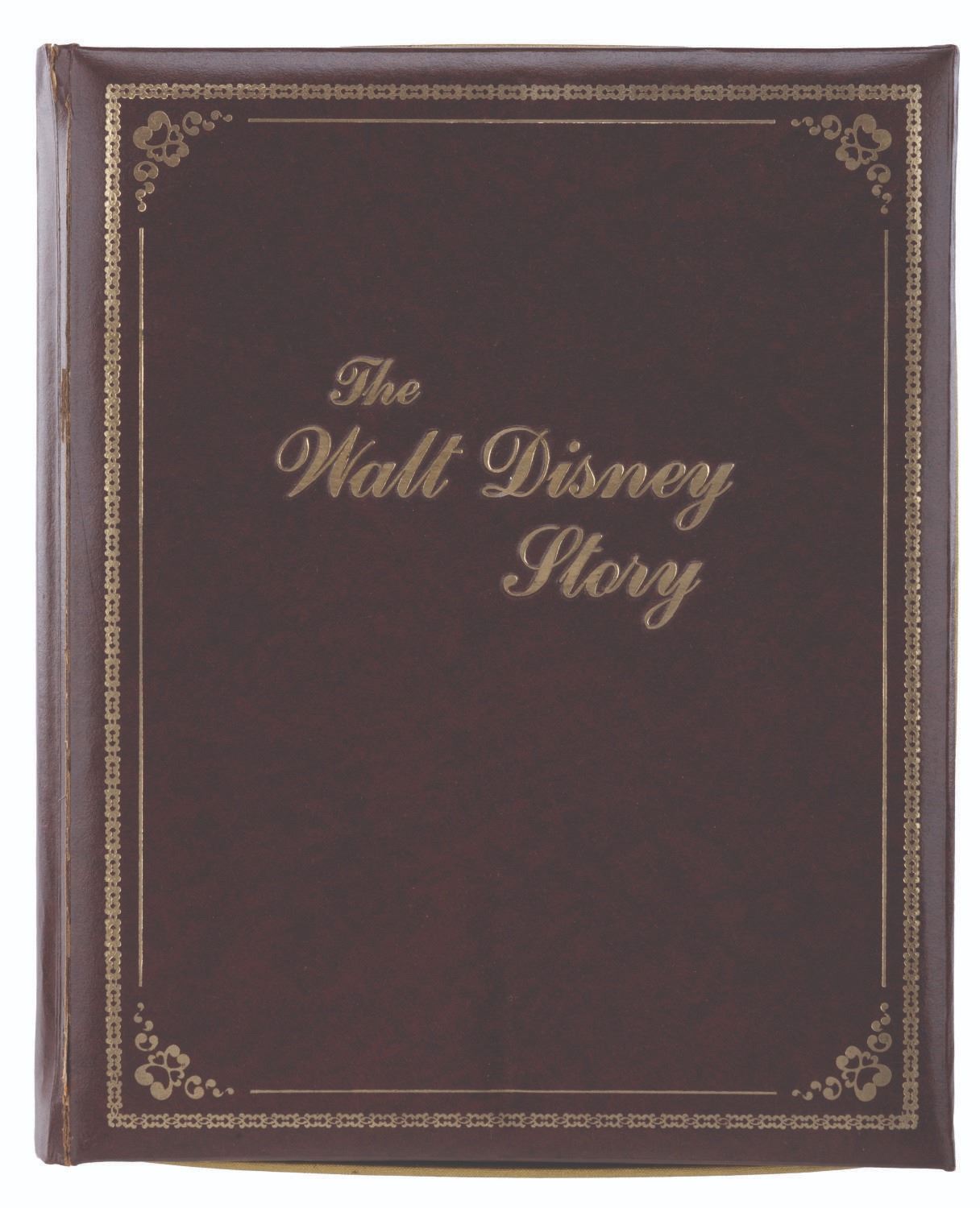 (Disneyland, 1973) A very rare souvenir plaque presented in a faux hardcover book titled "The Walt Disney Story." These plaques were given to VIPs and members of the press during the dedication of "The Walt Disney Story" attraction, which replaced Great Moments With Mr. Lincoln for two years in the Opera House at Disneyland. Measuring 8.5" x 5.75" within its 11.5" x 9.5" and 1.75" thick case, the piece is in very good condition with some wear to the spine of the cover.