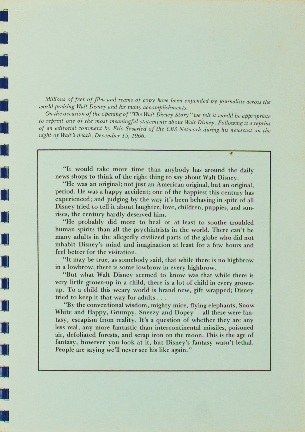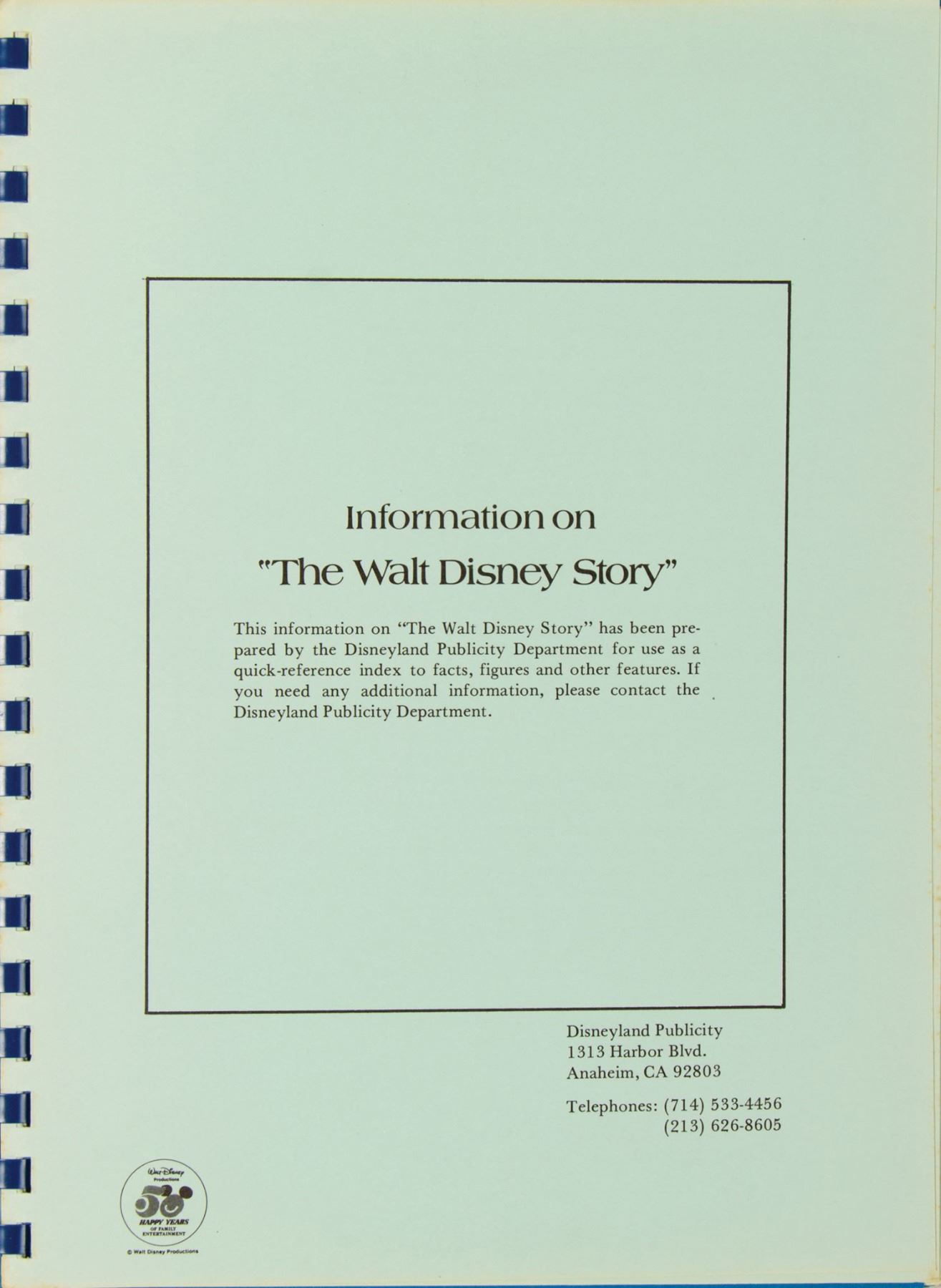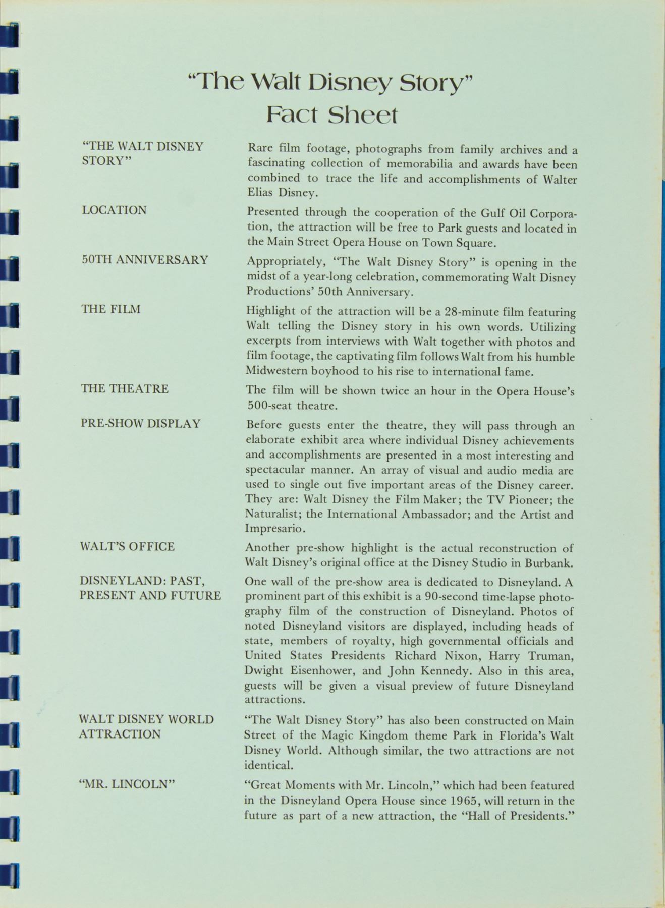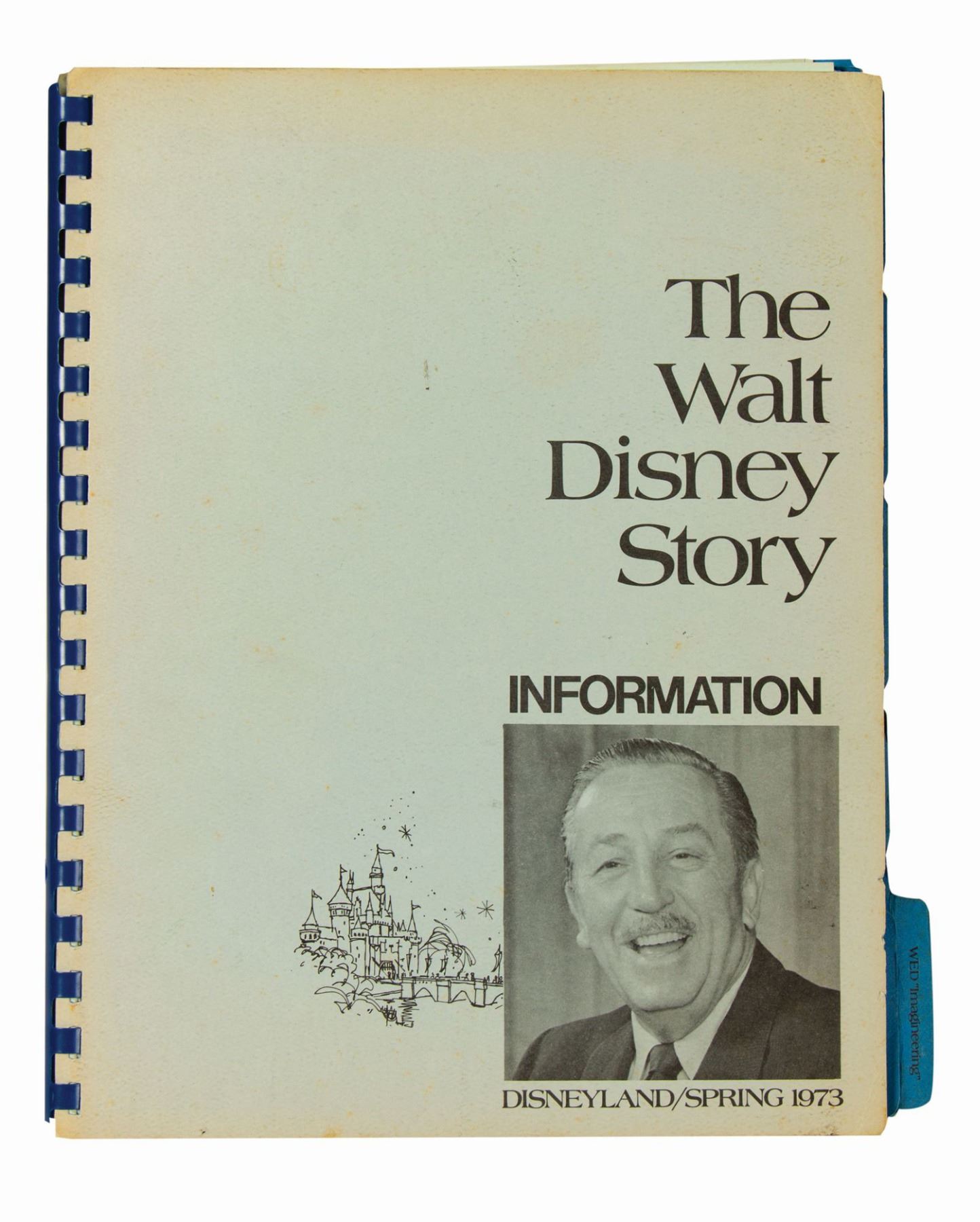 (Disneyland, 1973) A rare spiral-bound press information booklet created by the Disneyland Publicity department for The Walt Disney Story attraction. This information booklet provided a convenient tabbed reference for the content of the attraction, offering attribution for archival material like film clips and images, as well as an overview of many different facets of Walt’s life. The 29-page booklet measures 11”x8.75” and is in good condition. The covers exhibit browning to the edges and there is faint foxing to the reverse of the tab dividers. A former owner’s bookplate label is affixed to the reverse of the front cover.