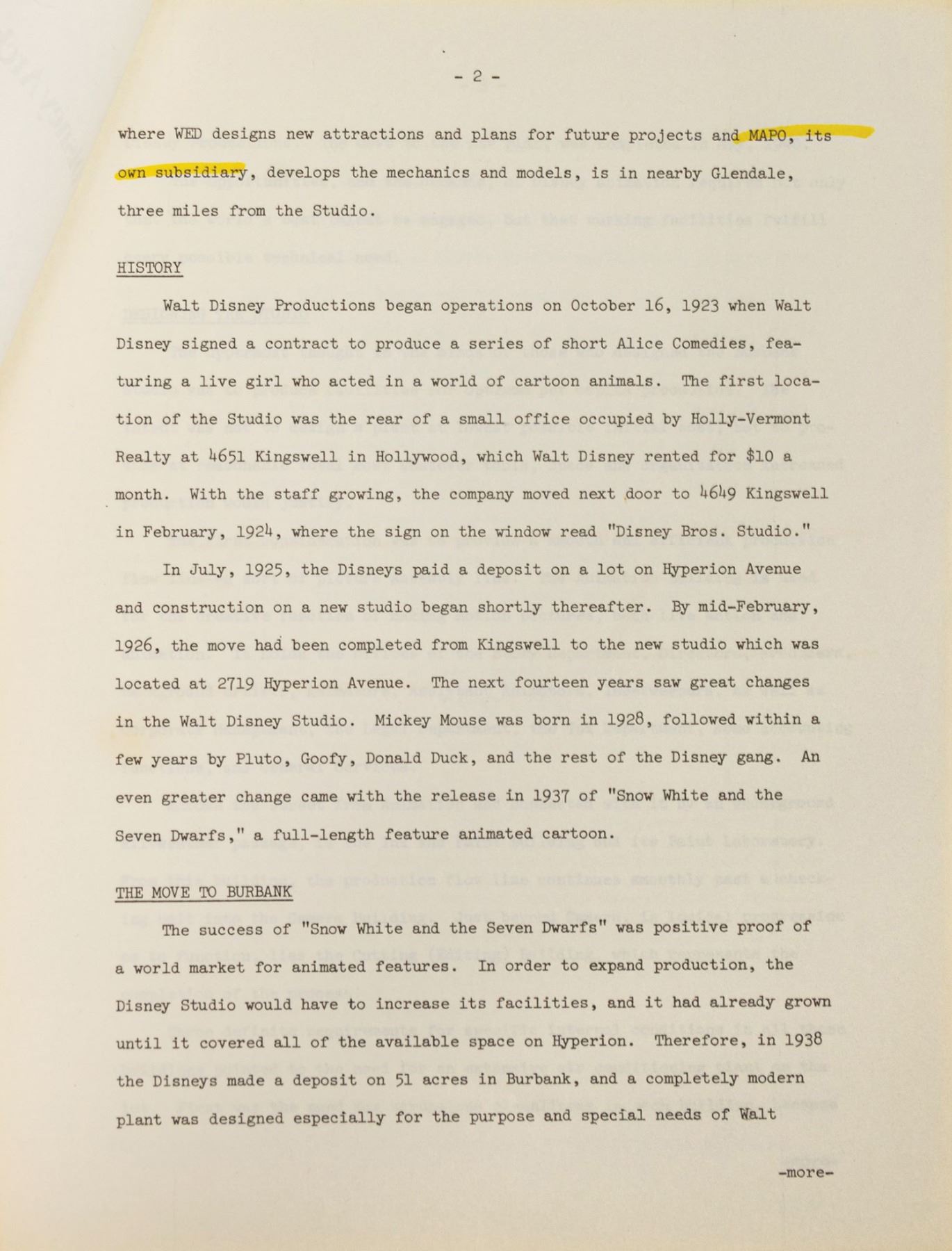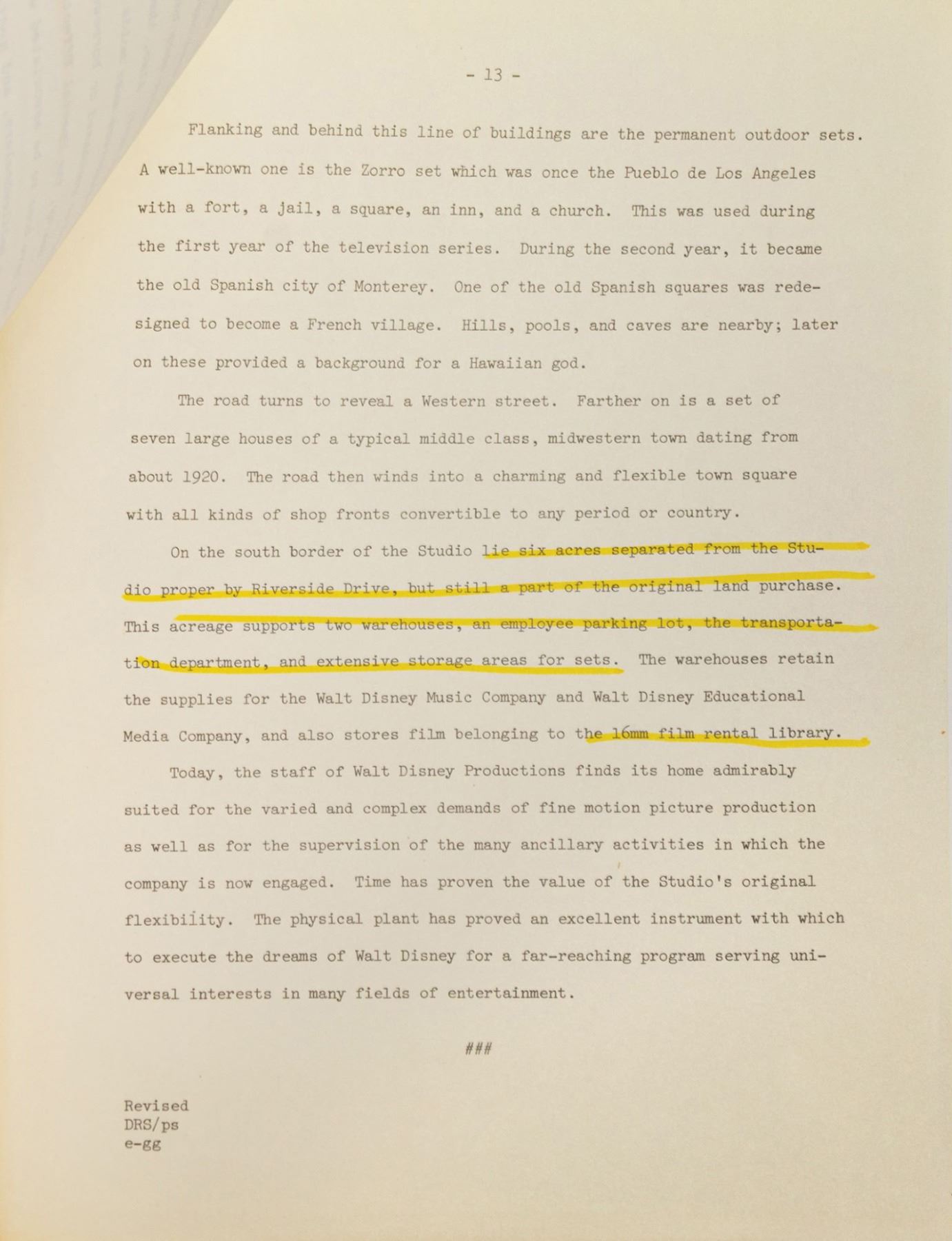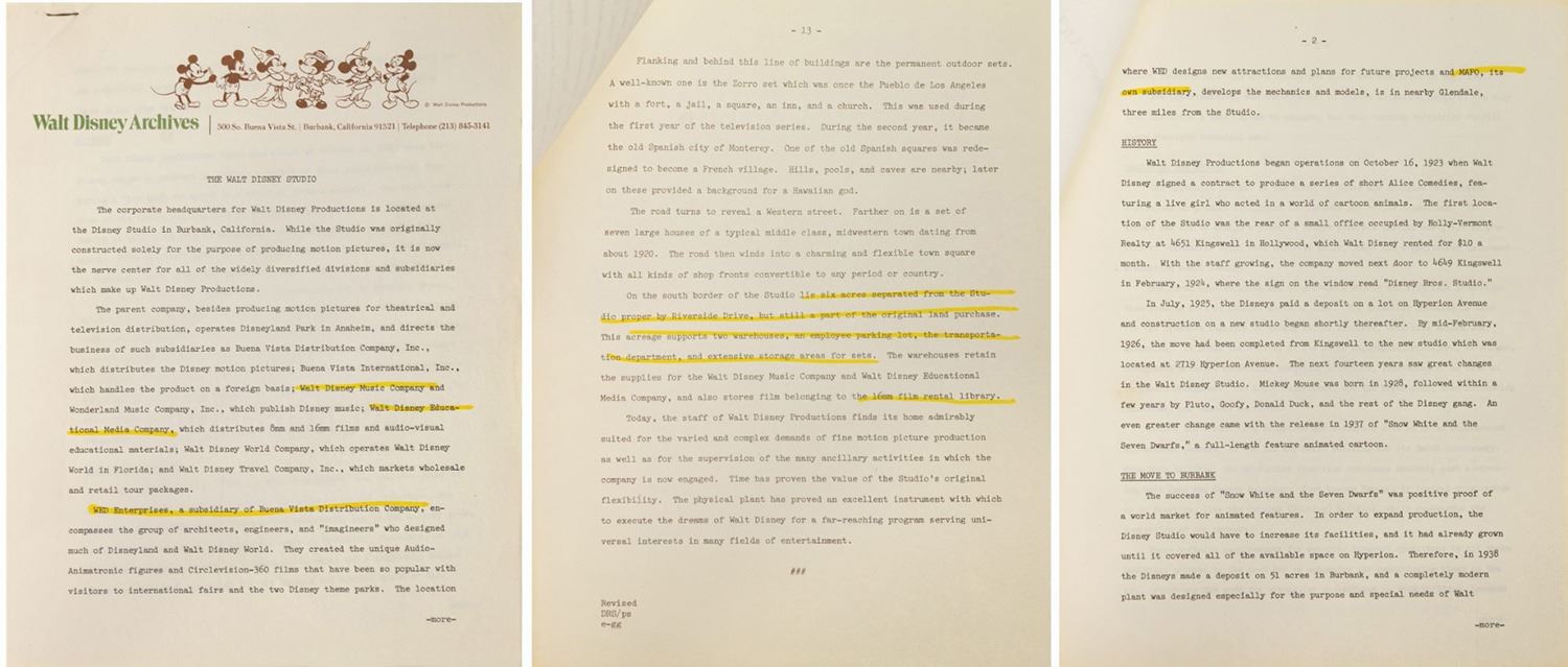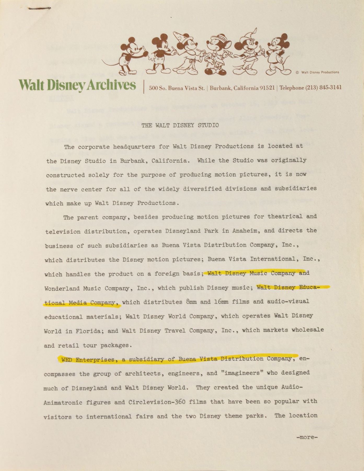 (Disney, c.1980s) A rare Disney archives packet titled "The Walt Disney Studio." This packet goes into detail about the history of Walt Disney Productions and its corporate headquarters. The 13-page packet measures 11"x8.5" and is in good condition with minor wear and some highlighting and notes from original owner.