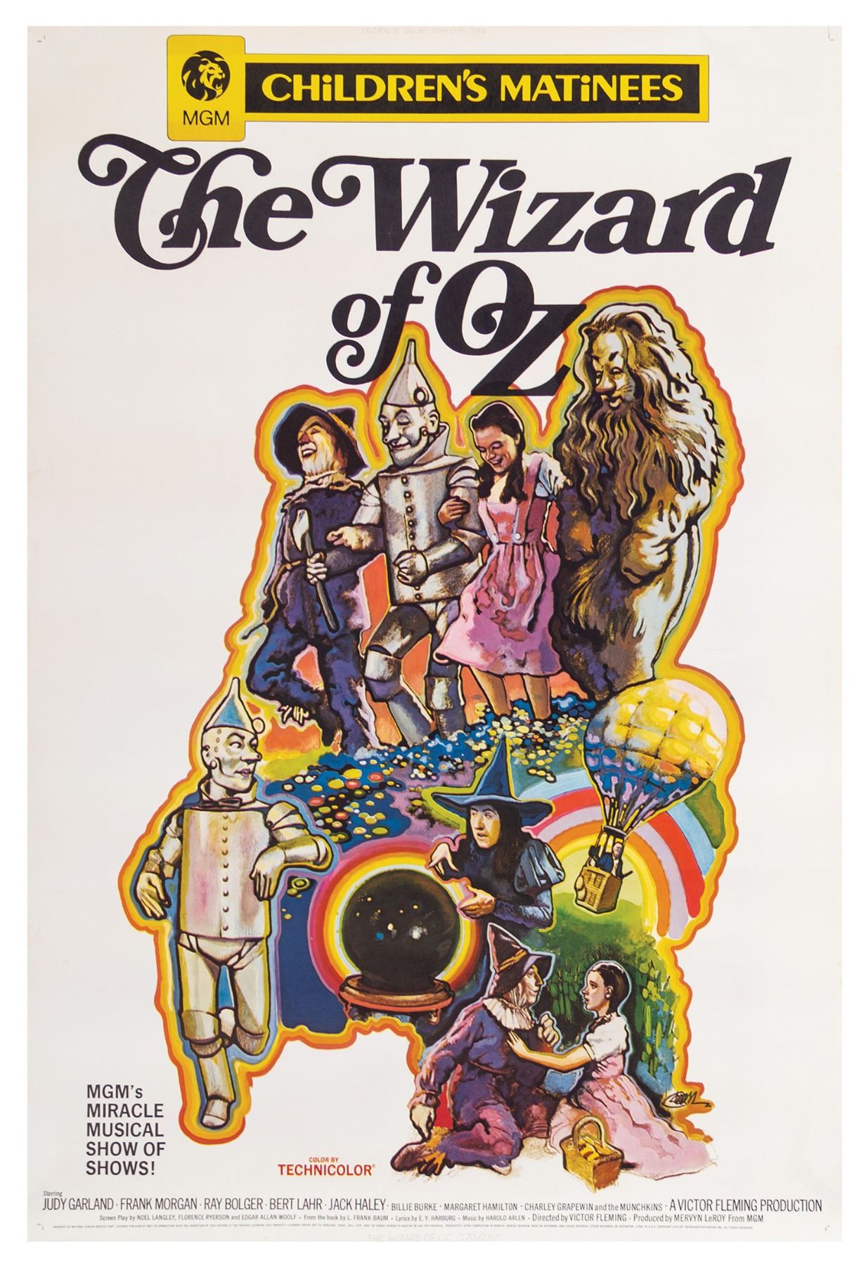 (MGM, c.1970) A very rare 40x60 poster for a theatrical re-release of The Wizard of Oz. This poster was used to promote MGM Children's Matinees, a series of screenings between 1970 and 1972 that attempted to draw in younger audiences through new trailers and targeted advertising. The results were rare specialty posters such as this, often with wonderful unique imagery. The principal case is proudly depicted in this large 40"x60" poster. The condition is in very good with surface wear and minor discoloration to the edges.