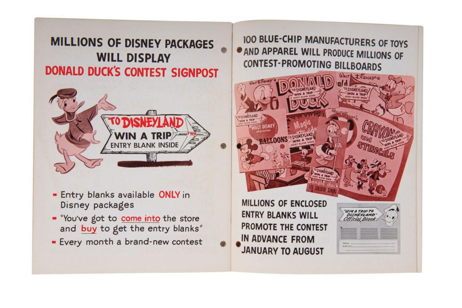 (Disneyland, 1959) A book celebrating Donald Duck's 25th anniversary and accompanying Walt Disney Productions' advertising campaigns involving the timeless Disney Character. The year 1959 was a huge year for Disneyland and Walt Disney Productions, and 1960 would bring even more synergistic cross-pollination between the Studio, the Park, and Corporate Participant sponsors starring "the Duck of the hour." Included are (2) samples of such advertising featuring Donald Duck and "Win a Trip to Disneyland" contests. Measuring 11"x8.5", the rare 16-page marketing brochure is in very good condition, exhibiting minor color toning and edge wear from age. The magazine excerpts measure under 9"x6.5" and are in good condition with minor edge wear and discoloration.