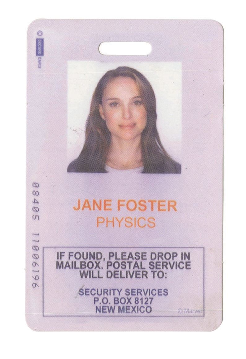 (Marvel, 2011) A prop Culver University ID badge depicting Natalie Portman as Jane Foster from Thor, her first appearance in the Marvel Cinematic Universe. The face of the printed badge features a color character head-and-shoulders portrait of Portman with text, "Jane Foster Physics," and a security disclaimer. On the reverse, it bears the Culver University Science Center logo and text, "Experimental Particle Physics Jane Foster." The badge is notched at the top for attachment of clip or lanyard. A research physicist, Foster first meets Thor when an aurora borealis-like phenomenon she's investigating turns out to be the Bifrost. Through her encounters with the Asgardian God, she goes to work for S.H.I.E.L.D. and becomes enmeshed in the events of the broader MCU. Measuring 3.5"x2.25", the card is in very fine condition, showing only minimal production wear.