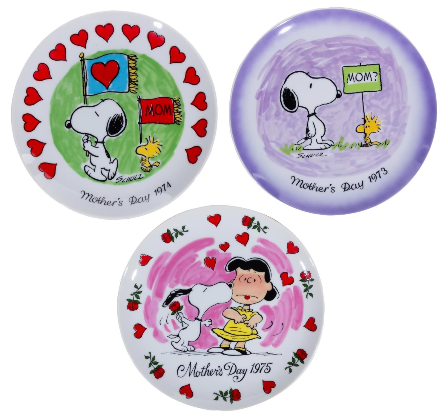 (Schmid, 1973-75) Three Peanuts decorative plates celebrating Mother's Day 1973, 1974, and 1975, and featuring Snoopy, Woodstock, and Lucy. Each measuring 7.5 " in diameter, the plates are in fine condition. The original boxes are in fair condition, with the 1974 box in poor condition with damage to the lid.