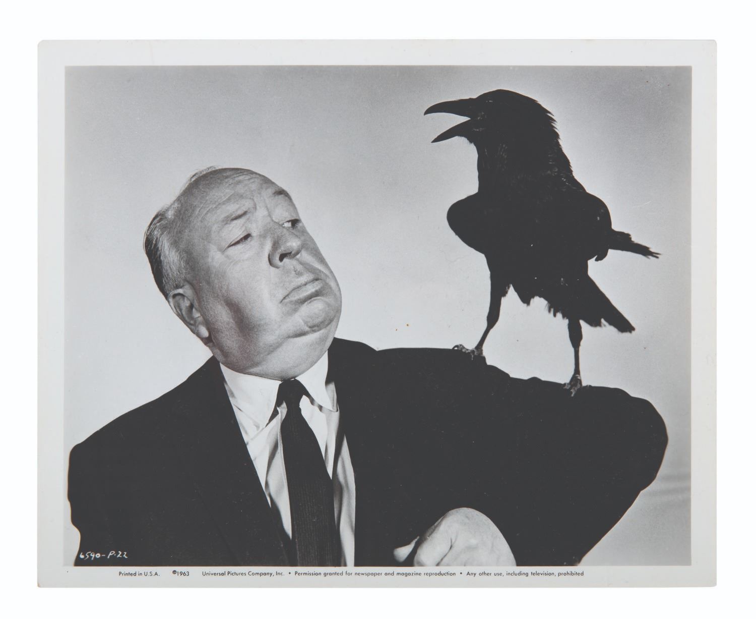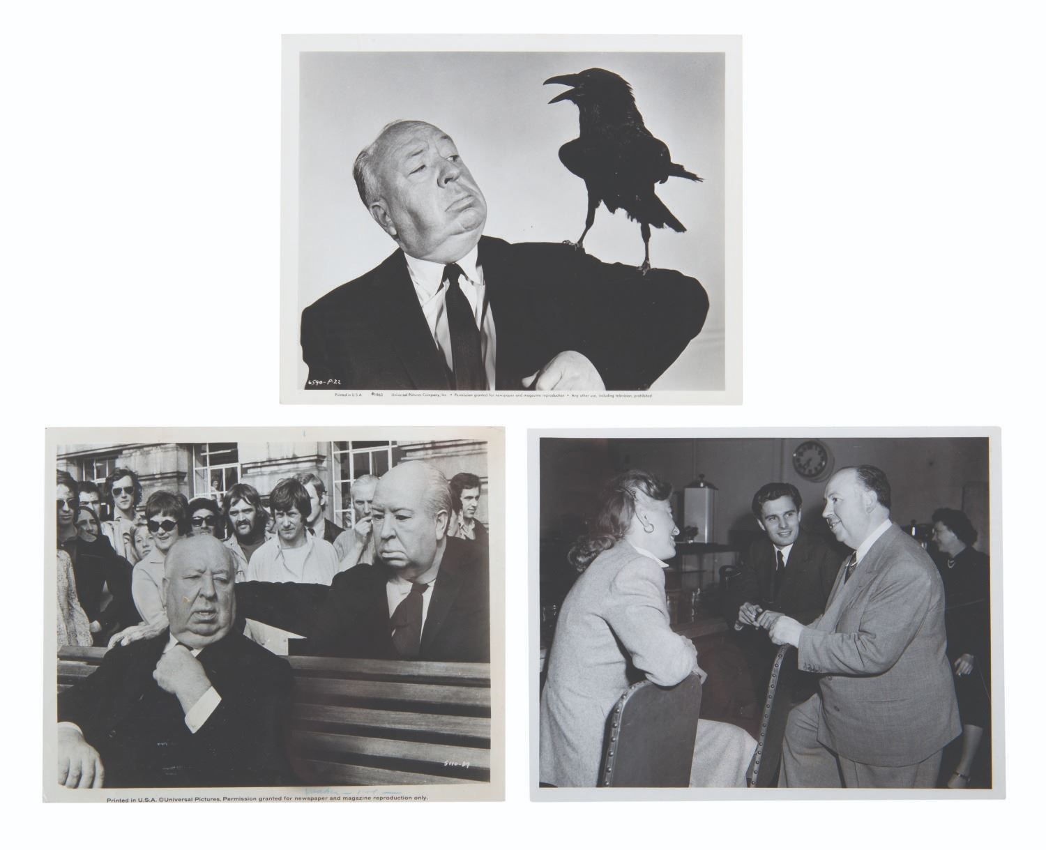 (Universal, 1956-72) Three publicity photos of Alfred Hitchcock for his films, "The Wrong Man,” "The Birds,” and "Frenzy.” Measuring 8” x 10.25”, the photos are in good to very good condition with light edge wear and creasing, a pen inscription on one, and adhesive residue on the "Frenzy” photo.
