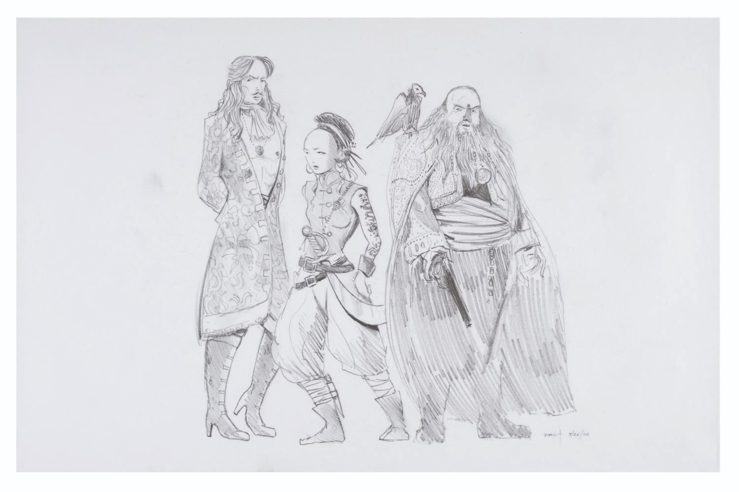 (Disney, 2006) Three concept drawings of Pirate Lords from “Pirates of the Caribbean: At World’s End" by the film’s conceptual artist, James Byrkit. All nine of the Pirate Lords are represented, including Captain Jack Sparrow, Hector Barbossa, and Elizabeth Swann together on a single page. Accomplished in graphite on vellum and measuring 17” x 11”, the drawings are in fine condition.