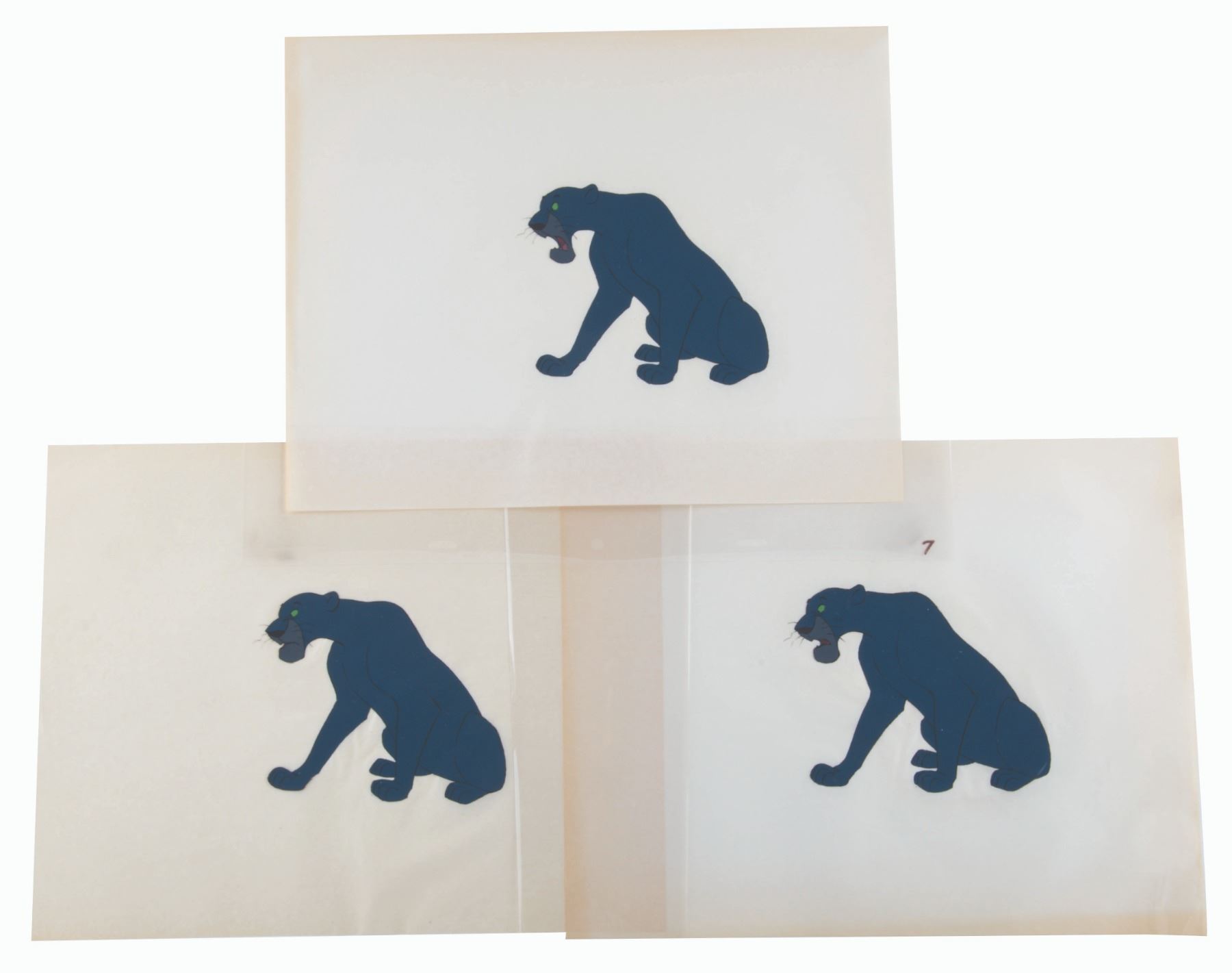 (Disney, 1967) A collection of three Walt Disney's "The Jungle Book" Bagheera production cels. Each cel has a character size of 6" x 5.25" on the 12.75" x 16" cel sheet. The pieces display in very good condition, with painted portions of each cel adhered to the protective wax paper they were stored with.