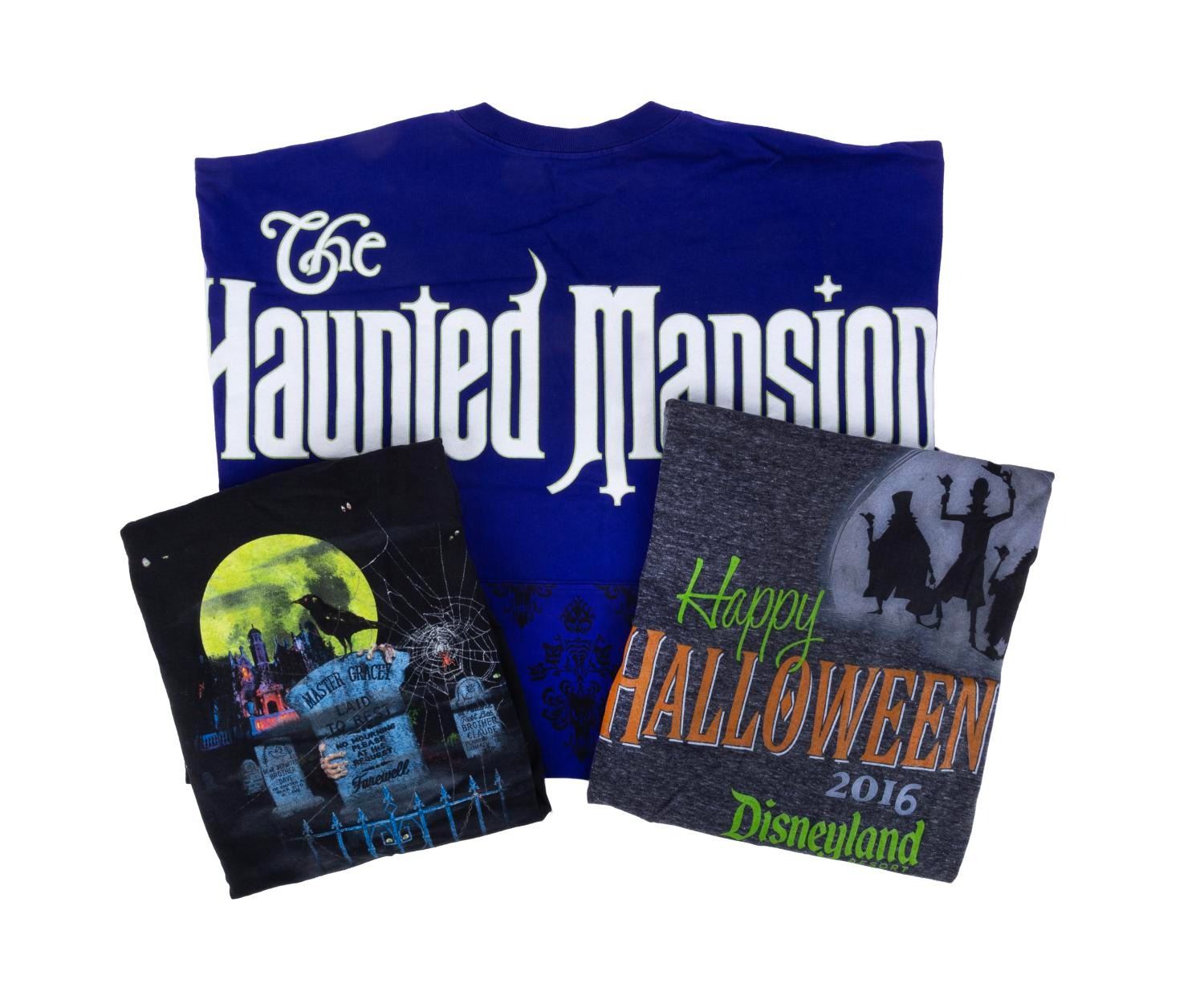 (Disney Parks, 2010s) A collection of three Haunted Mansion shirts, including one 999 Happy Haunts Walt Disney World shirt, a wallpaper motif Spirit Jersey, and a glow-in-the-dark Happy Halloween 2016 Disneyland shirt. The adult-sized L and XL longsleeved shirts are in very good to fine condition with few signs of wear.