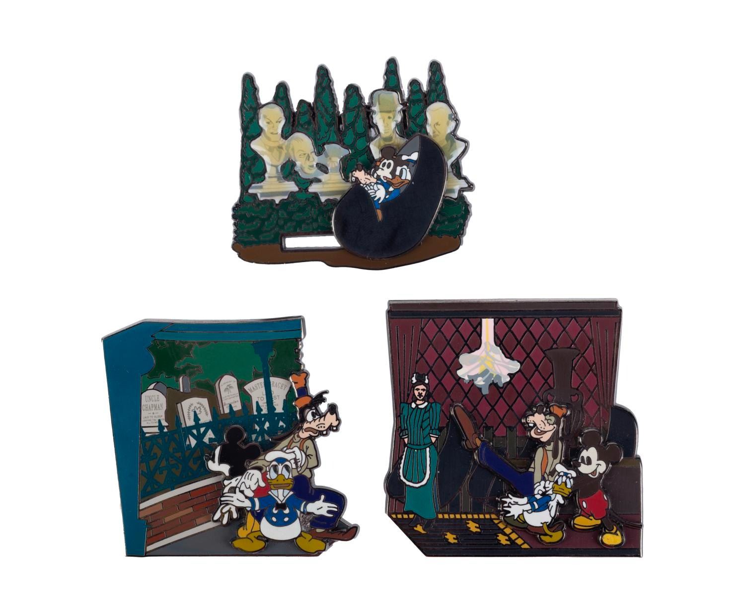 (Disney Parks, 2005) Three Haunted Mansion pins featuring Mickey, Donald, and Goofy exploring the attraction. The pins are each part of a limited edition of 1000 and are in fine condition with few signs of wear.