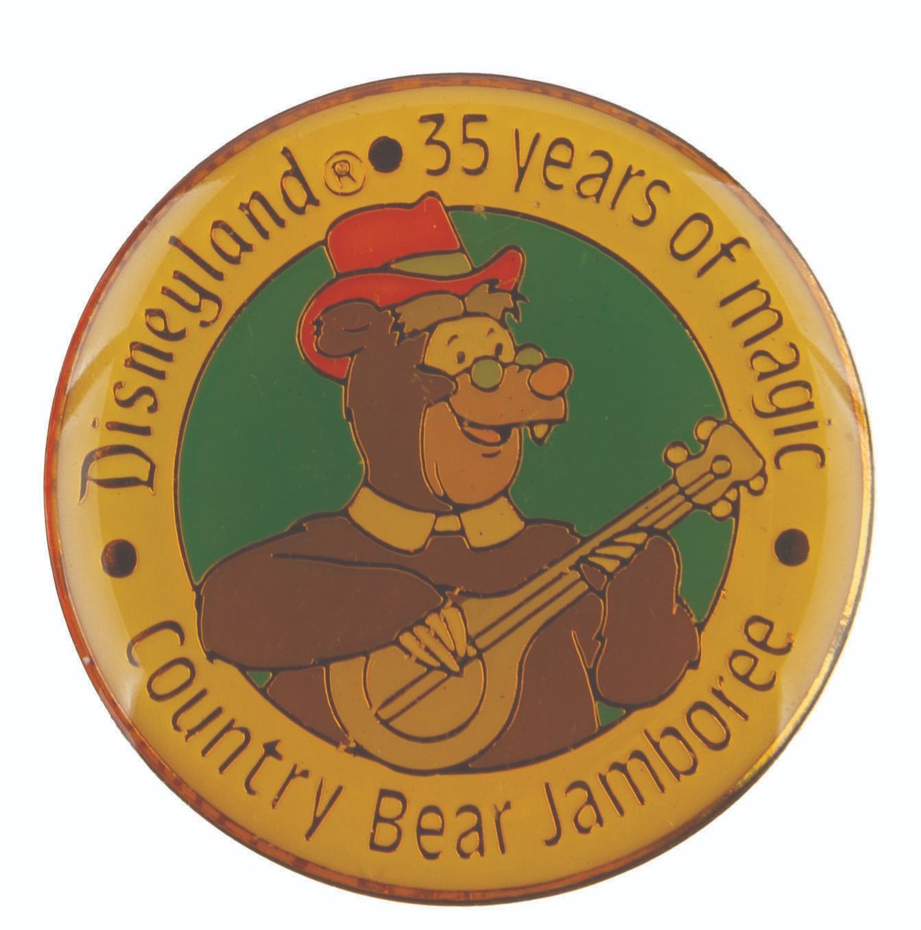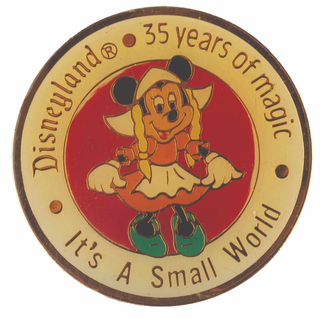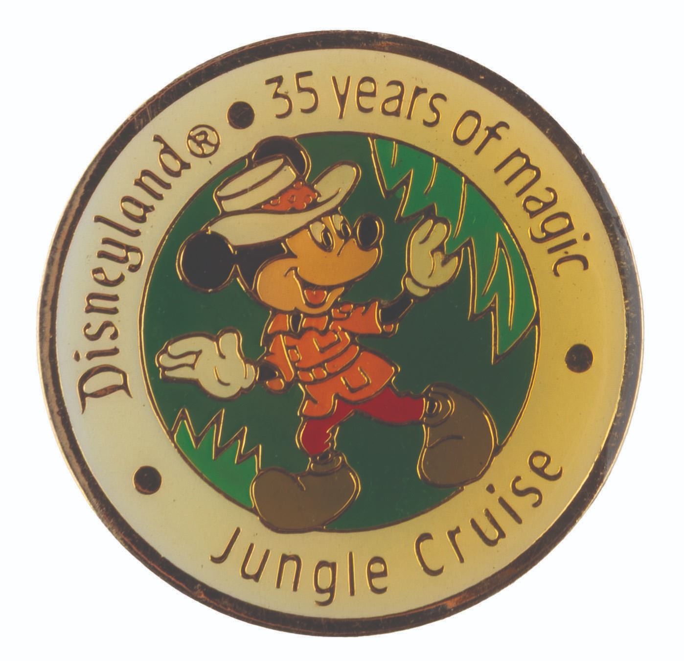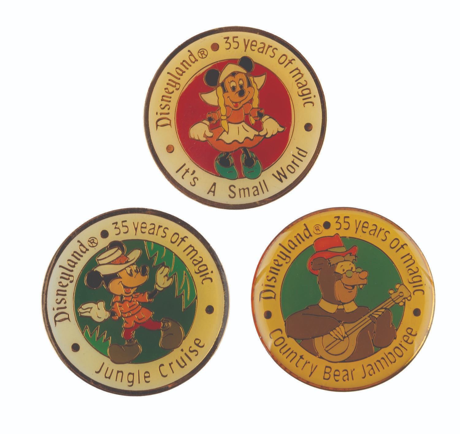 (Disneyland, 1990) Three Disneyland 35 Years of Magic attraction pins with Mickey representing Jungle Cruise, Minnie with It's a Small World, and Wendell for Country Bear Jamboree. The pins were randomly given away to Park Guests for the anniversary. Measuring 1.25” in diameter each, the pins are in very good condition with light discoloration from age.