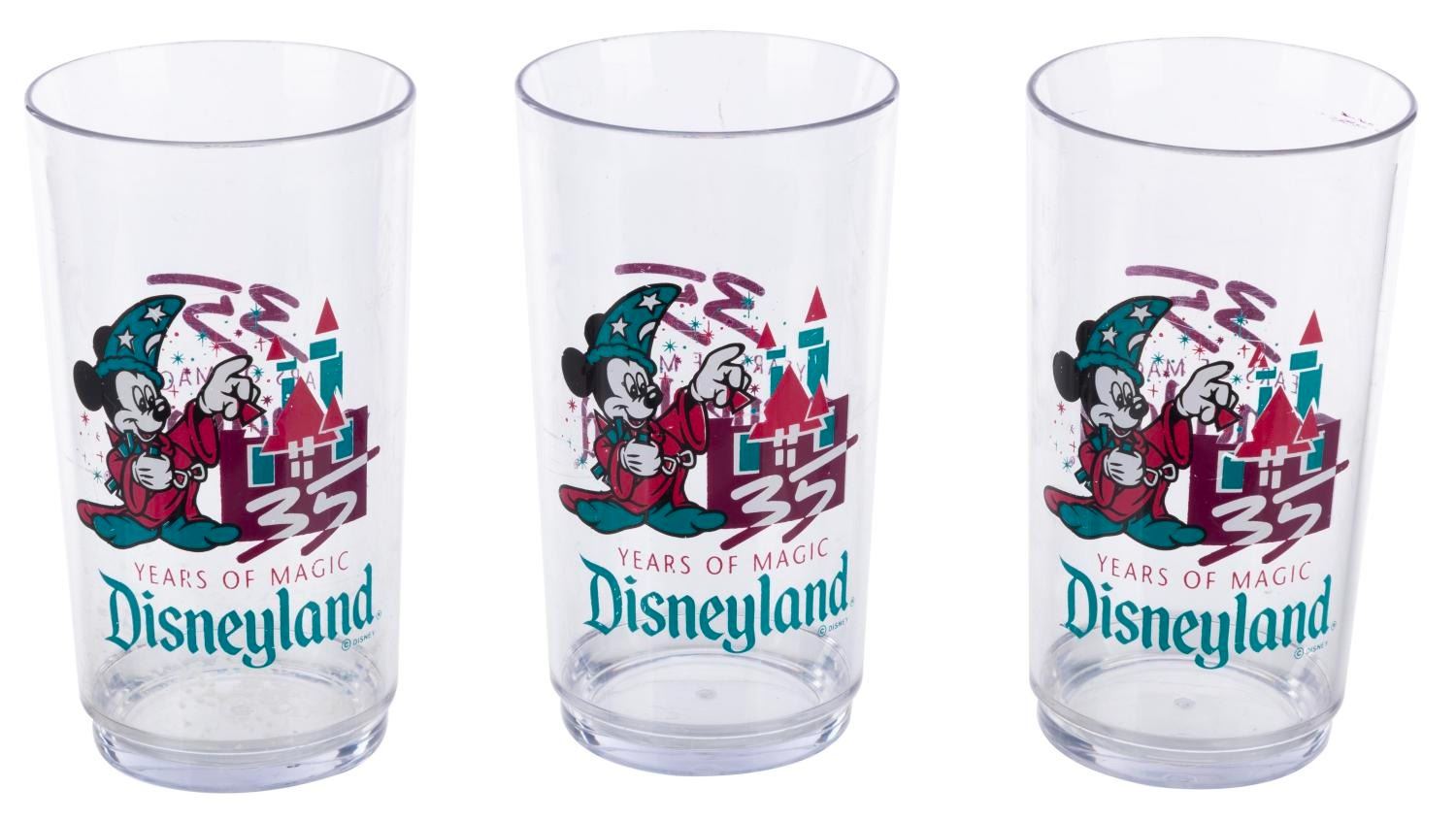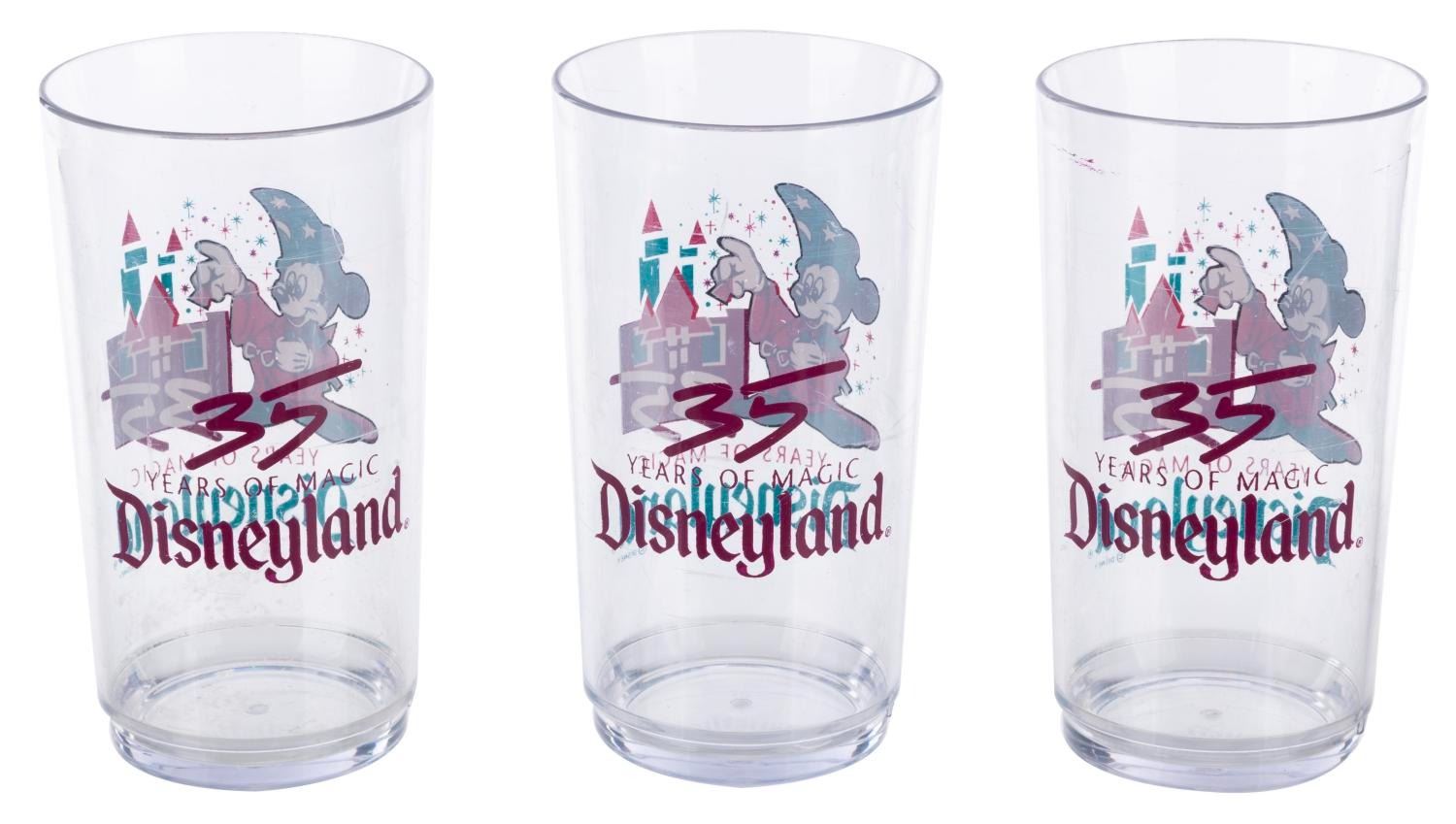 (Disneyland, 1985) Three Disneyland 35th Anniversary glasses featuring Sorcerer Mickey. The plastic glasses measure 2.75” in diameter x 5” tall and display in good to very good condition with light scuffs, wear, and light scratches with paint loss.