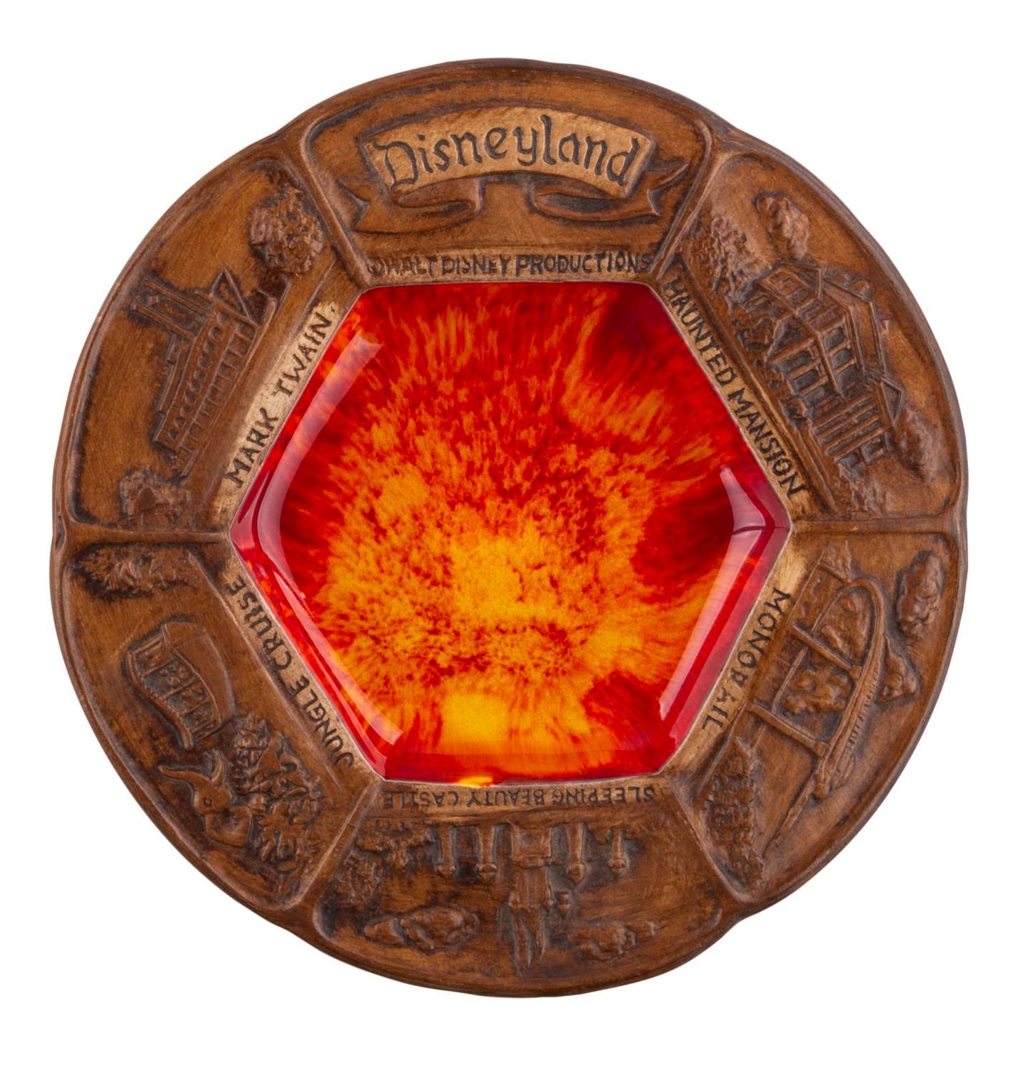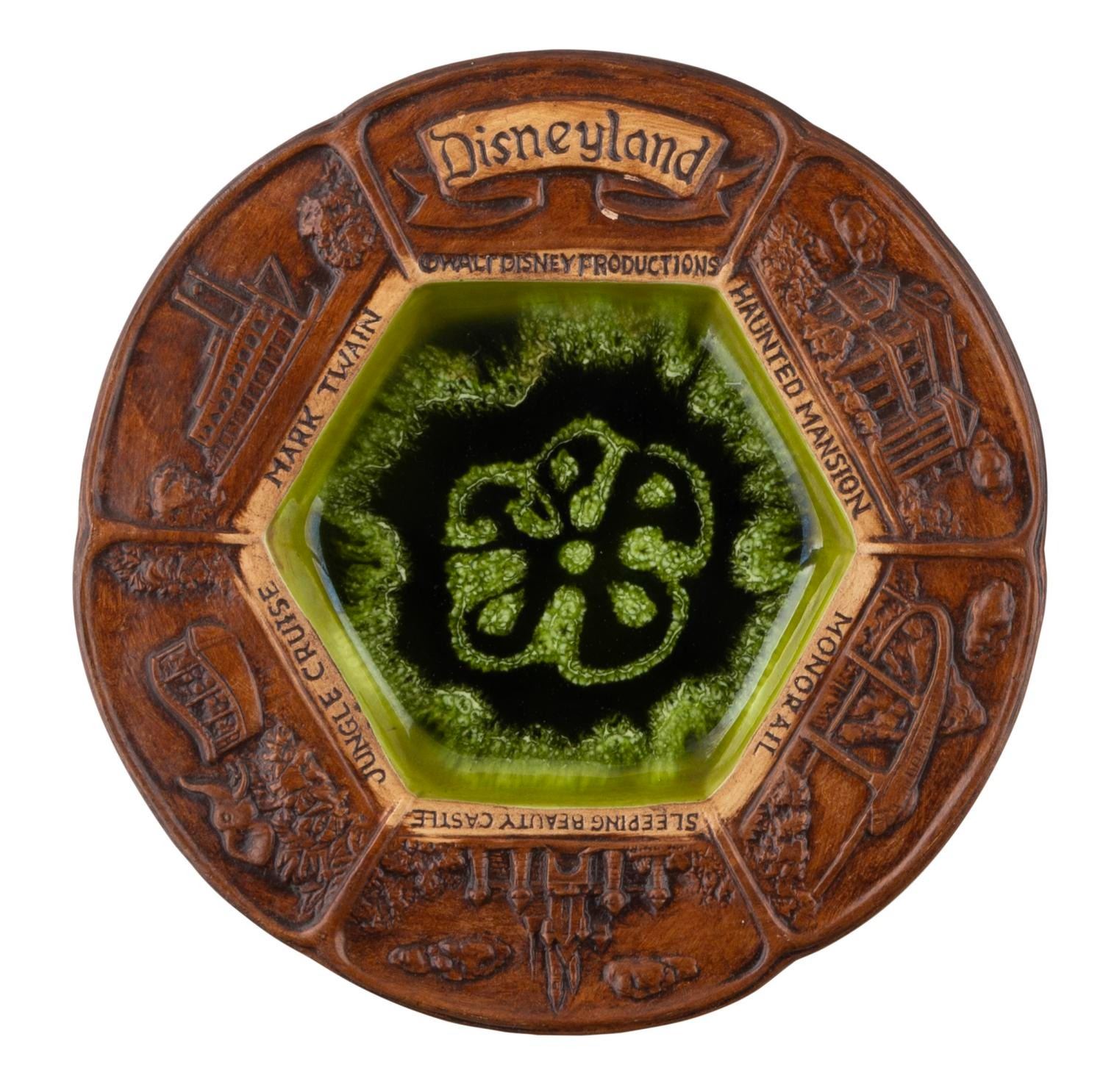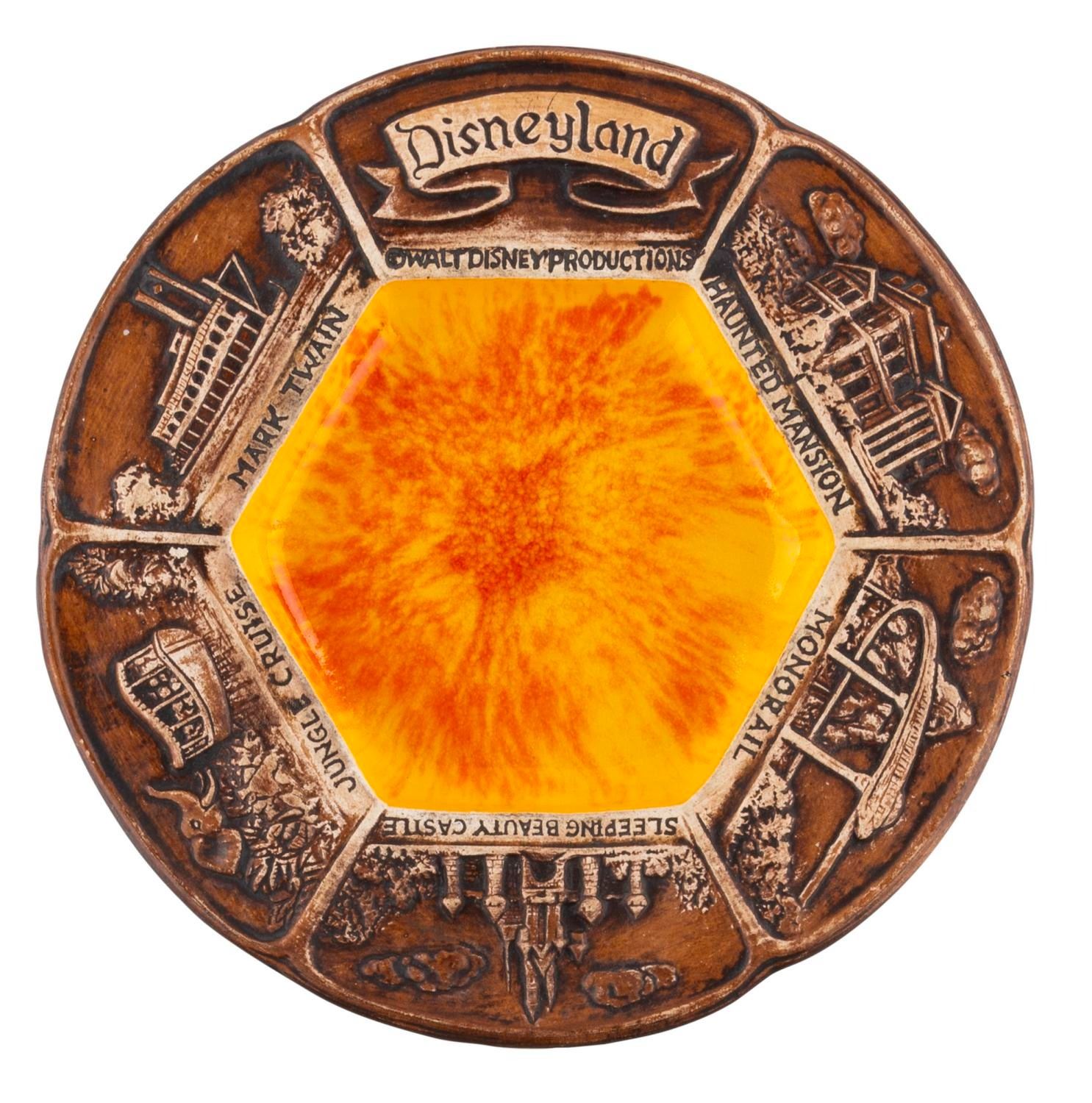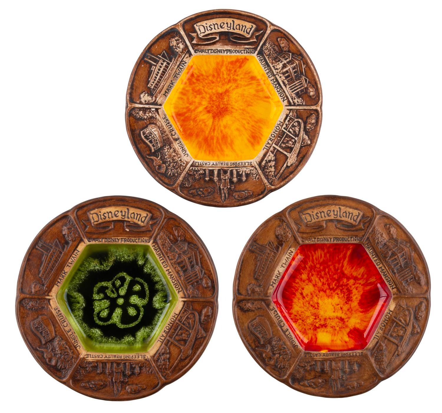 (Treasure Craft, 1970s) Three souvenir Disneyland attraction dishes with Treasure Craft's trademark colorful glazing in the center. Each measuring 8" in diameter, the dishes are in very good condition with very slight edge wear to the yellow dish, and a tiny chip under "Disneyland" on the green dish.